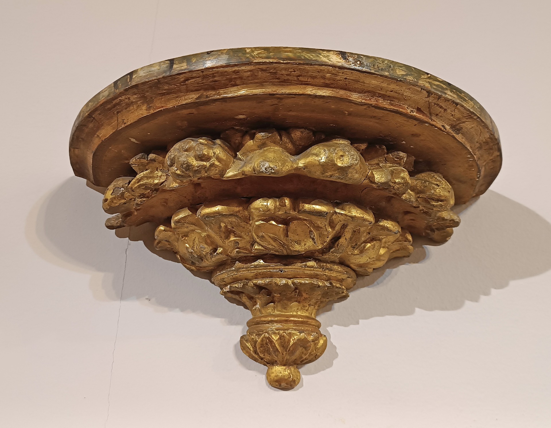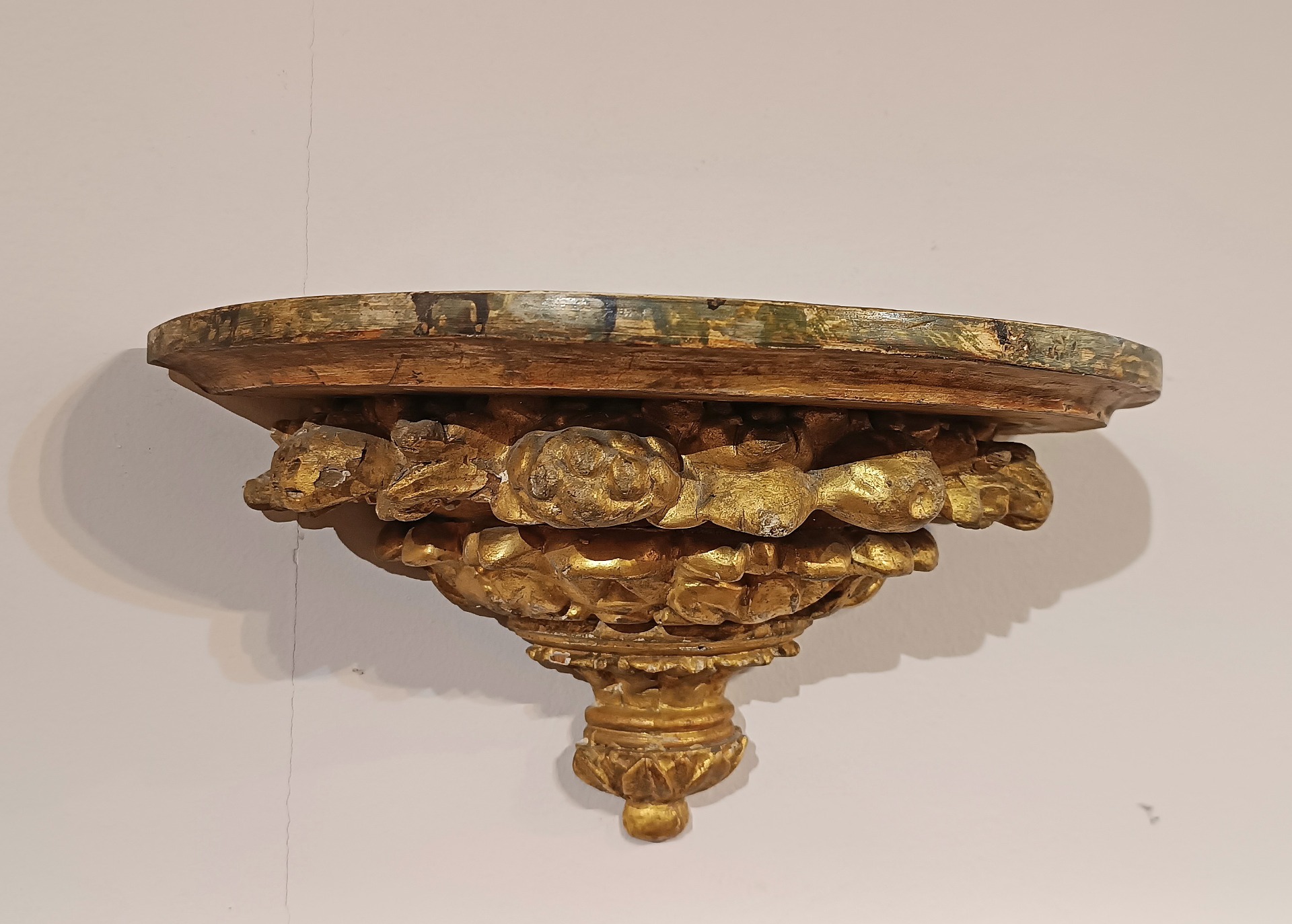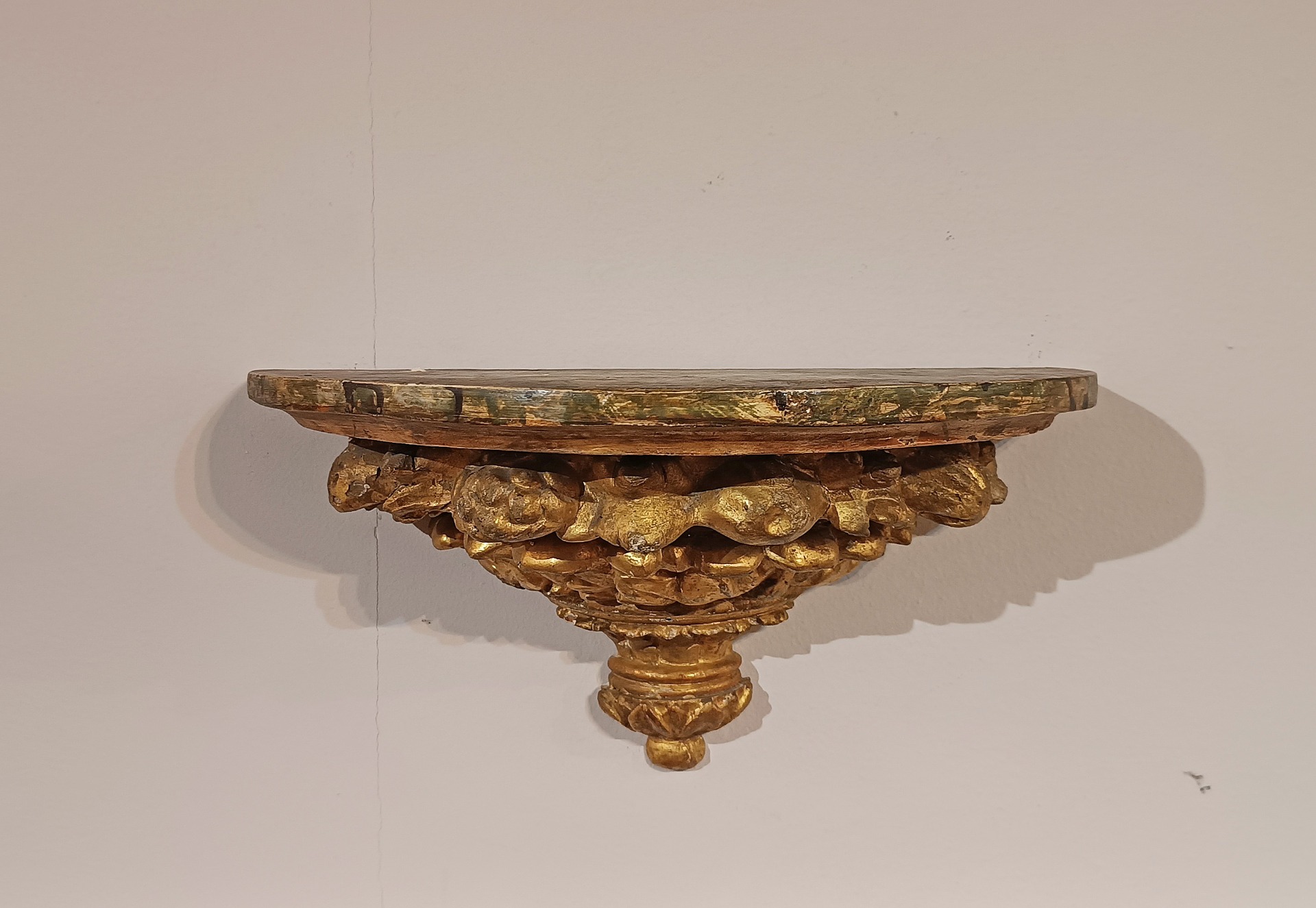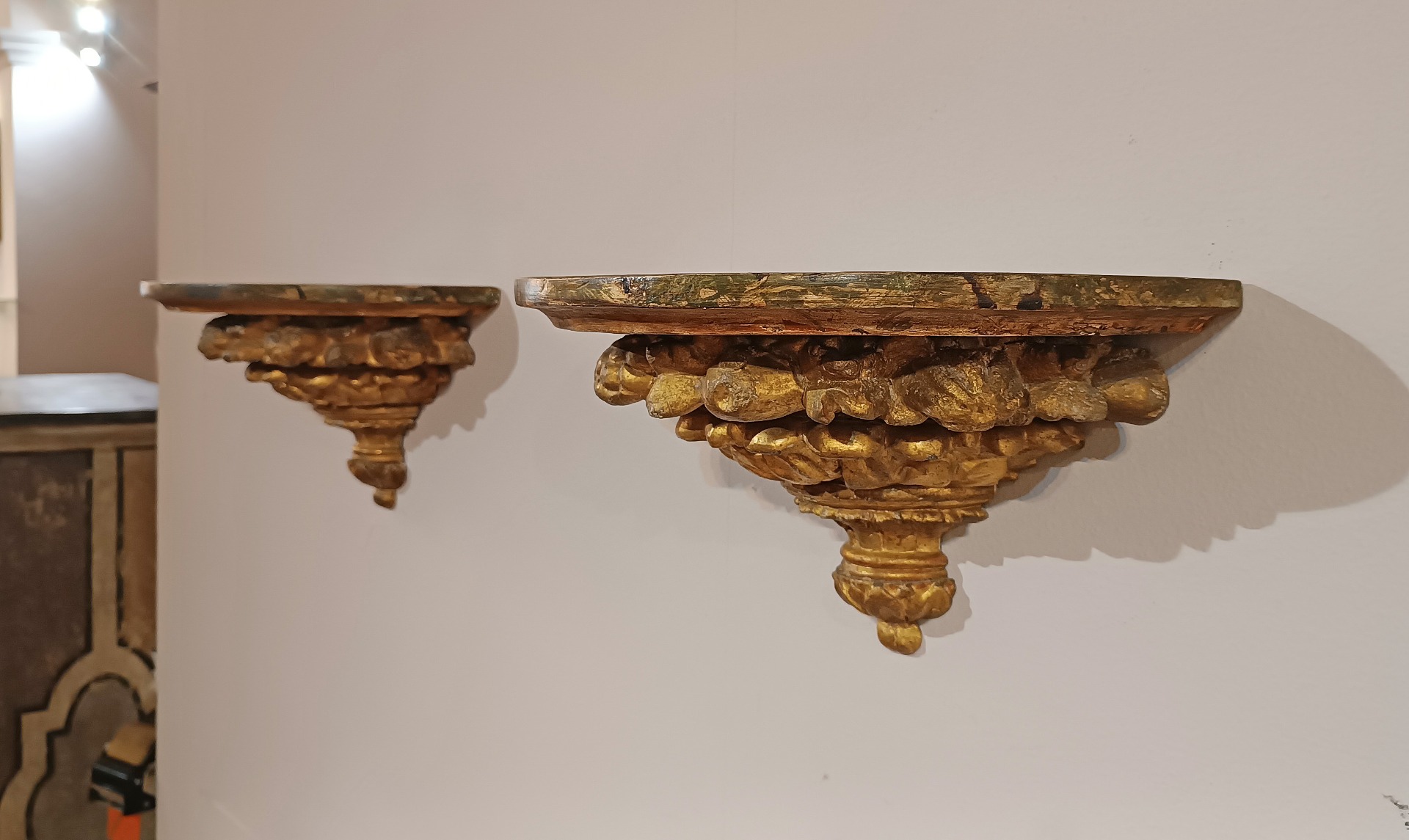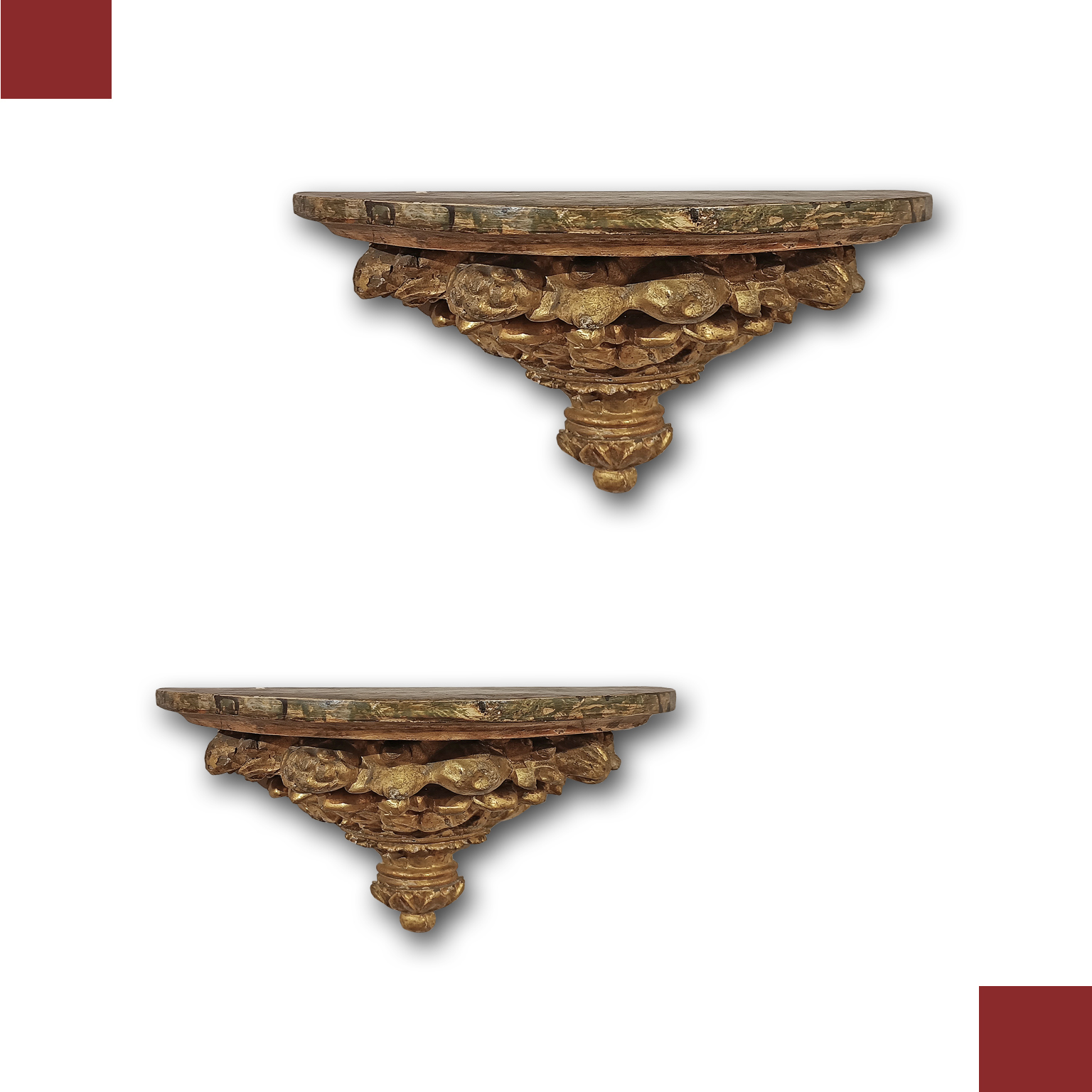 Splendida coppia di mensoline da muro in legno di cirmolo intagliato, dipinto e dorato a foglia d’oro zecchino. La parte inferiore si distingue per raffinati decori intagliati, raffiguranti motivi fitomorfi e geometrici, mentre il piano si presenta aggettante, dipinto ad imitazione del marmo, aggiungendo un tocco di ulteriore eleganza. Queste mensole di grande classe sono in grado di arredare con gusto e raffinatezza qualsiasi ambiente, conferendo un tocco di classe e antichità. Manifattura fiorentina del periodo neoclassico, della fine del XVIII secolo.