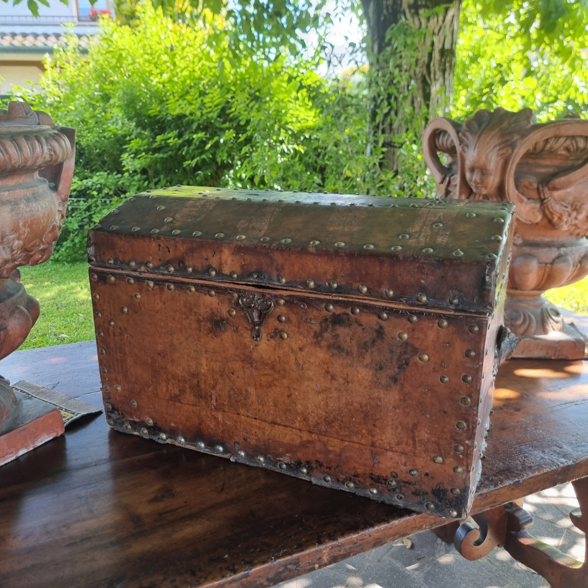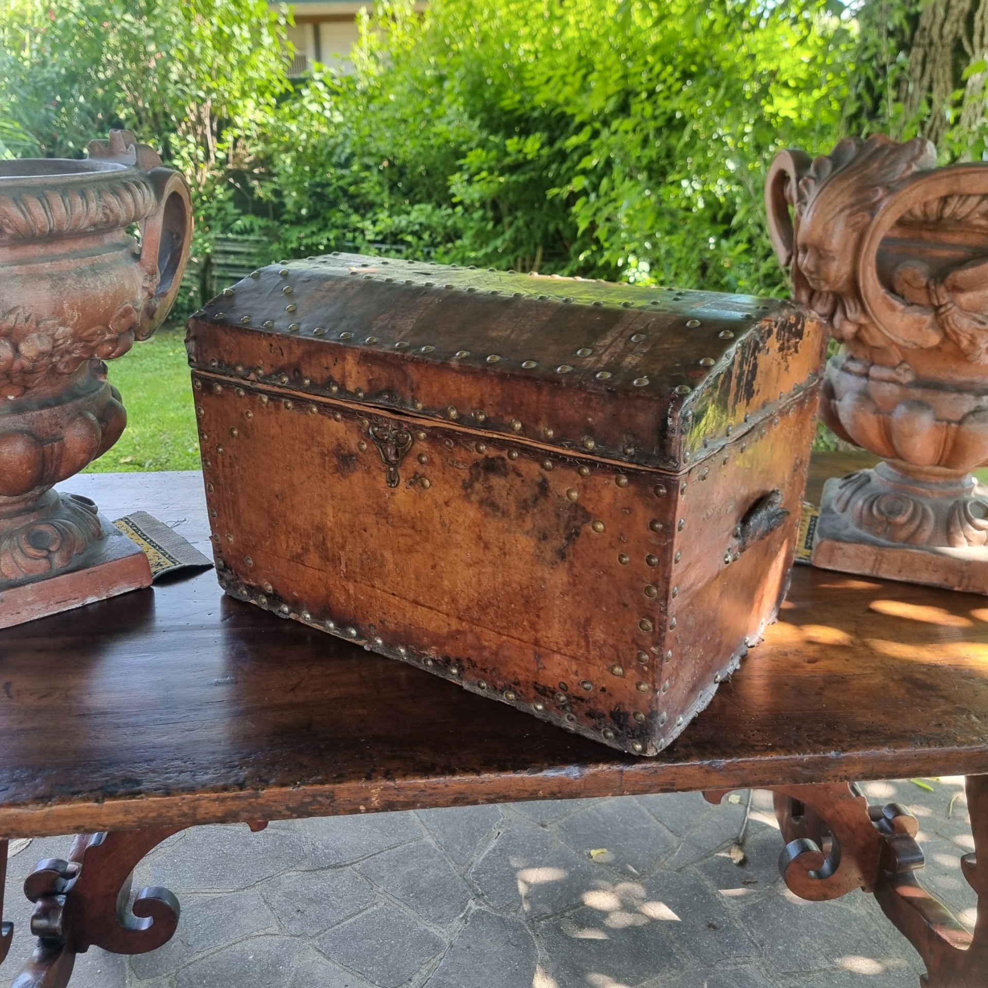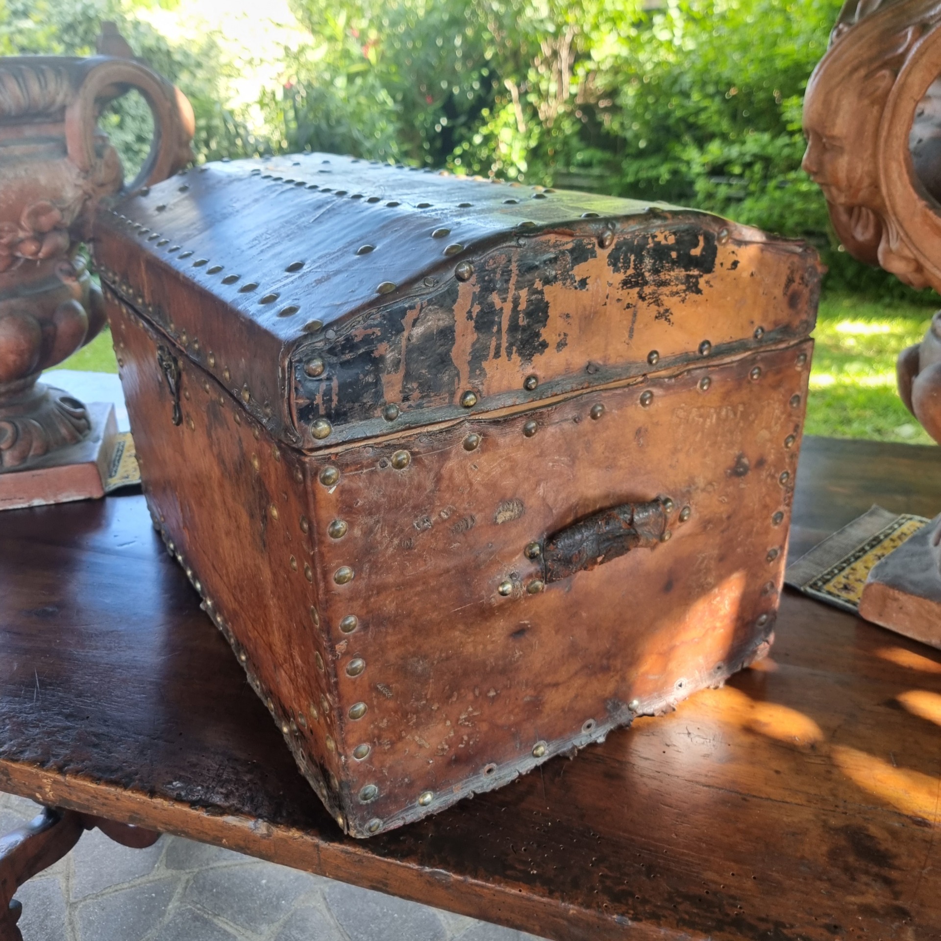 Il bauletto da carrozza del 600 in pelle con borchie rappresenta un pezzo di storia intramontabile. Utilizzato nei secoli passati come bagagliaio sulle carrozze, oggi aggiunge un tocco di fascino vintage a qualsiasi ambiente.