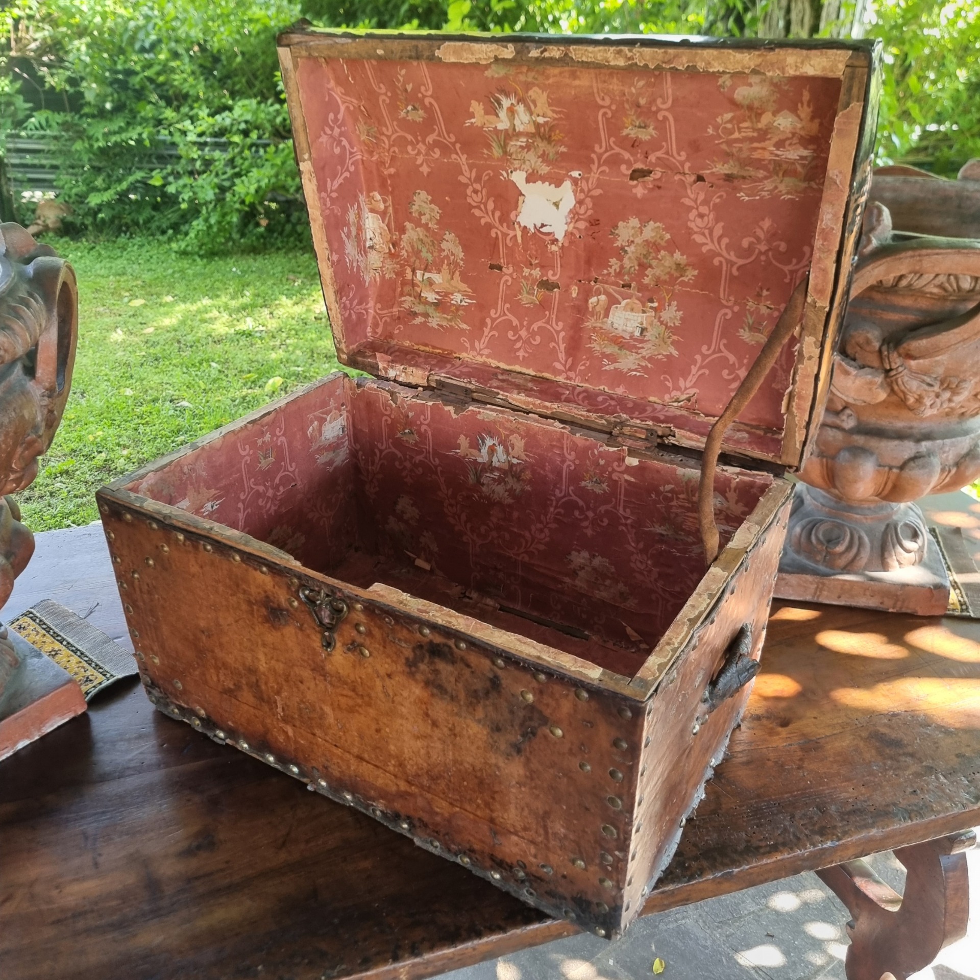 Nonostante le sue usure del tempo, questo bauletto è ancora in buone condizioni generali, con una patina che ne esalta il fascino antico. Le leggere imperfezioni sono una testimonianza del suo lungo viaggio nel tempo, aggiungendo un senso di autenticità e storia.