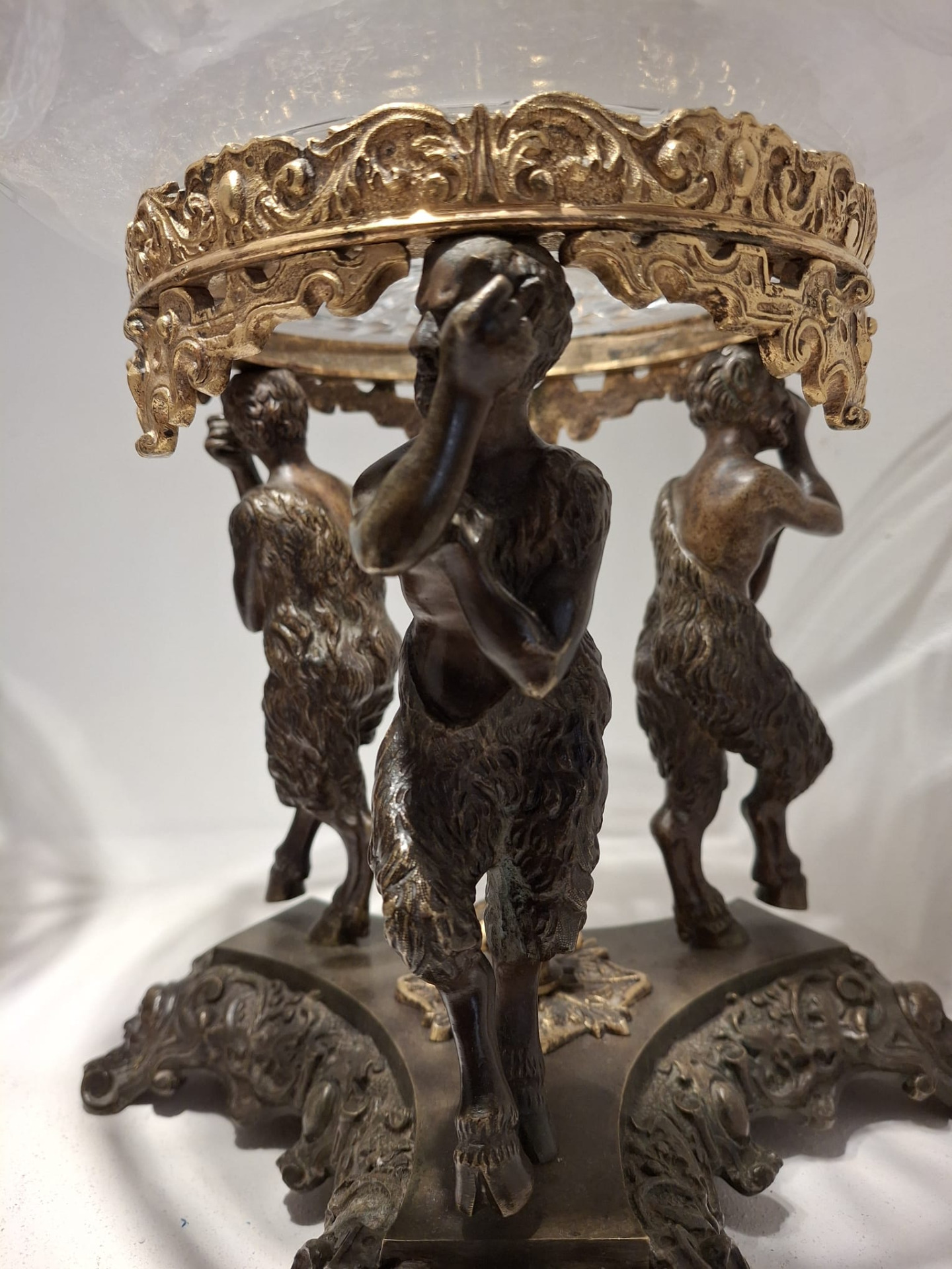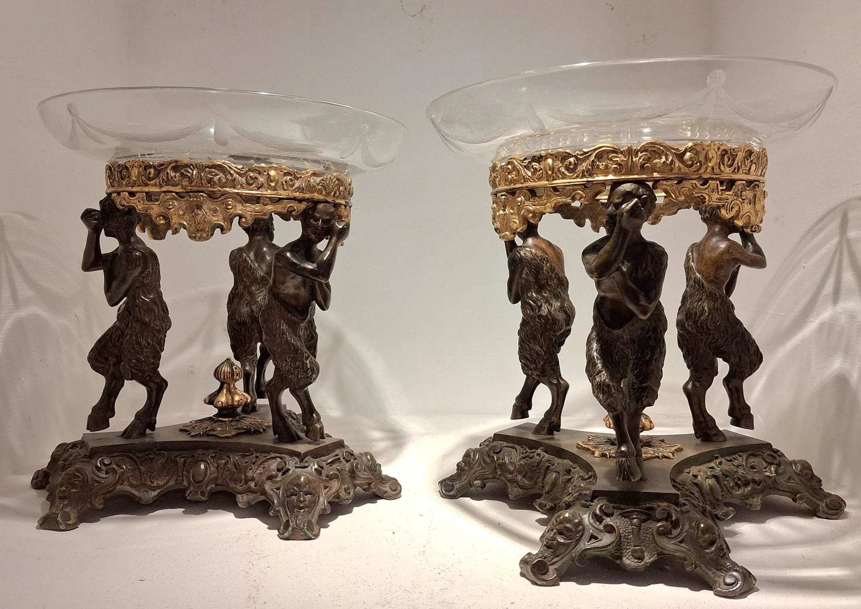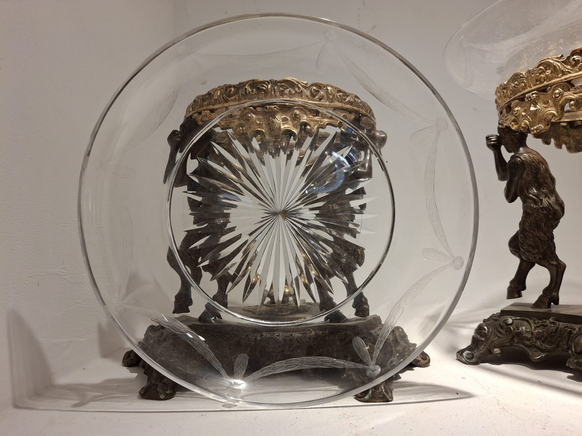 Coppia di alzate centrotavola in bronzo con doppia patina, tre fauni sorreggono una corona di bronzo dorato su cui poggia un piatto in cristallo molato con festoni e stella centrale, Francia, prima metà del XIX secolo, altezza 22 cm, diametro del piatto 21 cm, buonissime condizioni.
