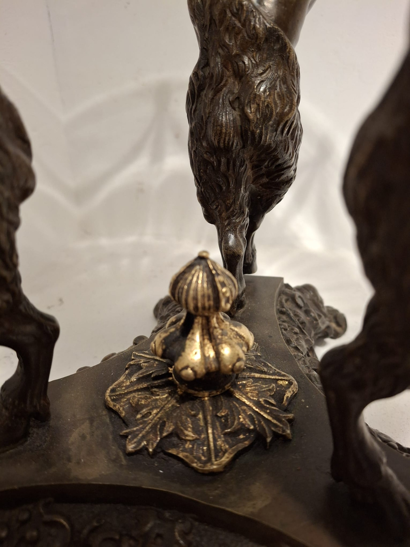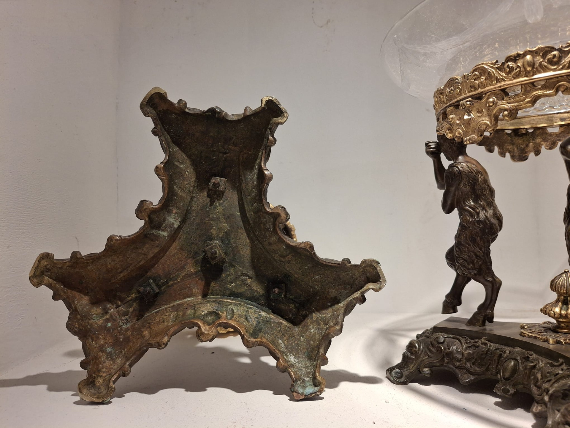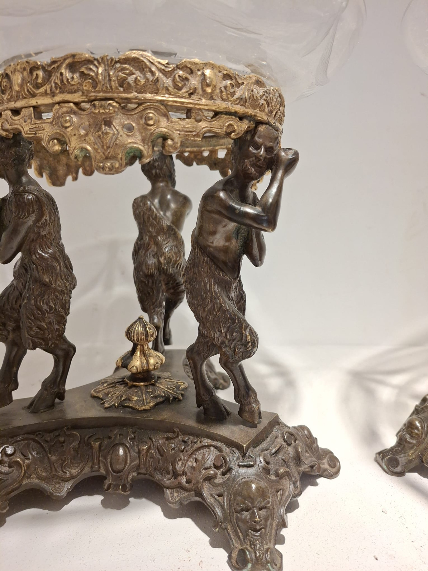 Coppia di alzate centrotavola in bronzo con doppia patina, tre fauni sorreggono una corona di bronzo dorato su cui poggia un piatto in cristallo molato con festoni e stella centrale, Francia, prima metà del XIX secolo, altezza 22 cm, diametro del piatto 21 cm, buonissime condizioni.