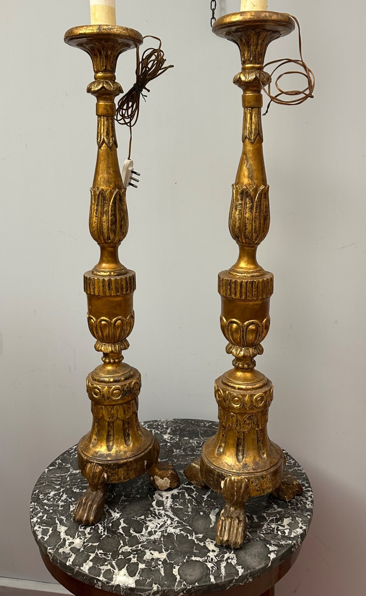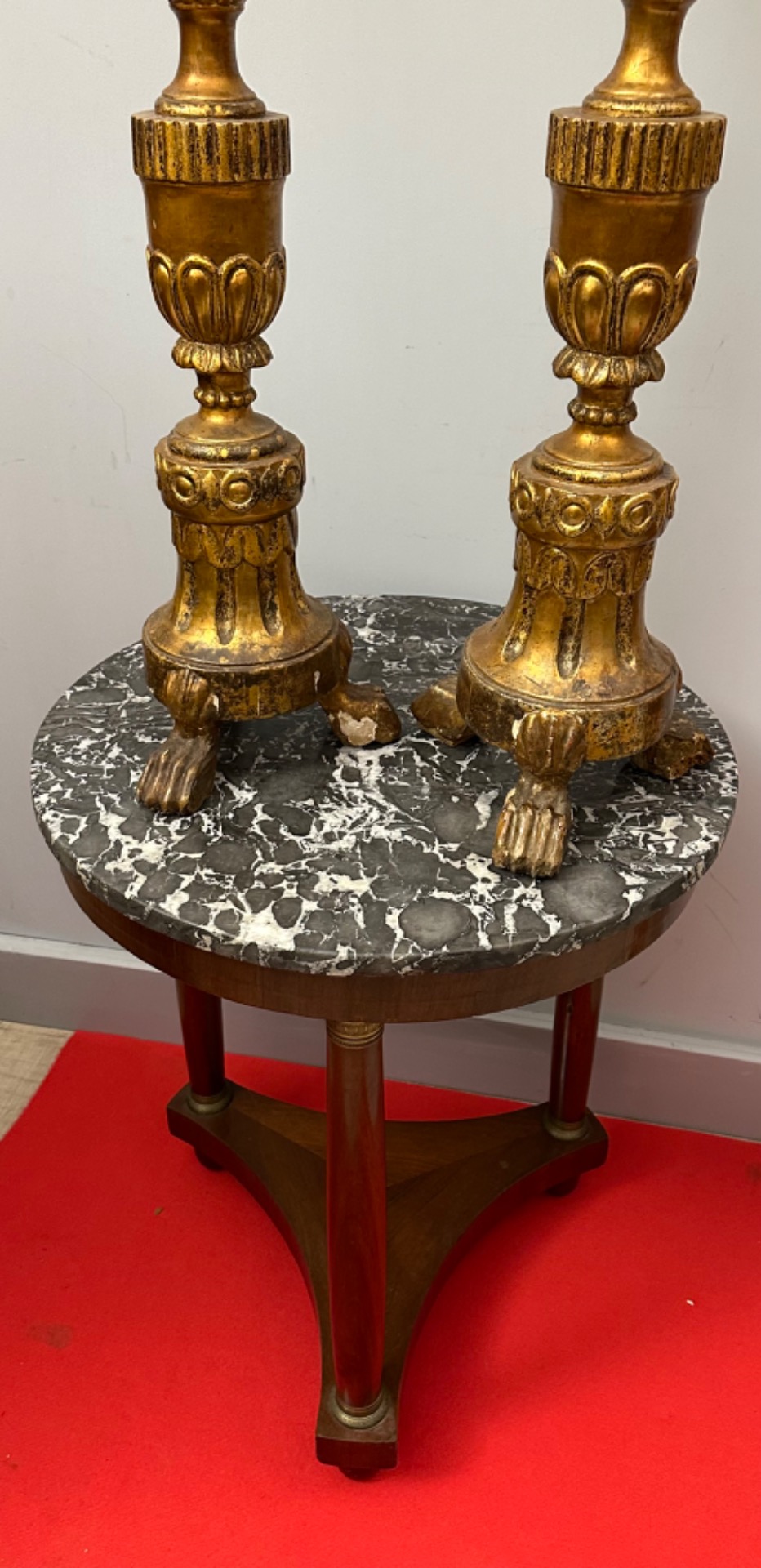 Coppia di candelieri in legno intagliato e dorato di manifattura italiana primi 800 altezza cm 95