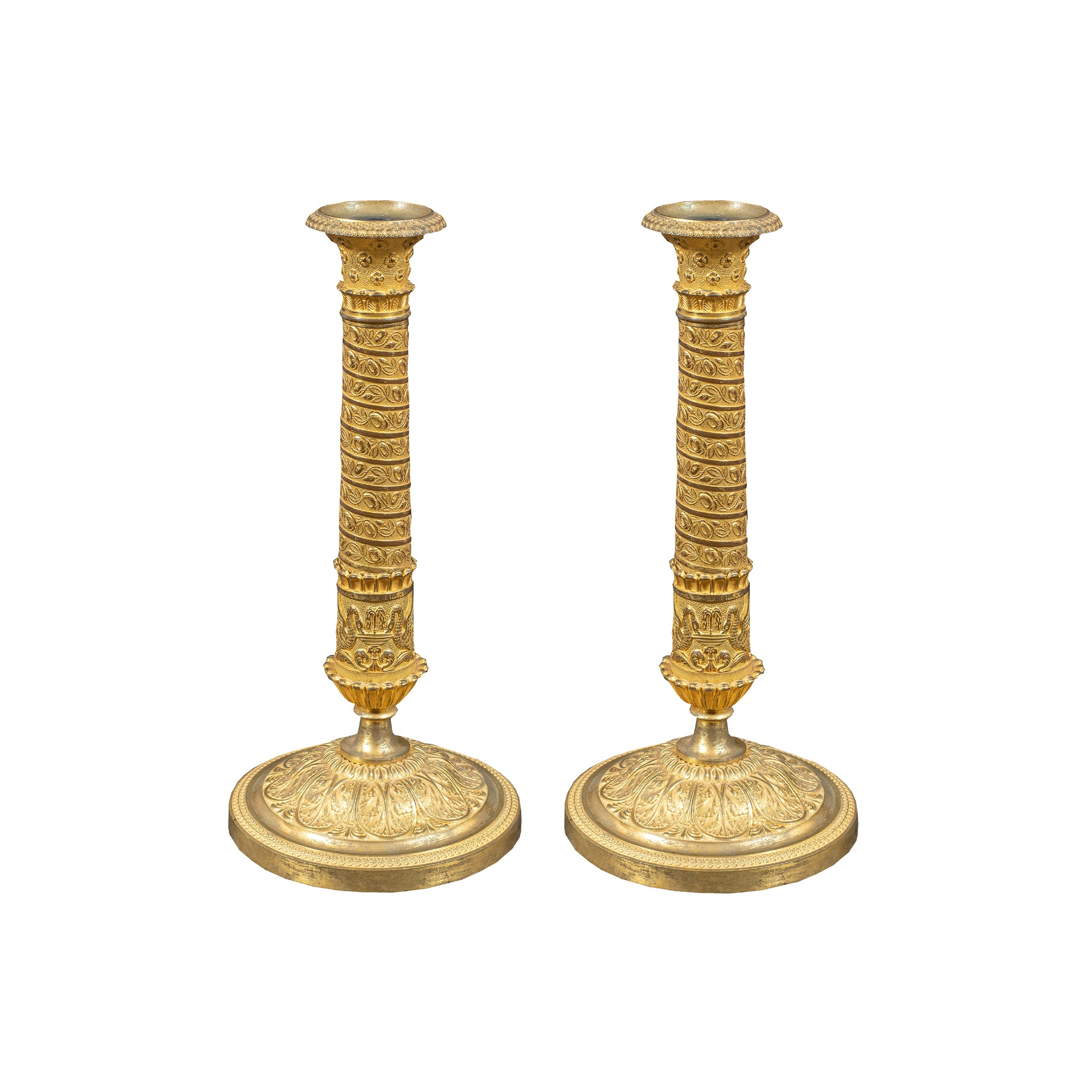 Coppia di candelieri in bronzo dorato. Parigi, inizi XIX secolo.
