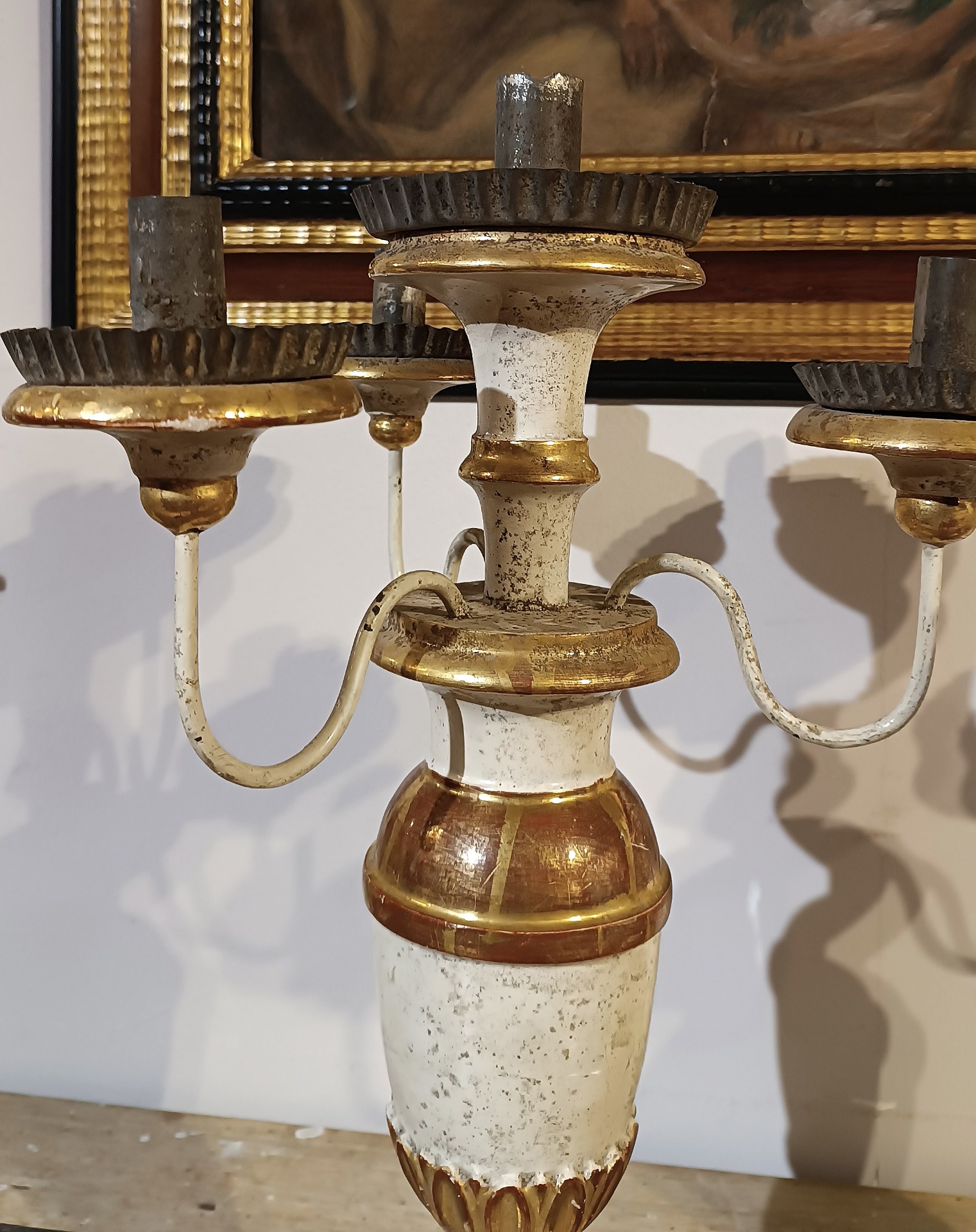 Coppia di candelieri in legno intagliato, dipinti a tempera magra e dorati a foglia d’oro zecchino, lavorati con agata per conferire loro maggiore lucentezza. I candelieri si presentano con un fusto tornito a forma di anfora, decorato con motivi geometrici, e sono dotati di quattro bracci e rispettivi quattro fuochi, con portacandele in ferro. Si tratta di una coppia di candelieri di grande gusto e raffinatezza, in grado di arredare con un tocco di classe e di antico qualsiasi ambiente. Manifattura del centro-Italia, del periodo Luigi XVI-neoclassico, intorno alla seconda metà del XVIII secolo.