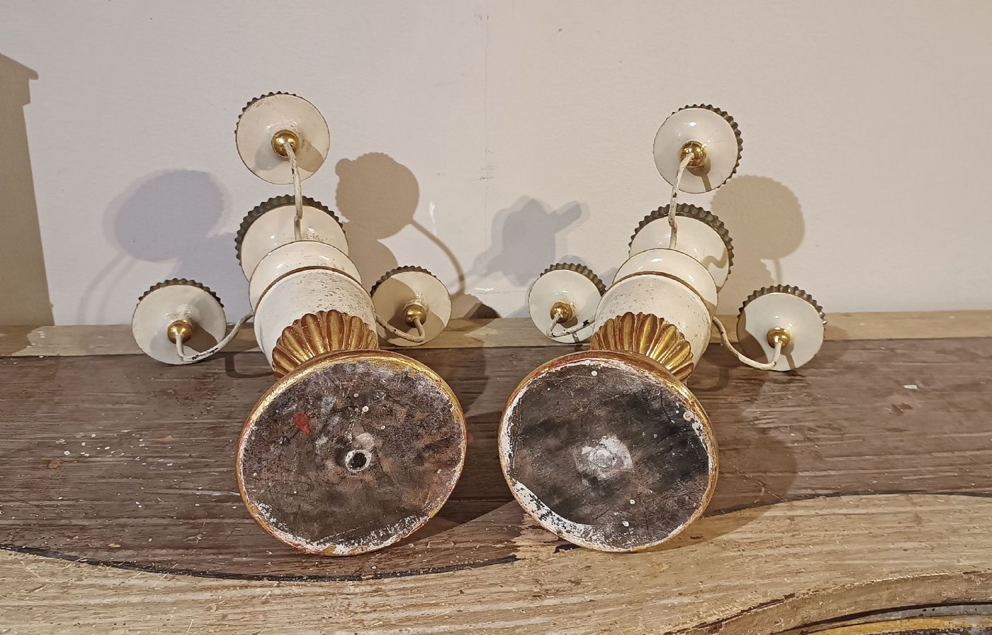 Coppia di candelieri in legno intagliato, dipinti a tempera magra e dorati a foglia d’oro zecchino, lavorati con agata per conferire loro maggiore lucentezza. I candelieri si presentano con un fusto tornito a forma di anfora, decorato con motivi geometrici, e sono dotati di quattro bracci e...