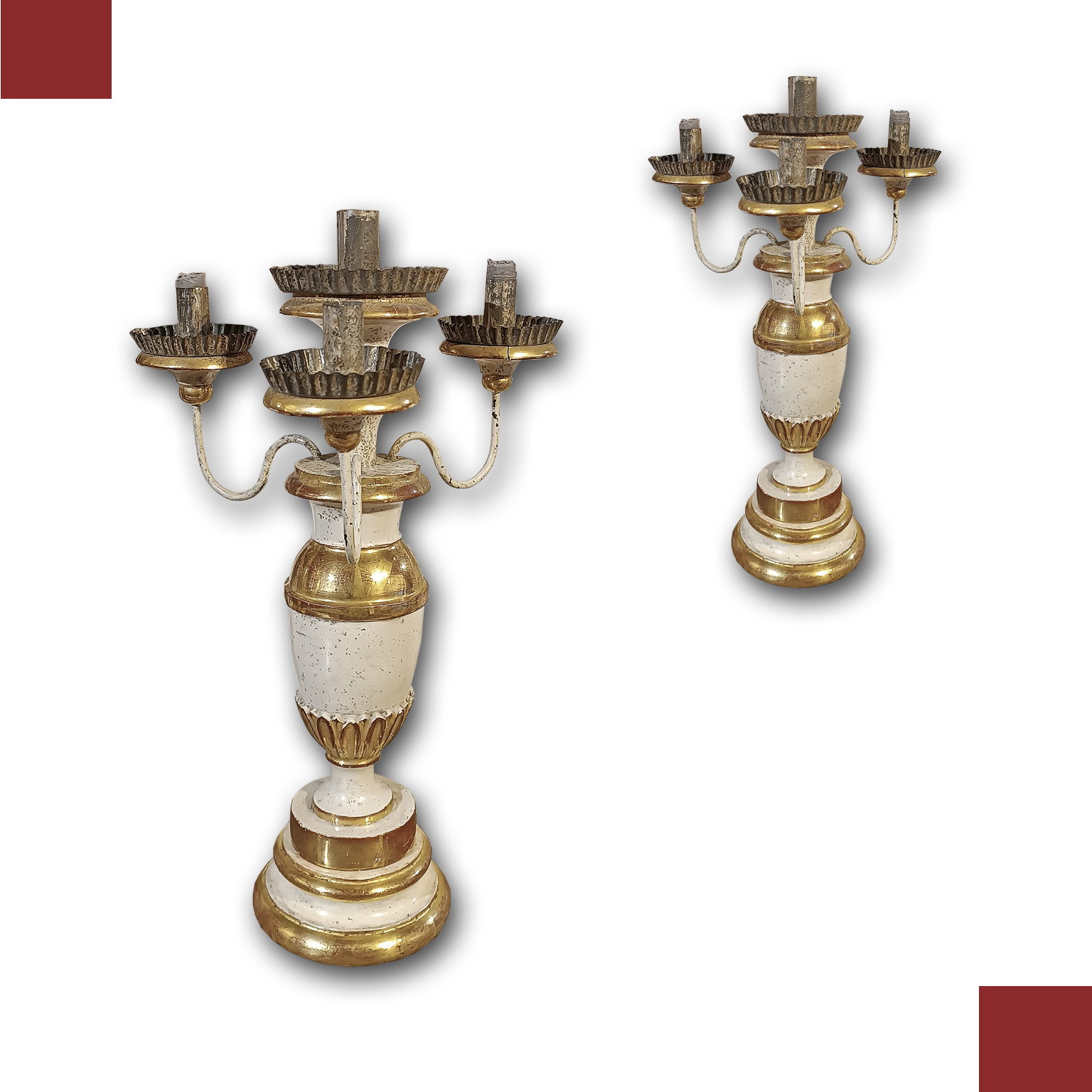 Coppia di candelieri in legno intagliato, dipinti a tempera magra e dorati a foglia d’oro zecchino, lavorati con agata per conferire loro maggiore lucentezza. I candelieri si presentano con un fusto tornito a forma di anfora, decorato con motivi geometrici, e sono dotati di quattro bracci e rispettivi quattro fuochi, con portacandele in ferro. Si tratta di una coppia di candelieri di grande gusto e raffinatezza, in grado di arredare con un tocco di classe e di antico qualsiasi ambiente. Manifattura del centro-Italia, del periodo Luigi XVI-neoclassico, intorno alla seconda metà del XVIII secolo. Misure: H x L x P 49 x 30 x 32cm