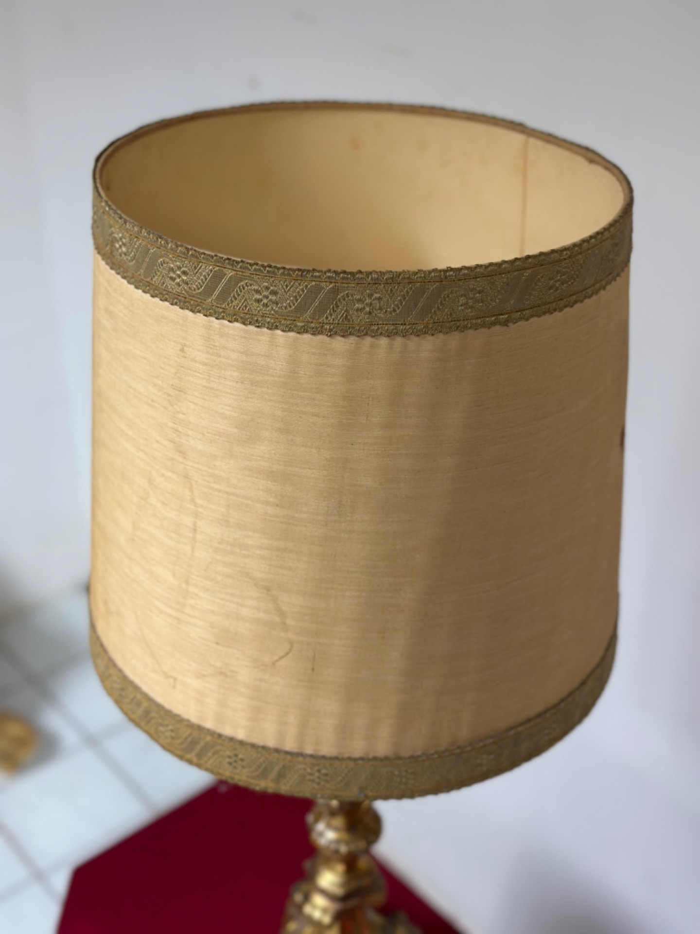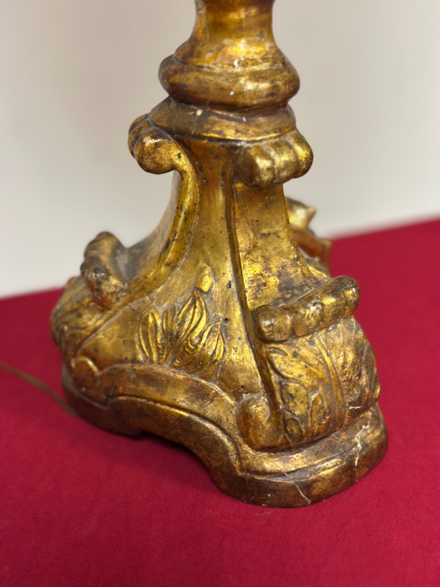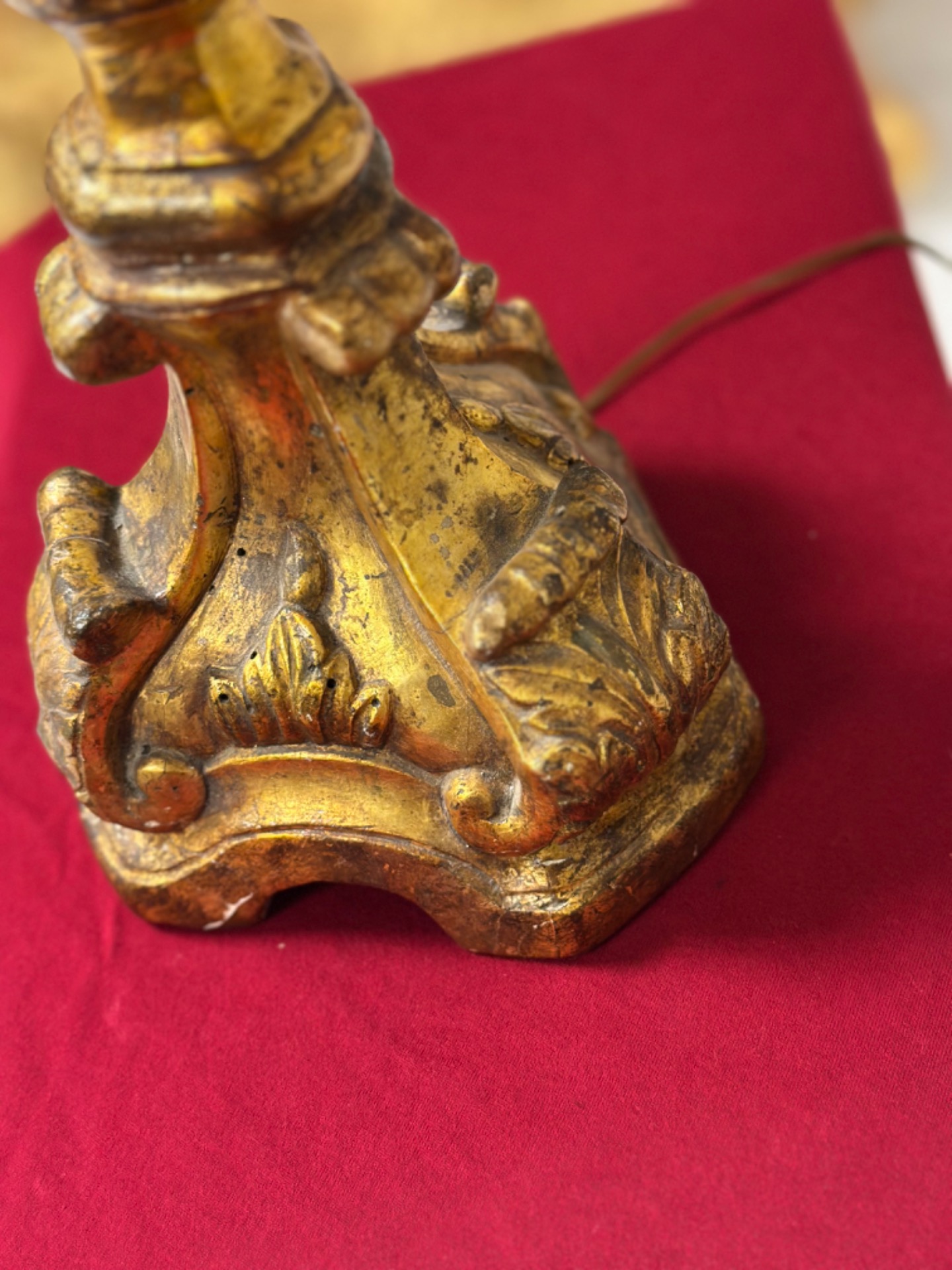Torcerà in legno intagliato e dorato epoca Luigi XVI fine 700 montata a lampada e completa di paralume