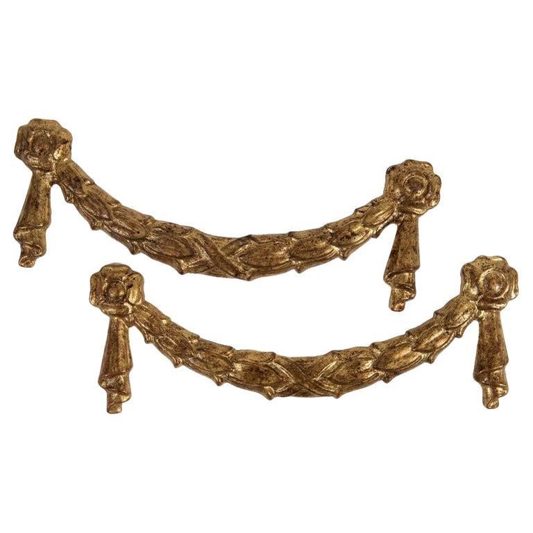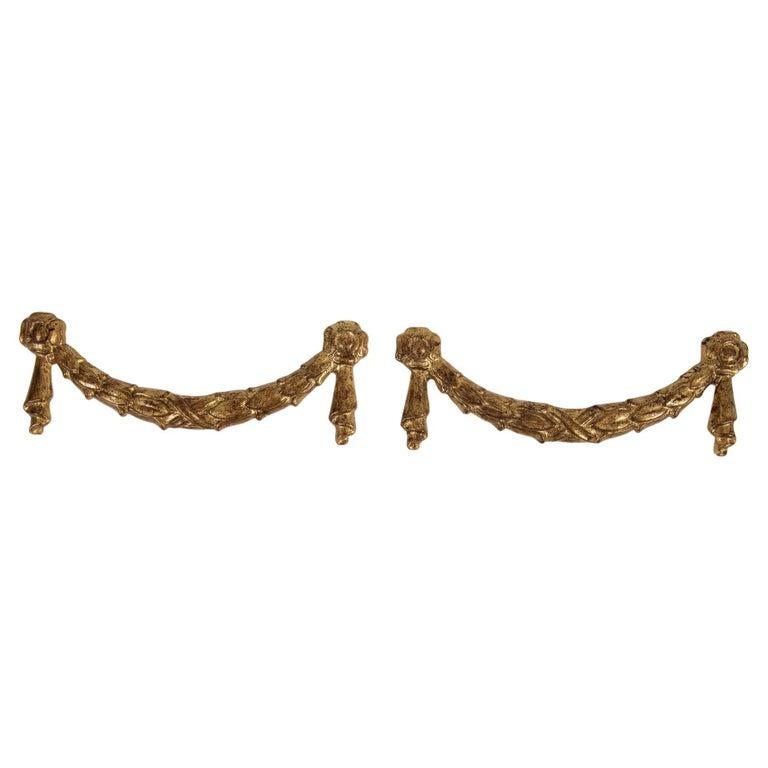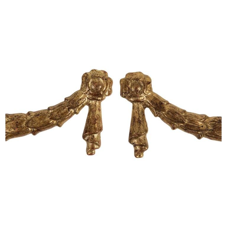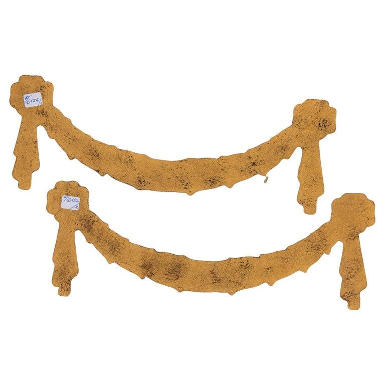 Coppia di antichi fregi a ghirlanda in legno dorato, da usare a parete. Erano più spesse, ma qualcuno le ha assottigliate per qualche motivo.