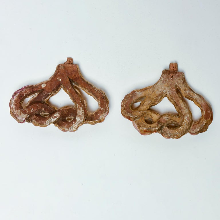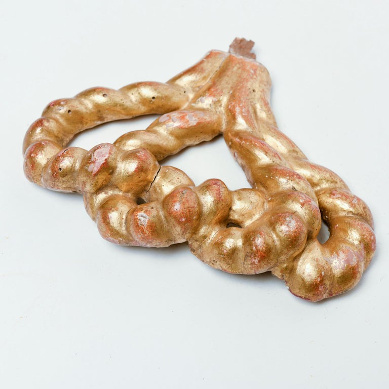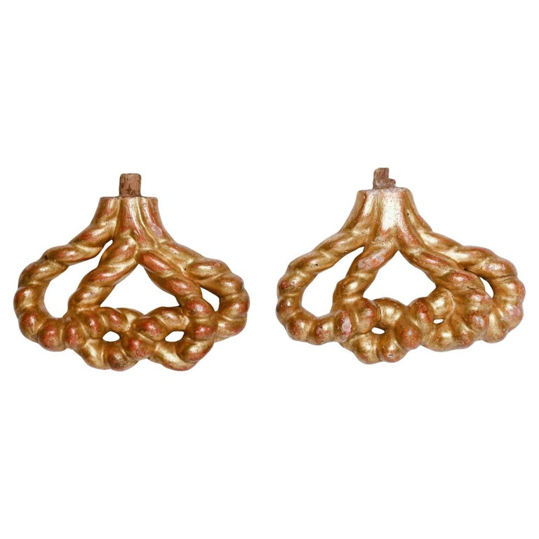 Coppia di piccoli fregi in legno dorato a forma di insoliti fiocchi di corda. Possono essere appesi sotto quadri o specchi o applique, o...altrove.