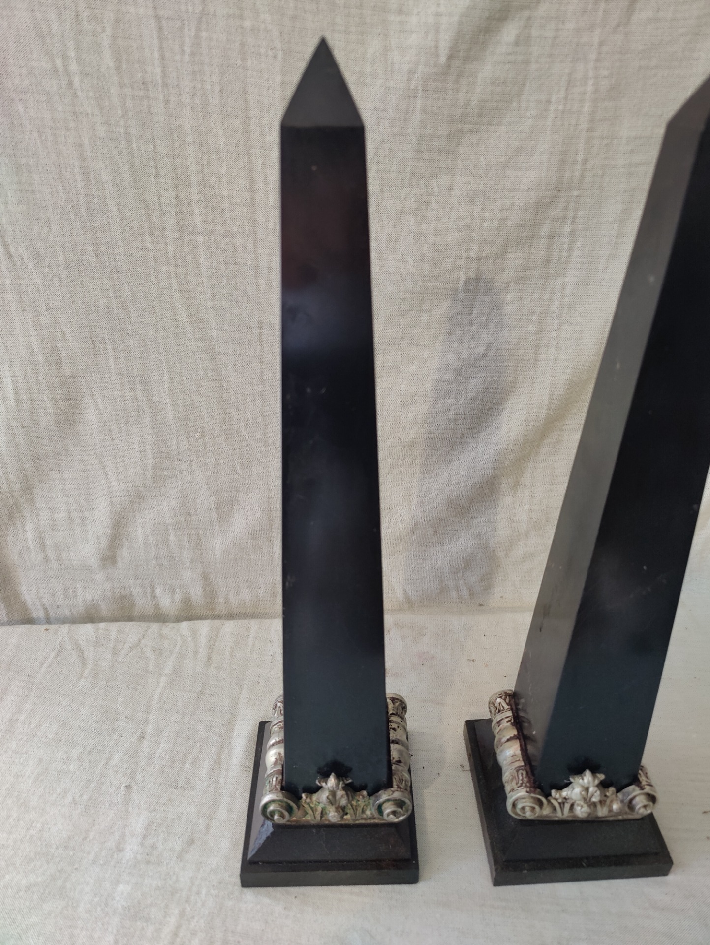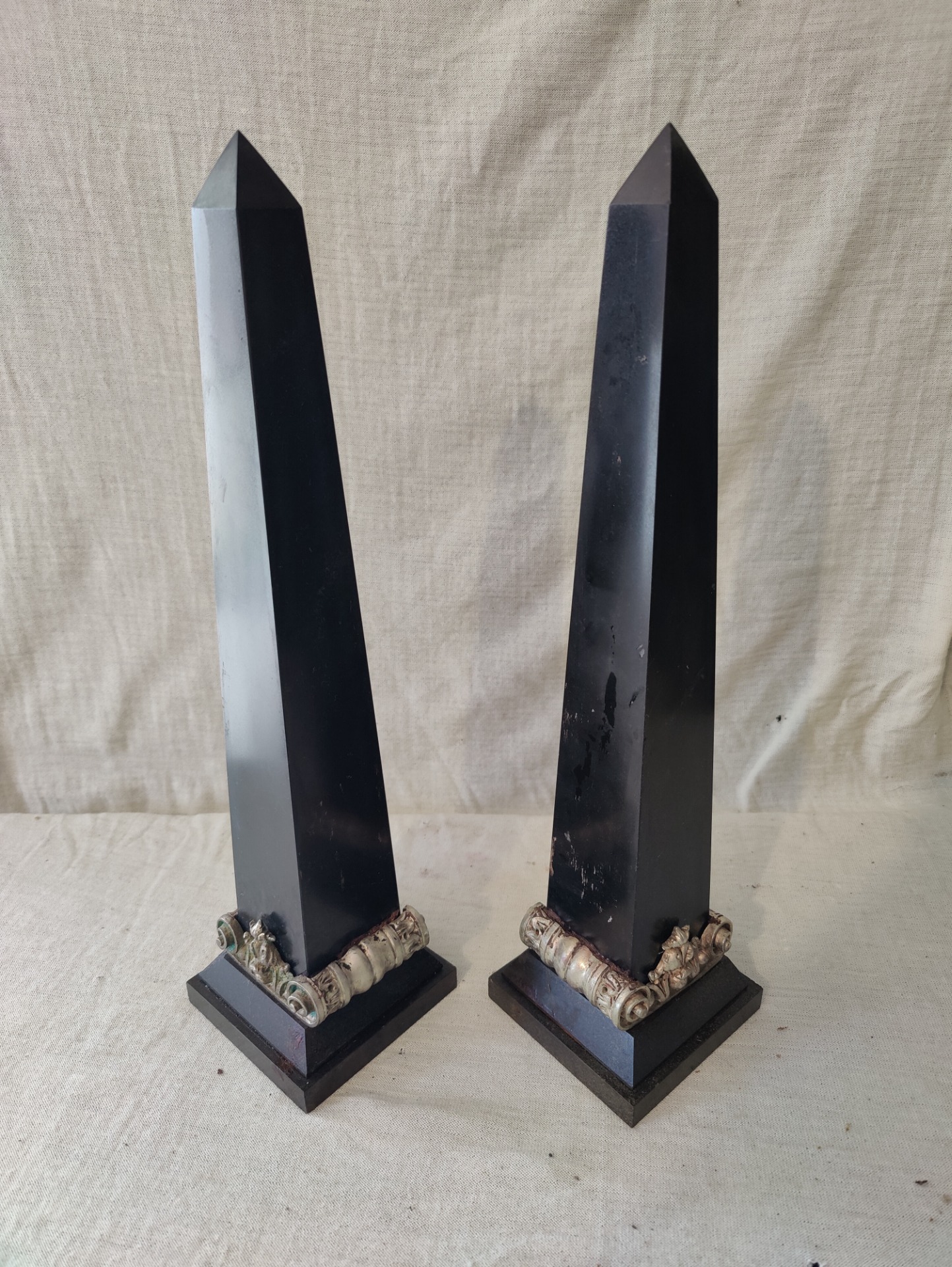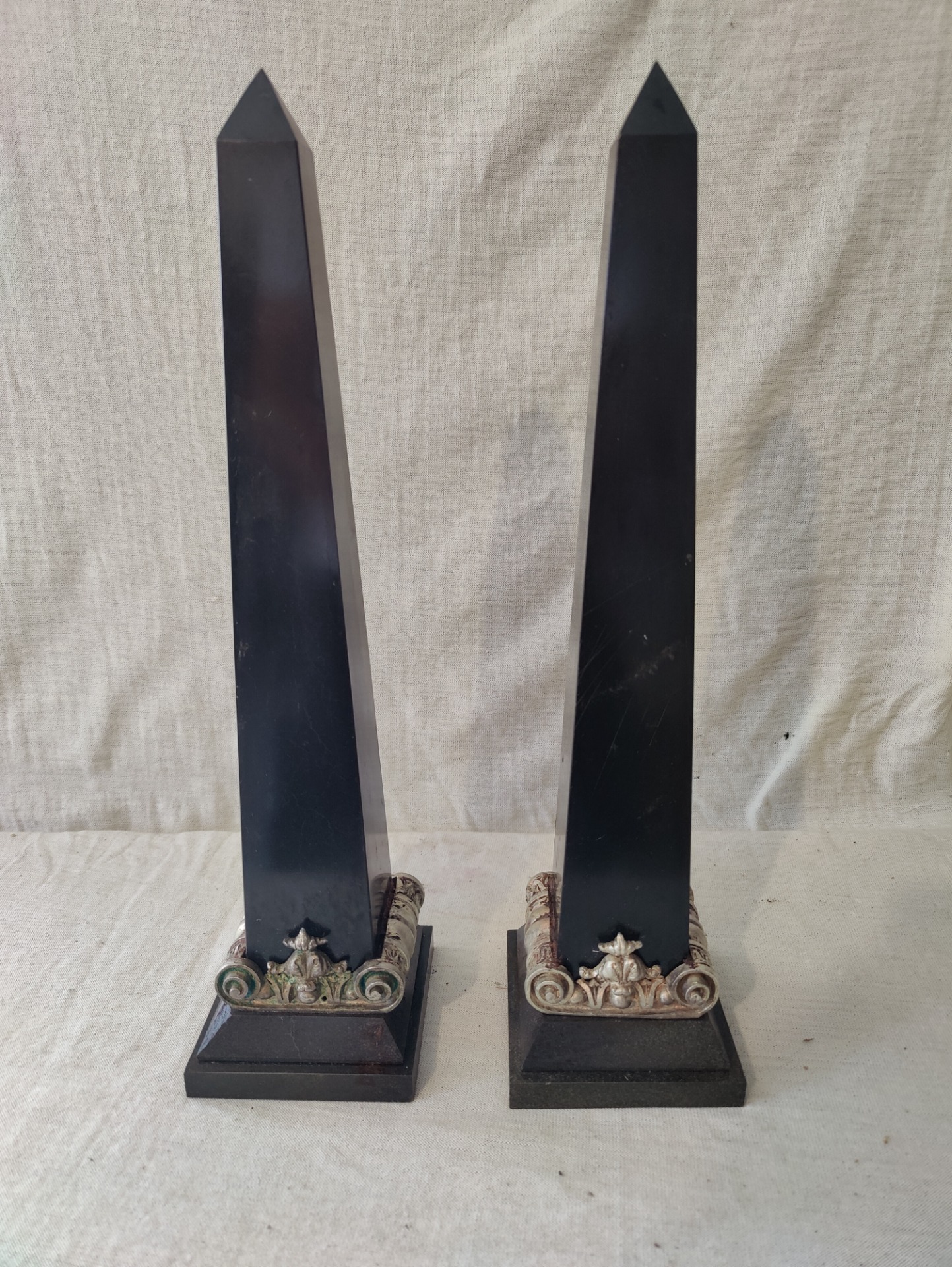 Piccola coppia di obelischi in marmo nero del Belgio con fregi applicati. Provenienza Venezia, collezione privata. Belli come complementi d'arredo, dalle misure contenute ma proporzionati. In buone condizioni generali, integri. Spedizioni in tutto il mondo. Misure: - 46 cm - Base 11 x 11 cm