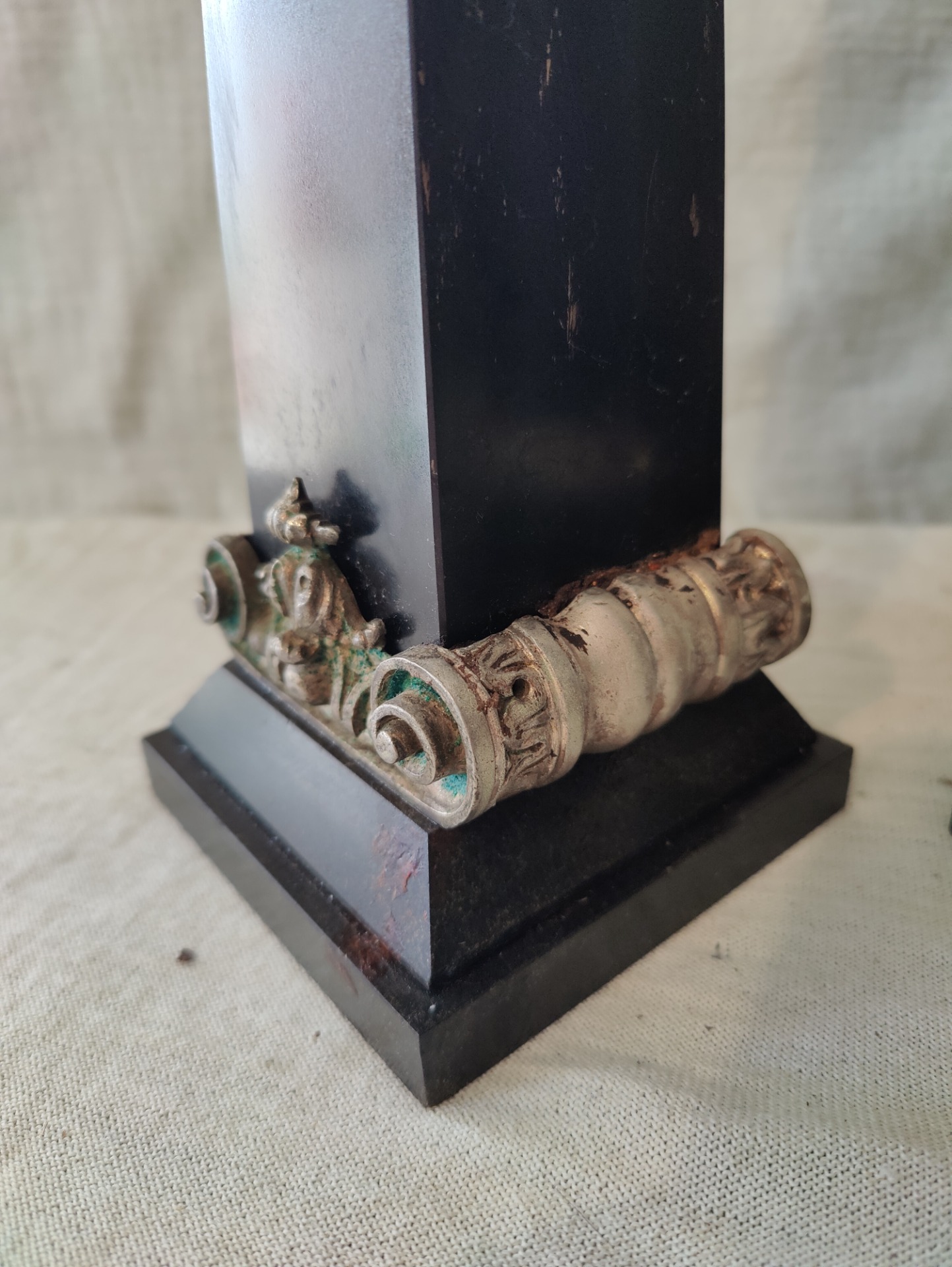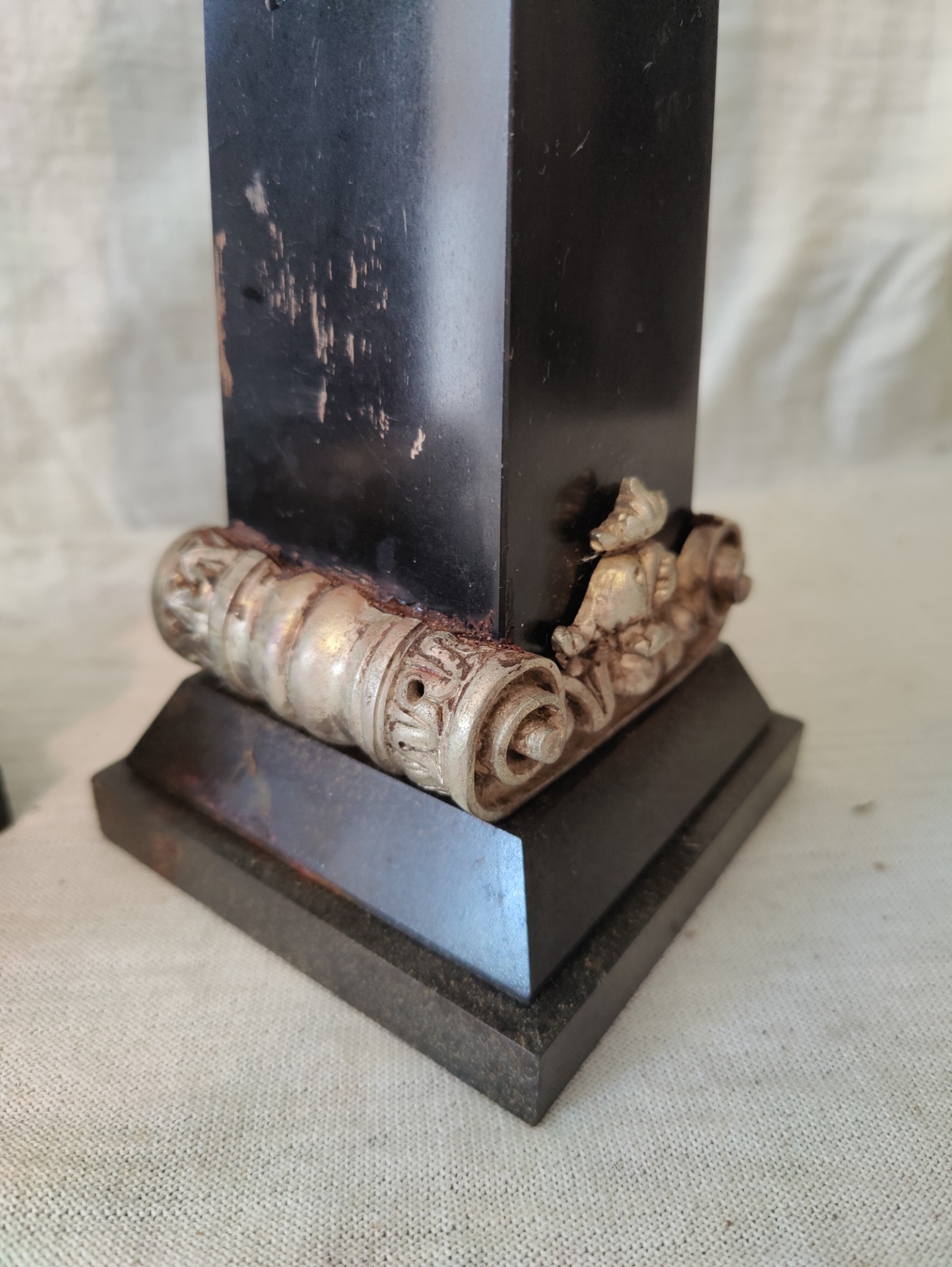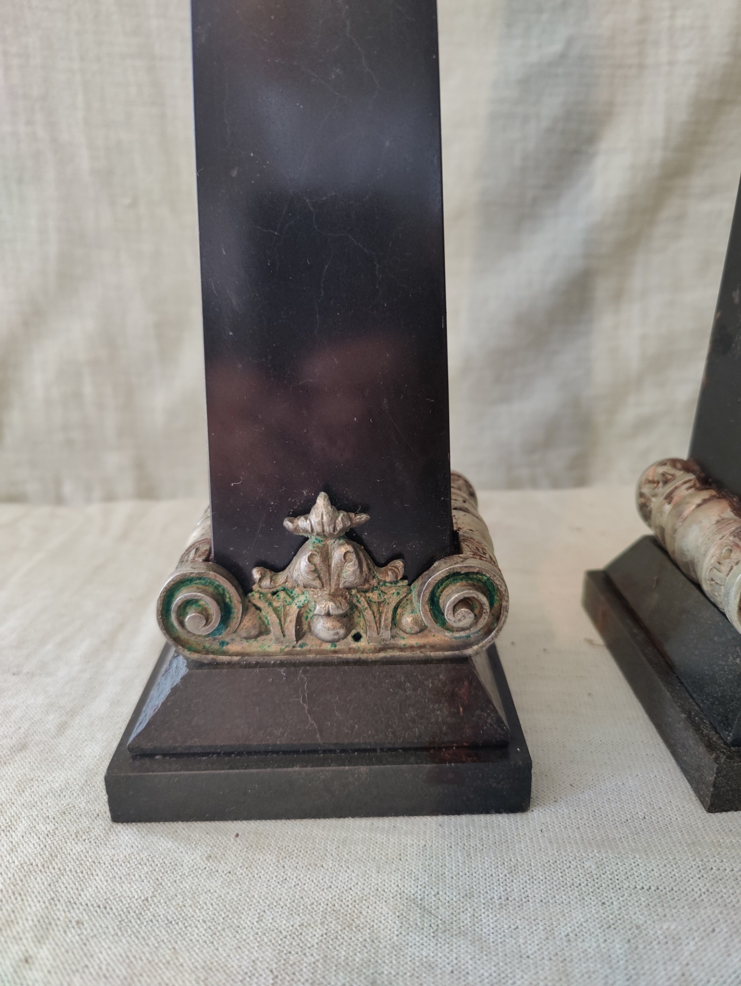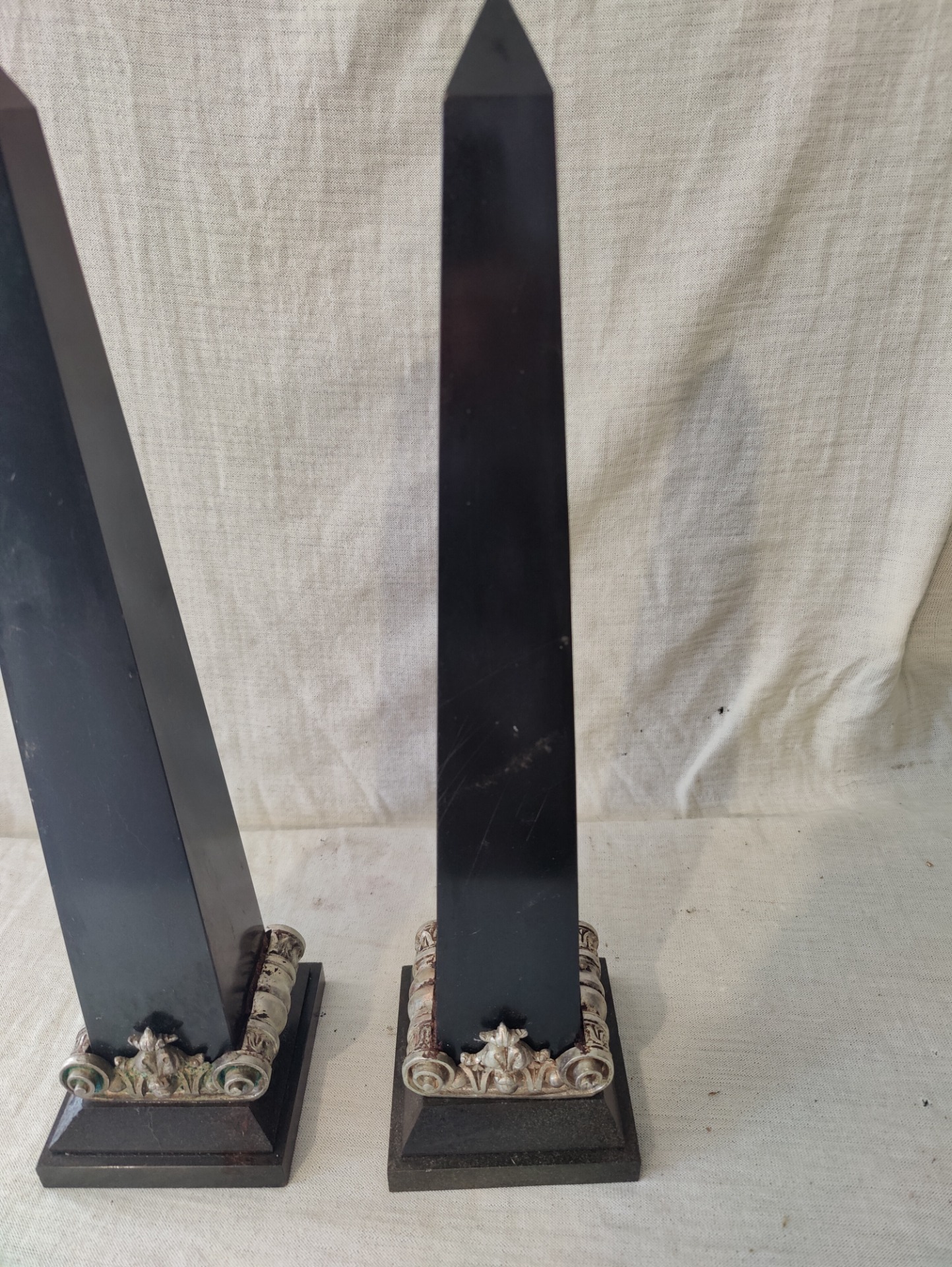 Piccola coppia di obelischi in marmo nero del Belgio con fregi applicati. Provenienza Venezia, collezione privata. Belli come complementi d'arredo, dalle misure contenute ma proporzionati. In buone condizioni generali, integri. Spedizioni in tutto il mondo. Misure: - 46 cm - Base 11 x 11 cm