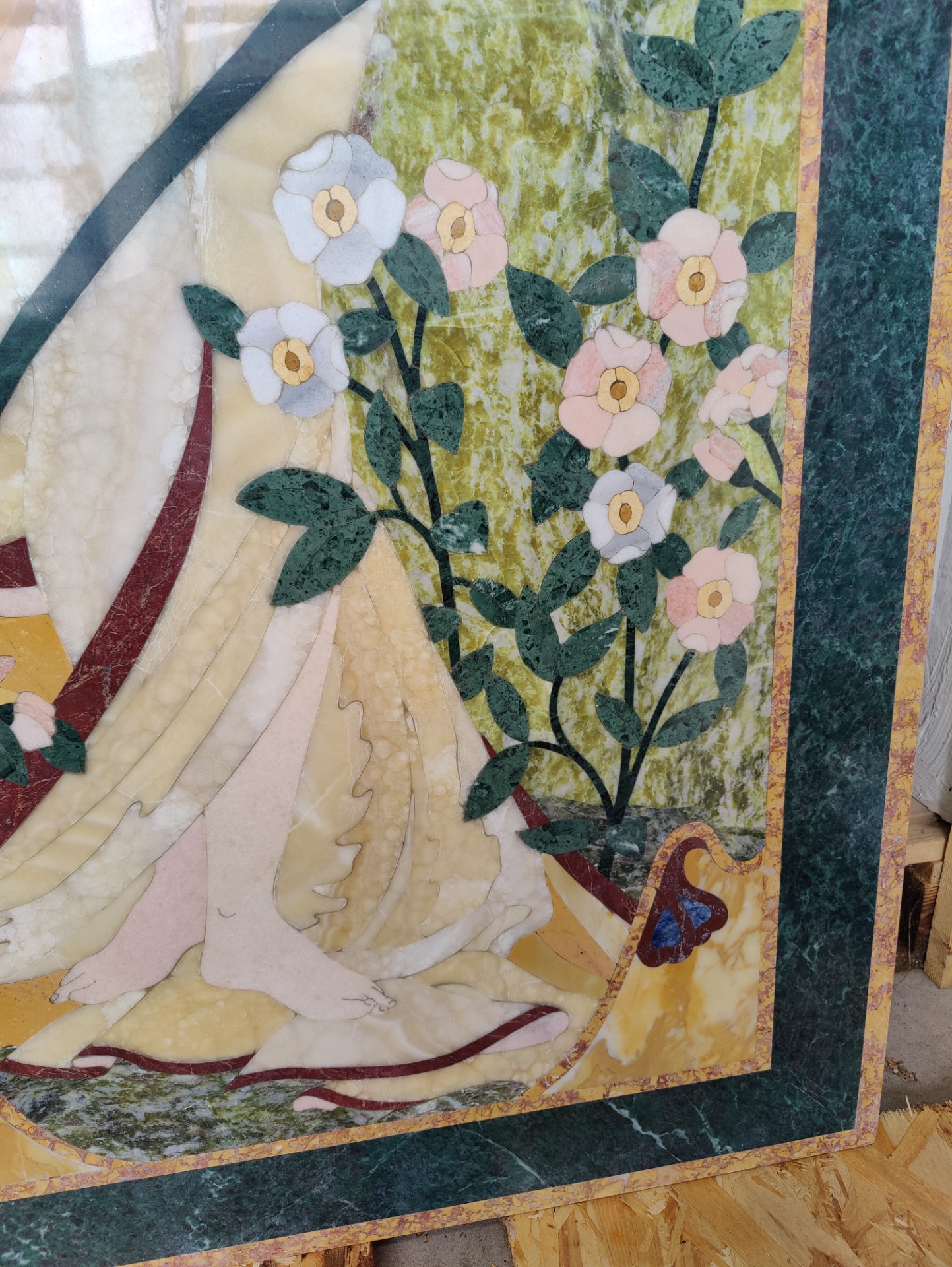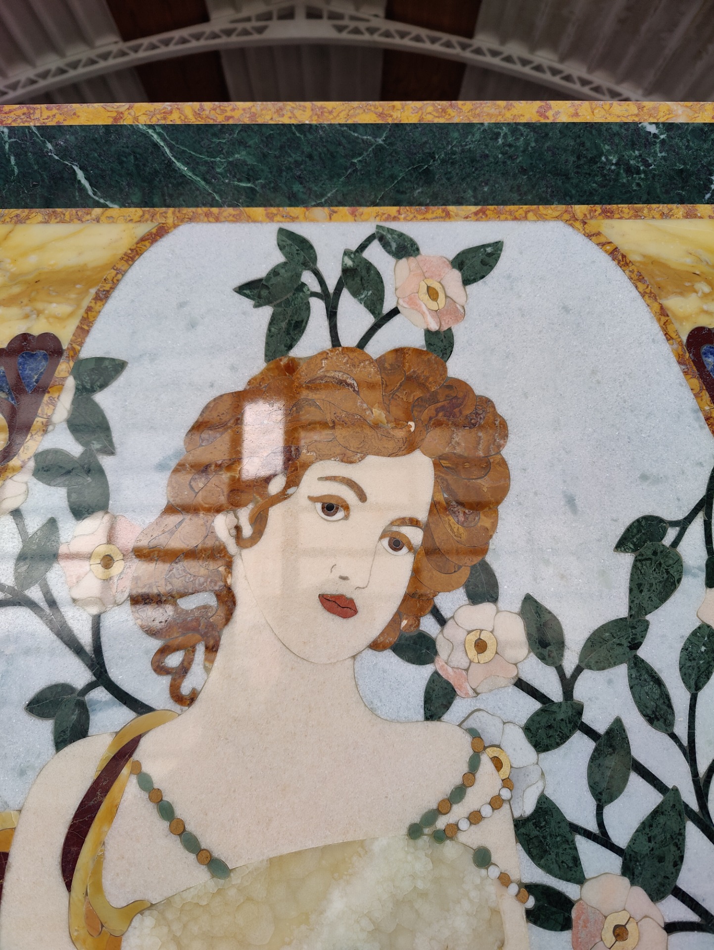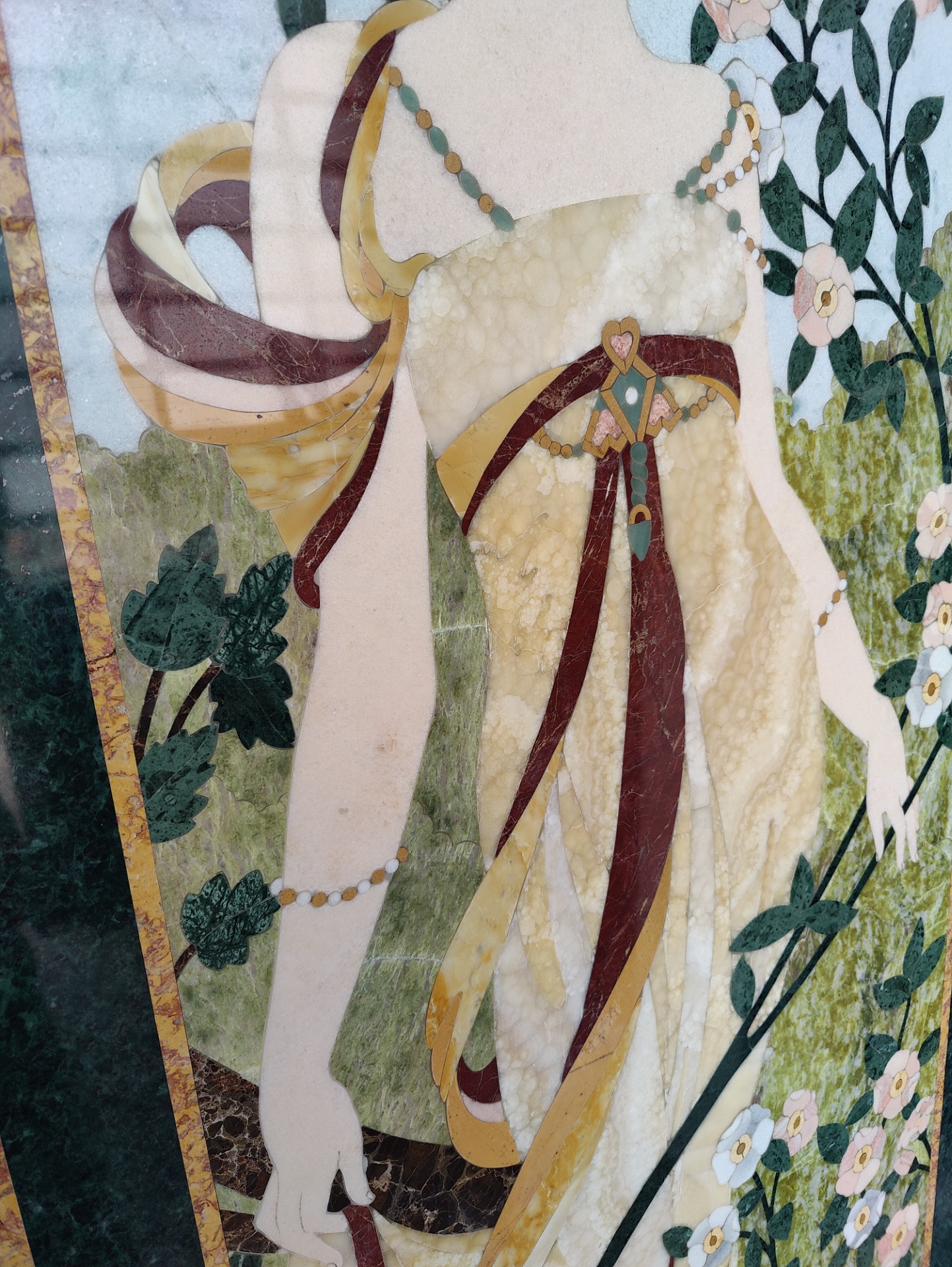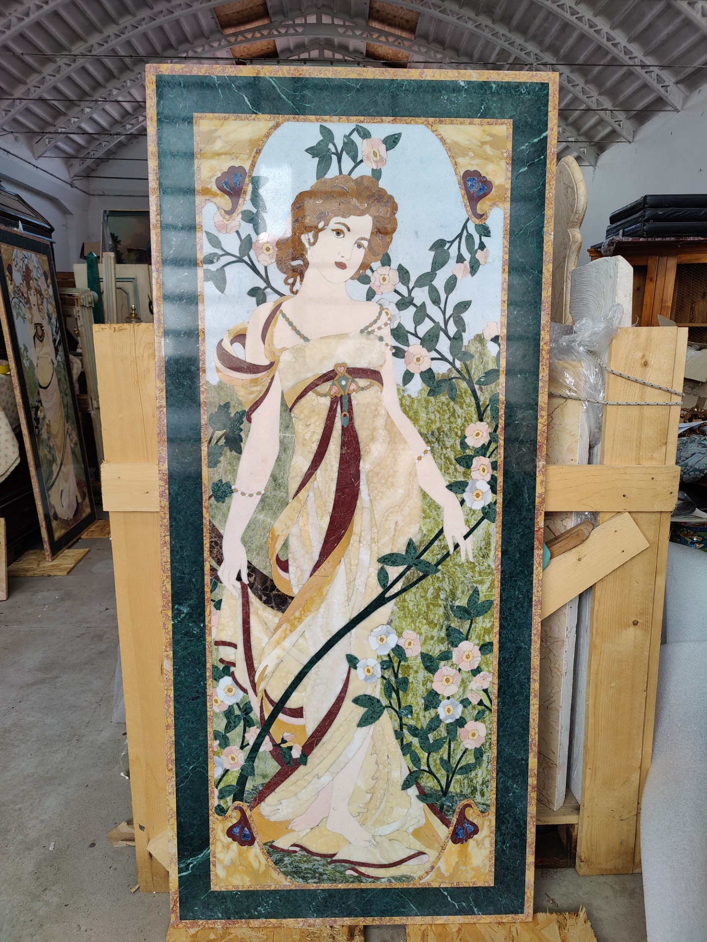 Bellissimo pannello in marmo intarsiato raffigurante una donna in abito elegante circondata da motivi floreali.