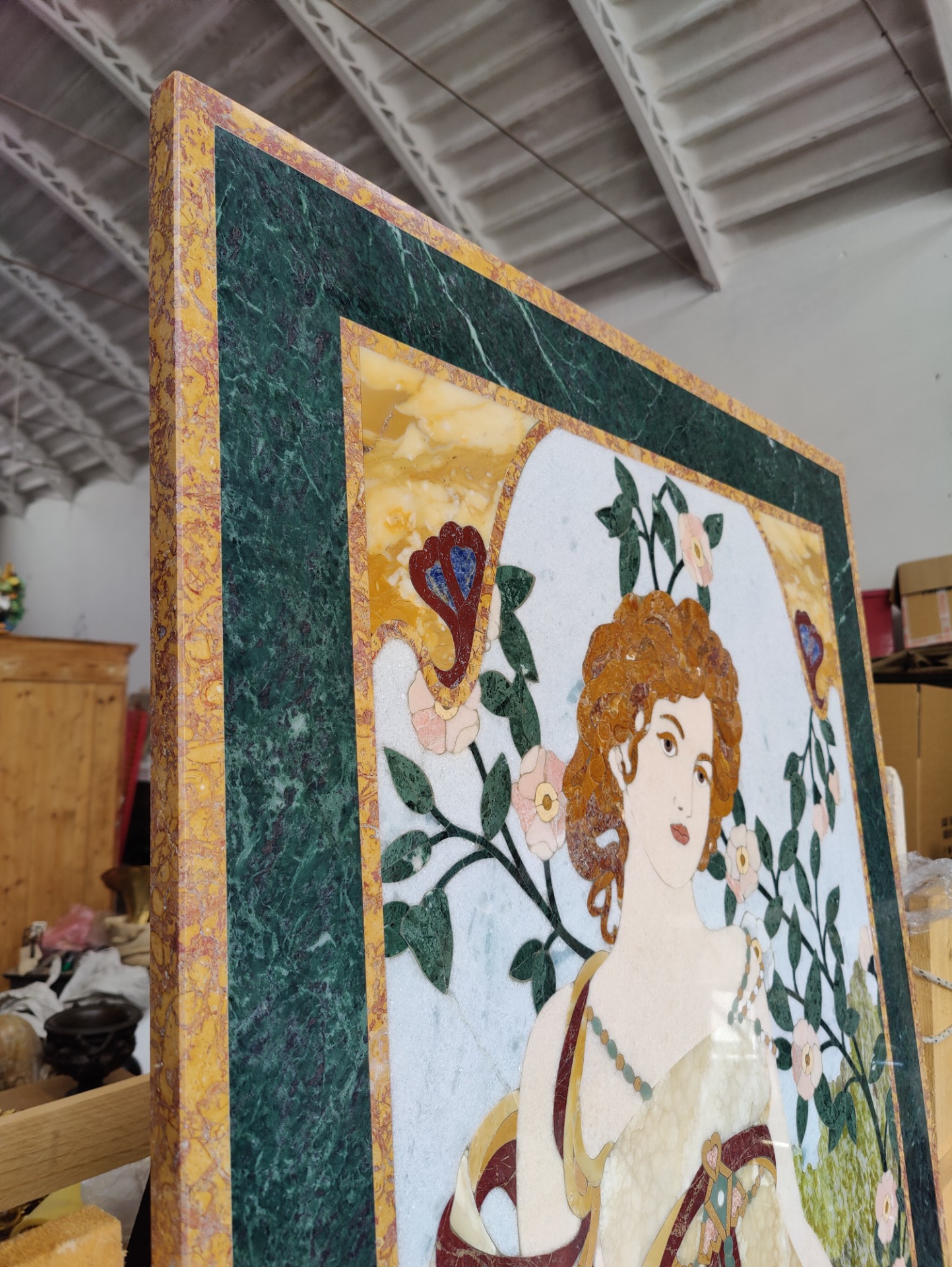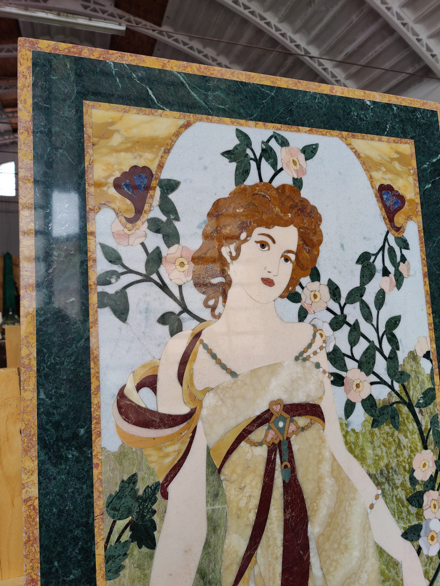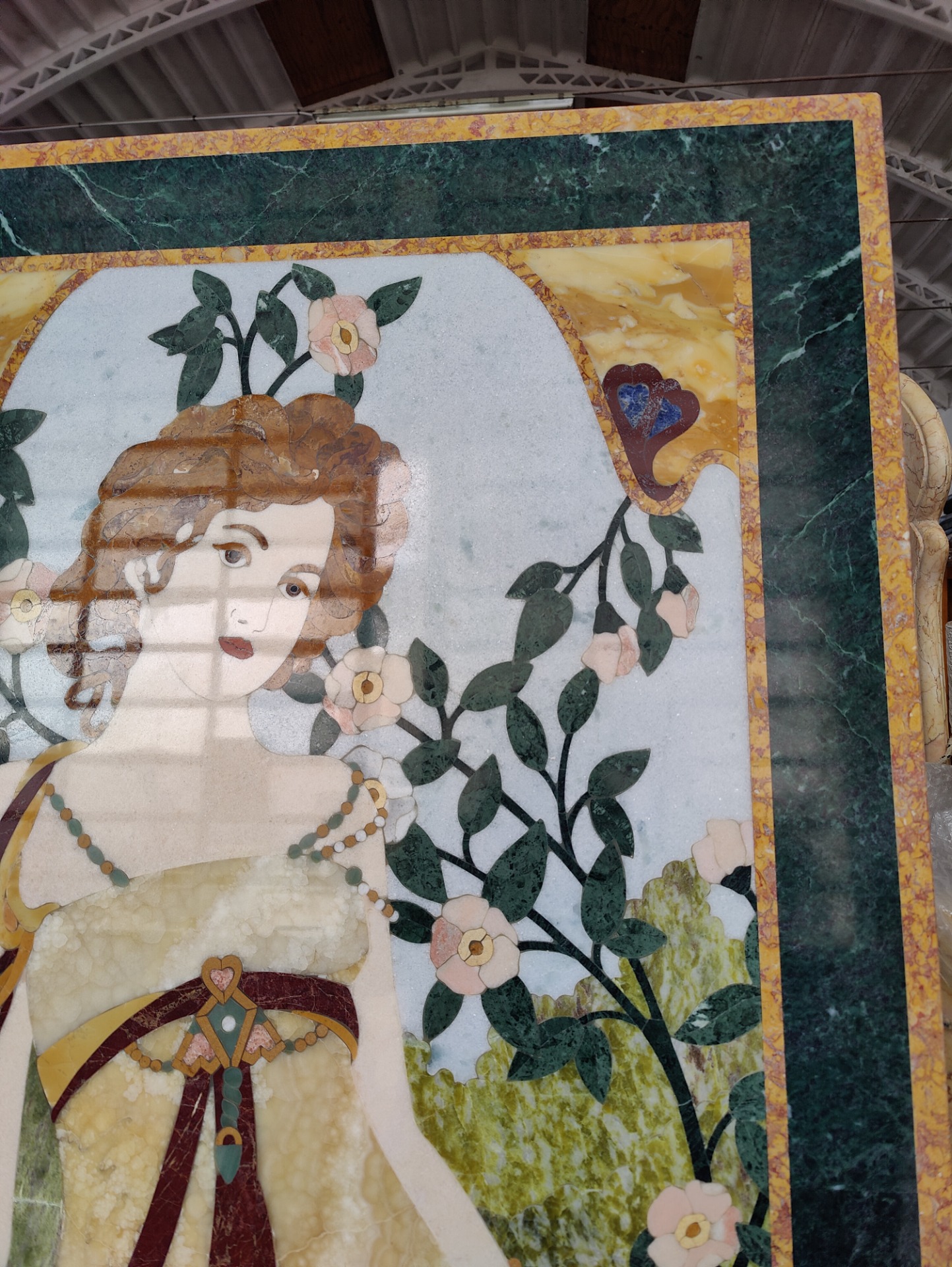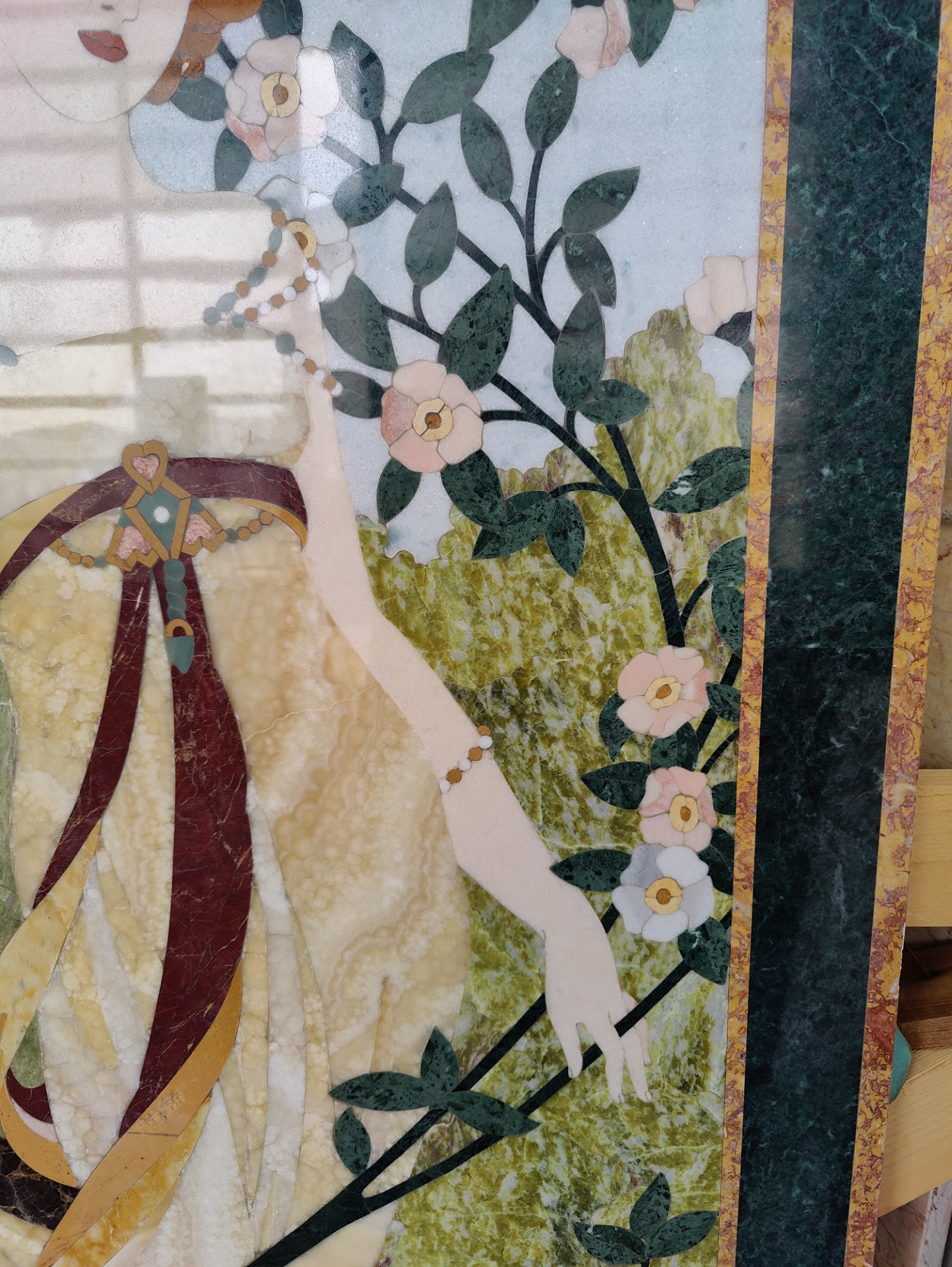Bellissimo pannello in marmo intarsiato raffigurante una donna in abito elegante circondata da motivi floreali.