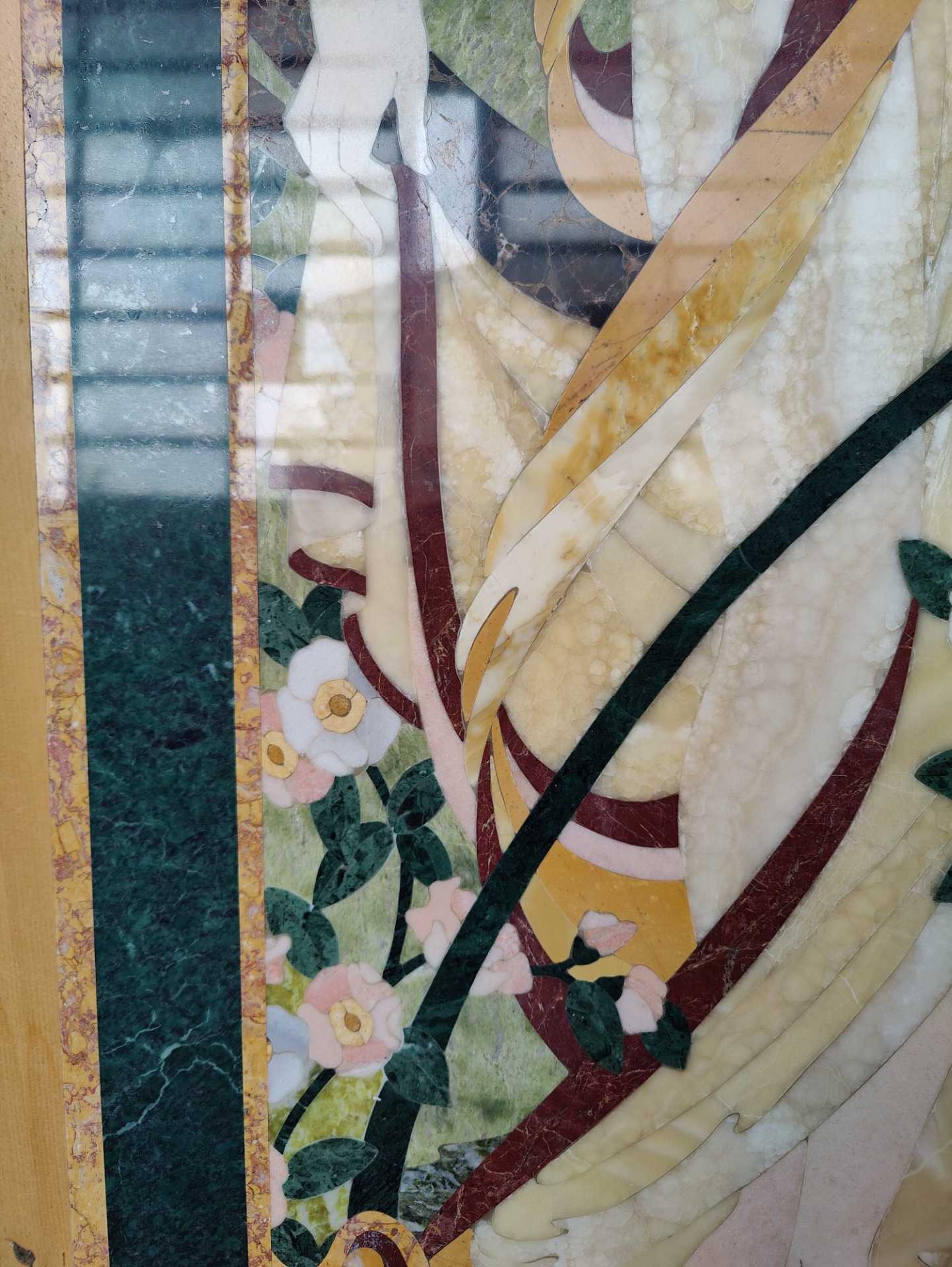 Notevole la qualità dell'intarsio e splendida la policromia dei marmi. Lotto davvero esclusivo proveniente da una villa Liberty di Venezia, perfetto da fissare al muro con staffe in ferro, per impreziosire in modo unico un vano d'ingresso o di soggiorno. Ottimo anche come base per tavolo. Facente parte di una coppia. Il stile è chiaramente ispirato all'Art Nouveau, caraterizzato da linee sinuose, motivi floreali e figure femminili eteree.
