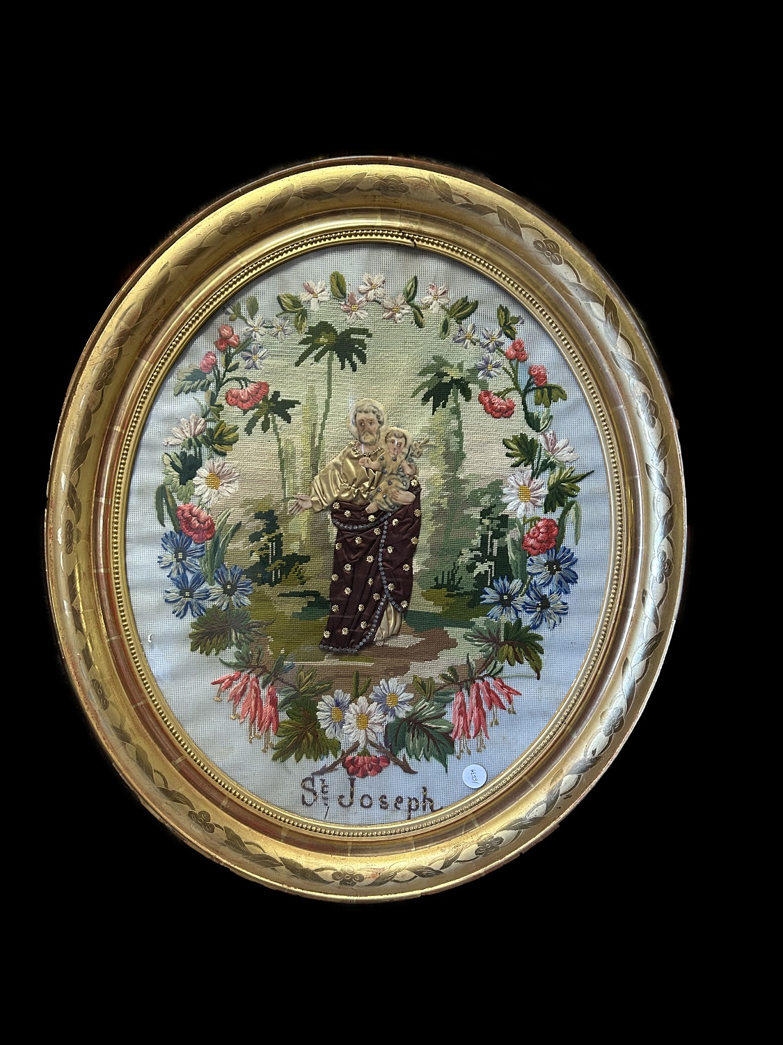 Quadro francese della seconda metà del 1800 raffigurante San Giuseppe ricamato a piccolo punto. Presenta bellissima cornice ovale dorata finemente incisa.