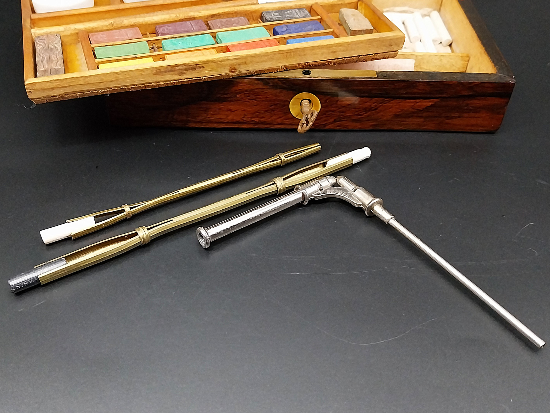 2 porta mine, 1 spruzzatore a bocca in metallo cromato e varie matite da disegno nei vari colori.