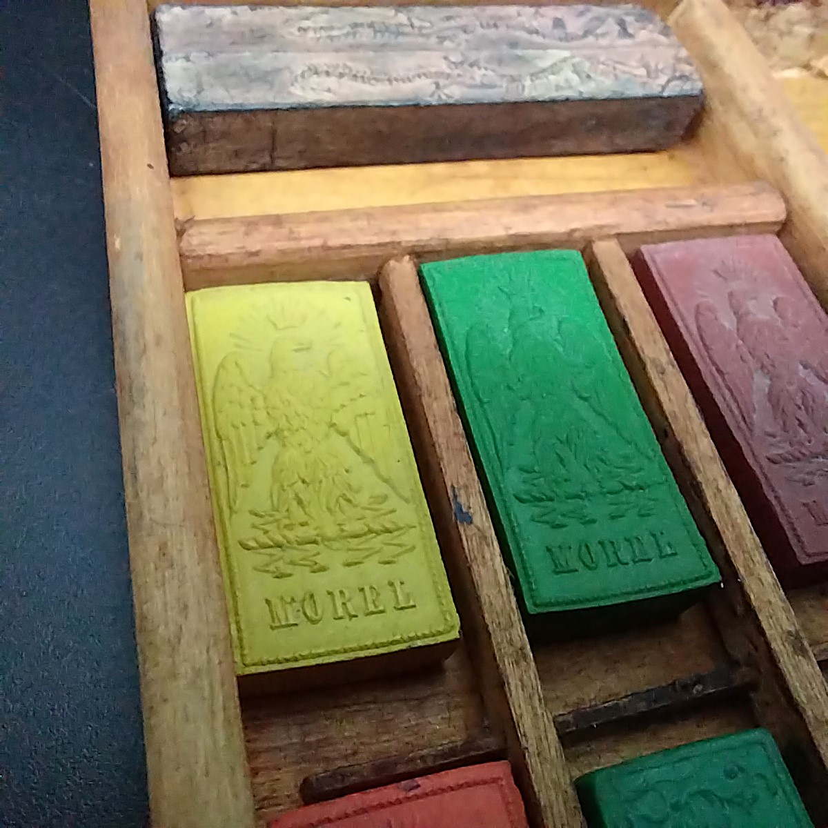 1 scomparto con 14 bastoncini di colore firmati Morel, 4 ciotole mescolatrici in porcellana, 1 pennello.