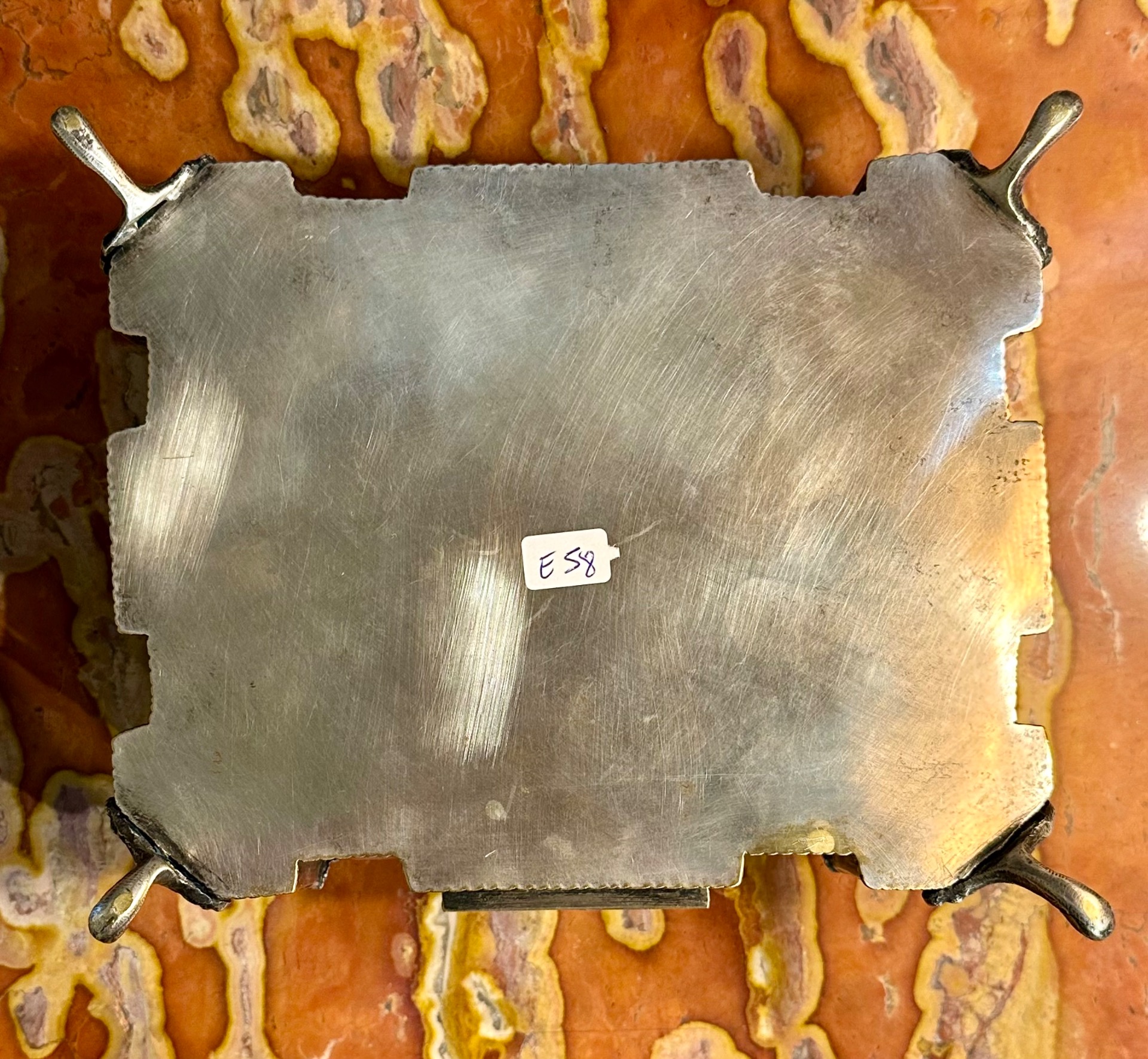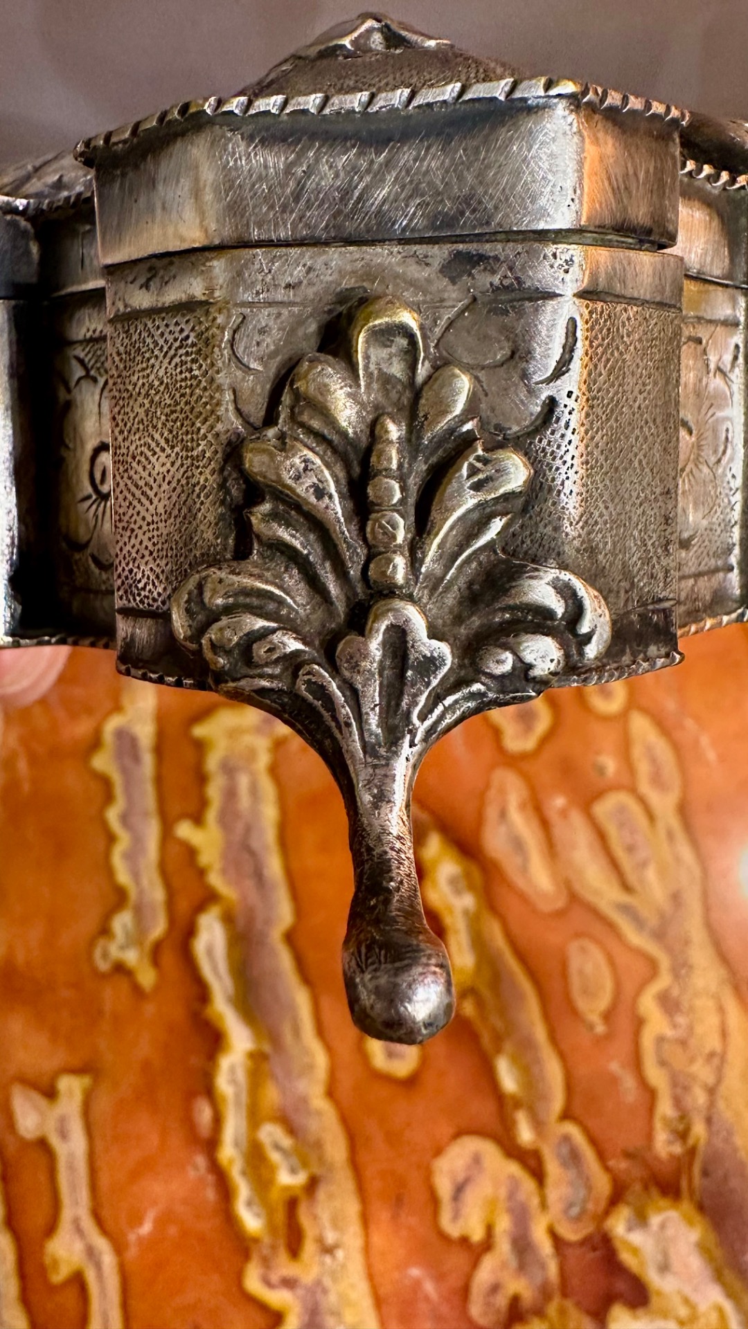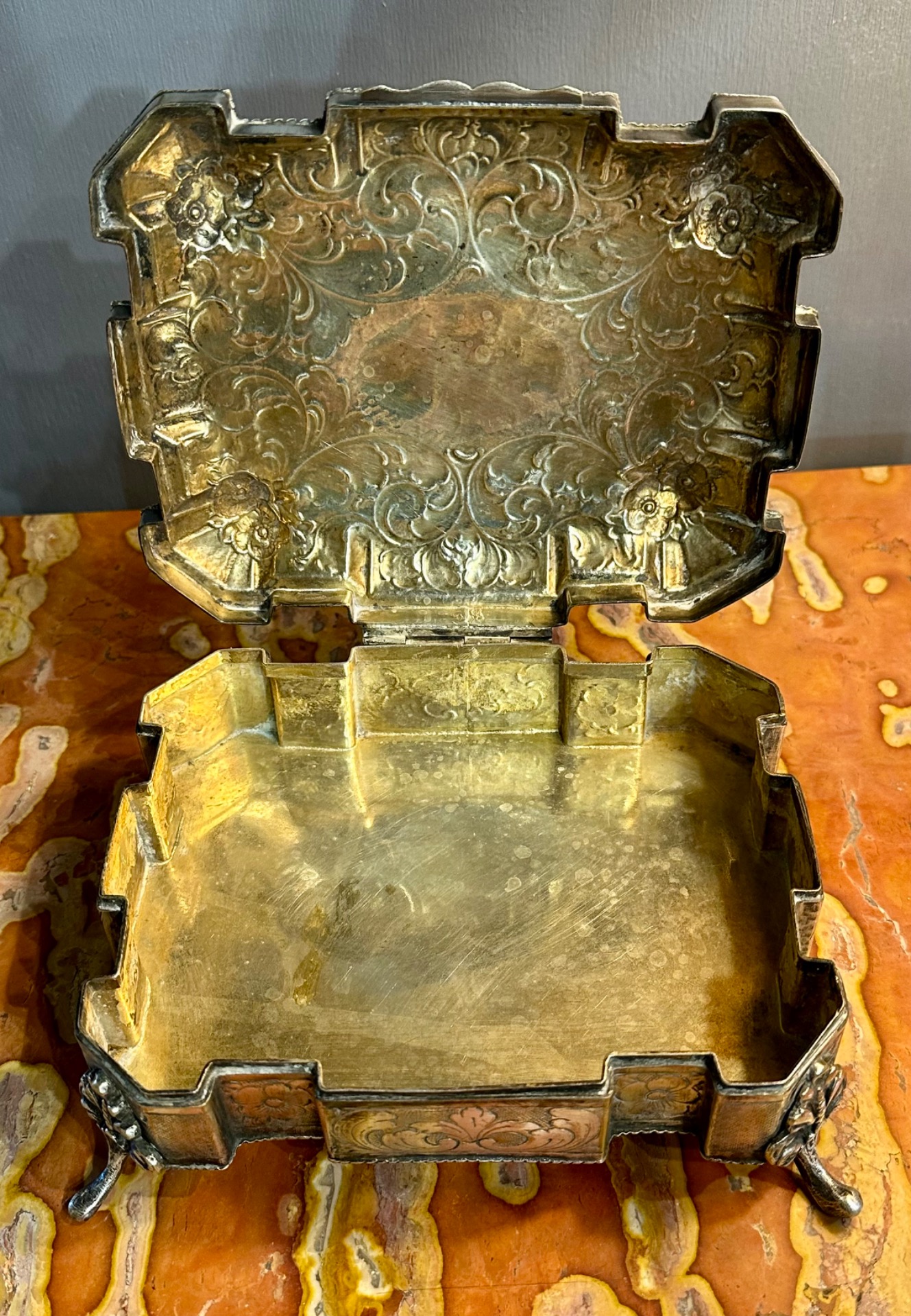 Raffinata scatola o portagioie in metallo argentato, di forma mossa e poggiante su quattro eleganti piedini a foglia d'acanto.