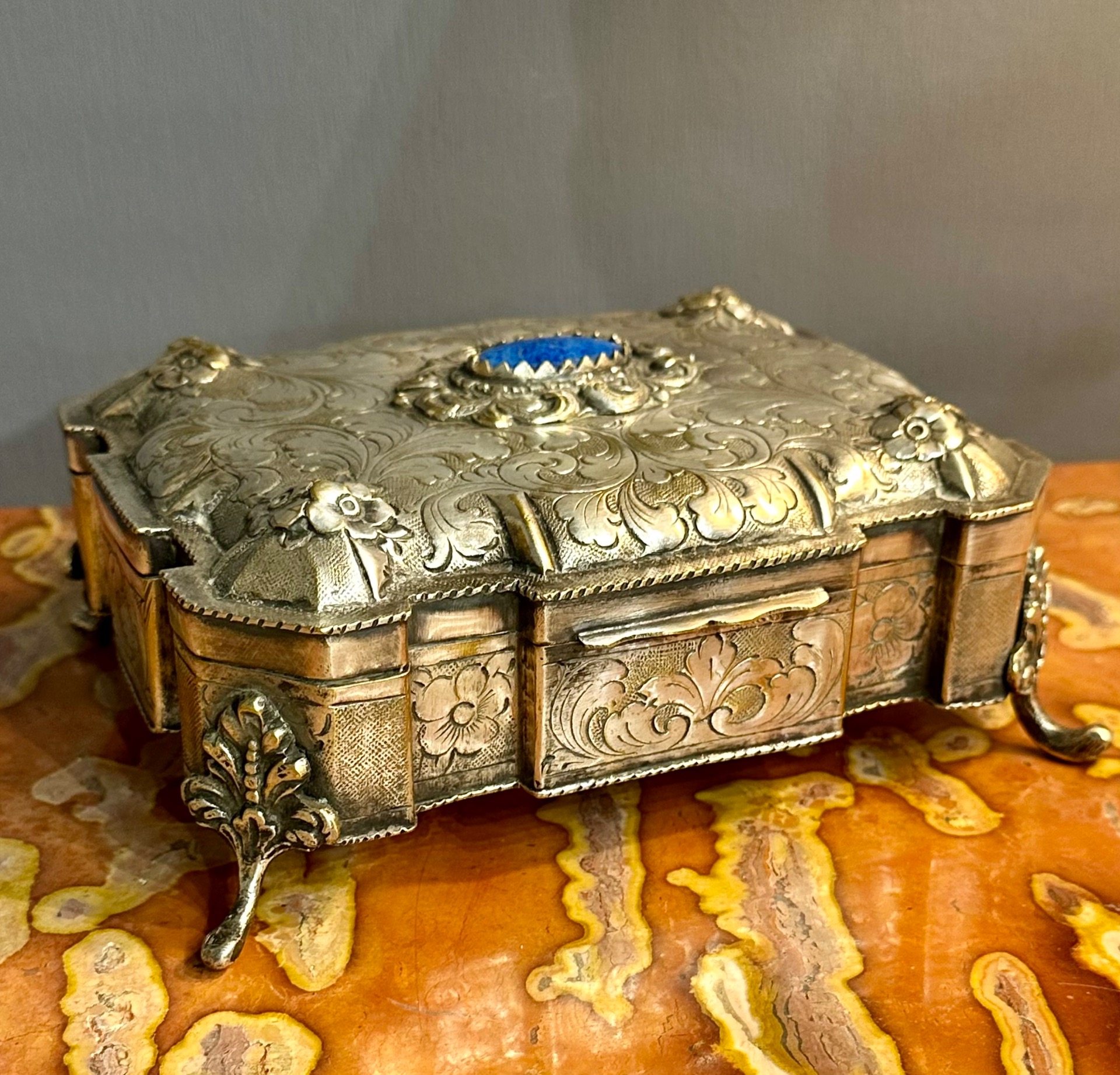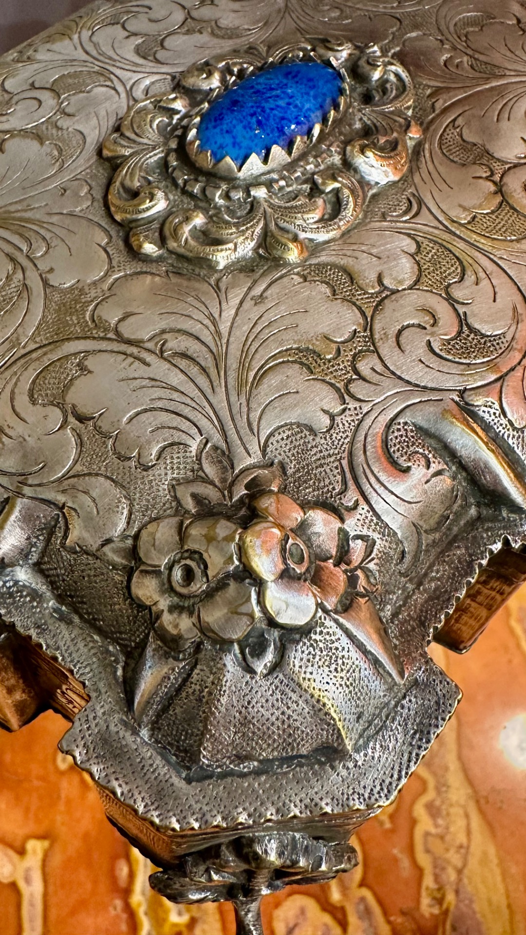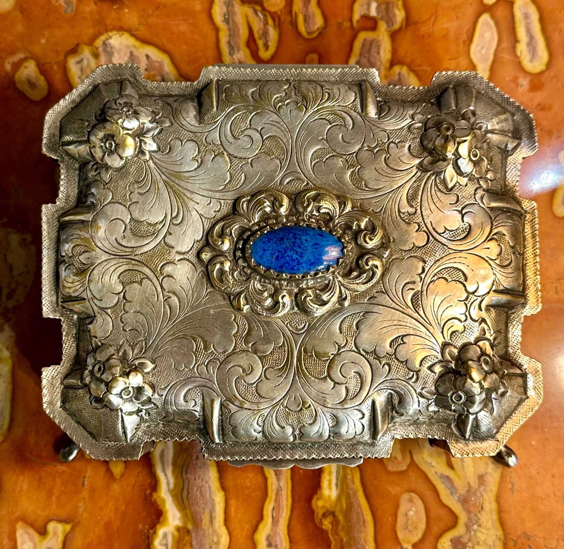 Scatola in metallo argentato finemente cesellata con pietra blu Europa, XIX secolo