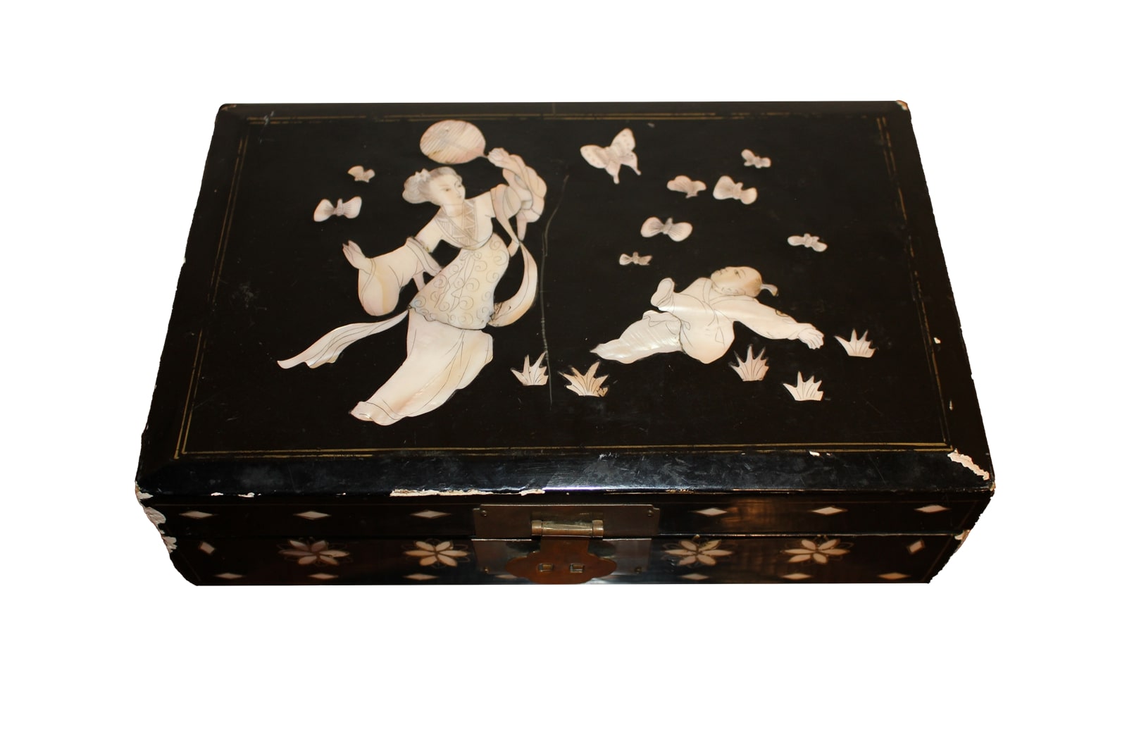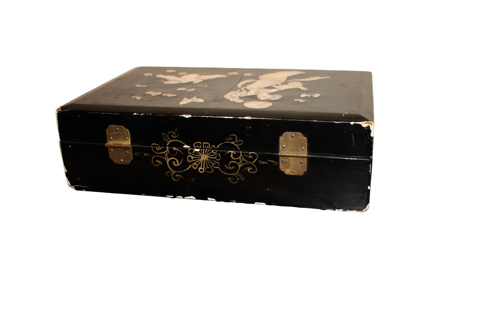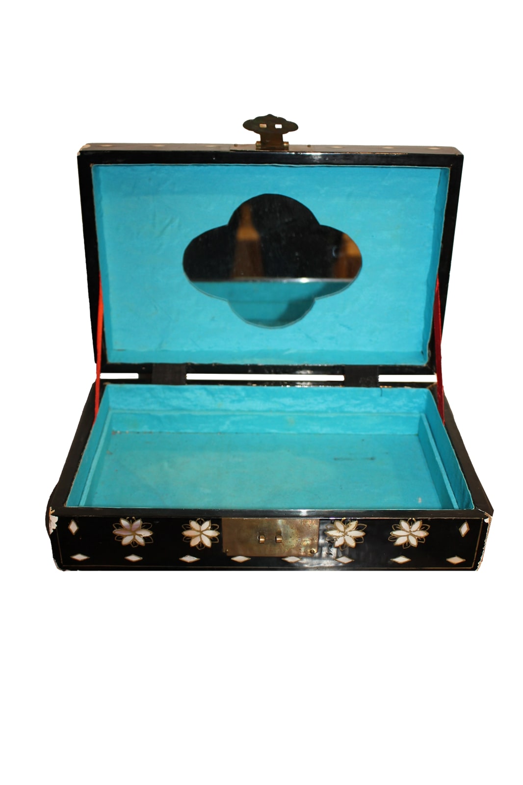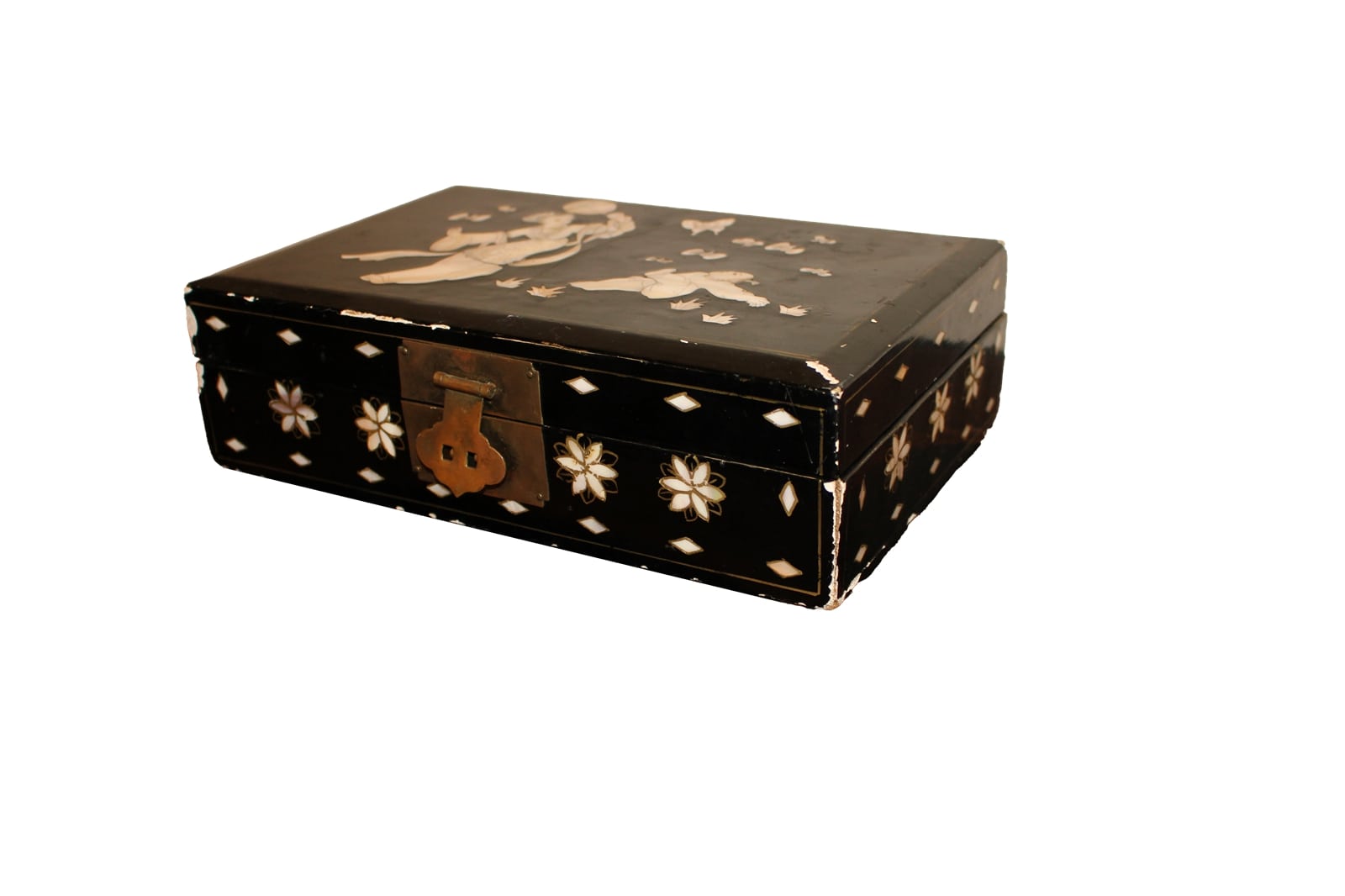 Scatola di gusto orientale in legno laccato ebanizzato ornato da figura in madreperla sul piano. L'interno è rifinito con panno azzurro e specchietto.