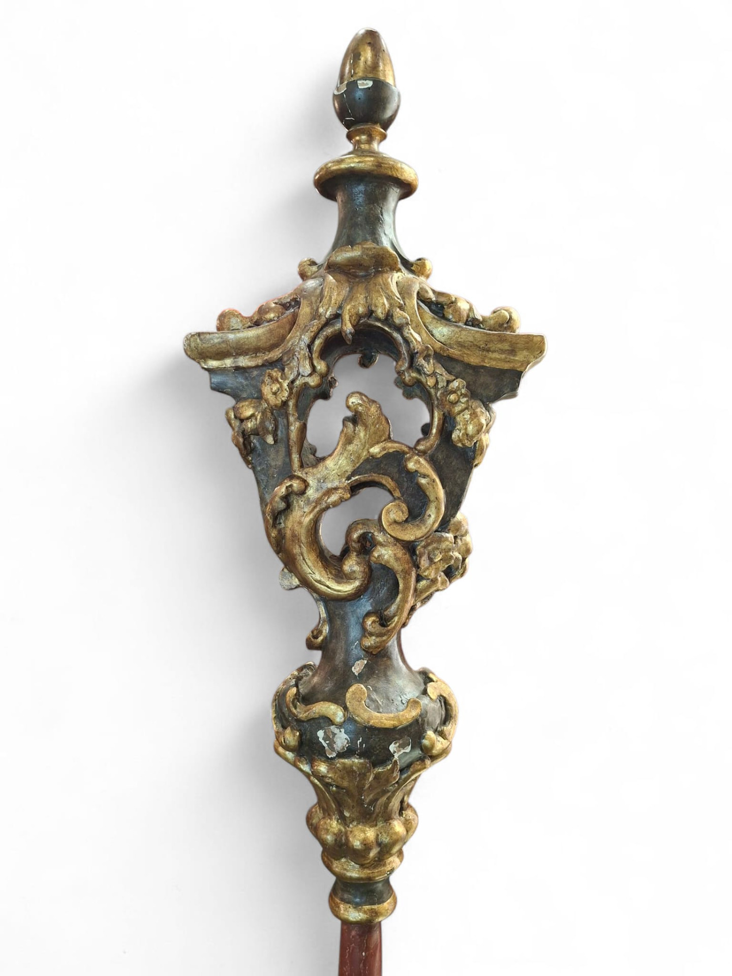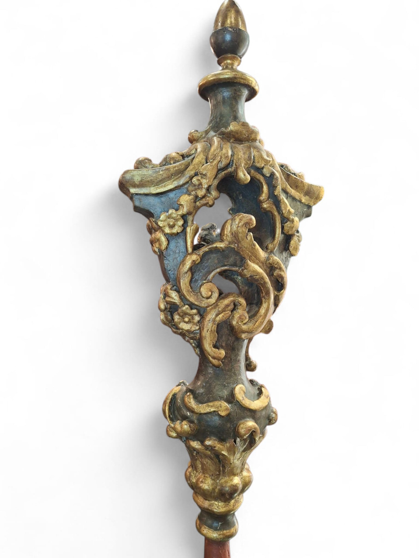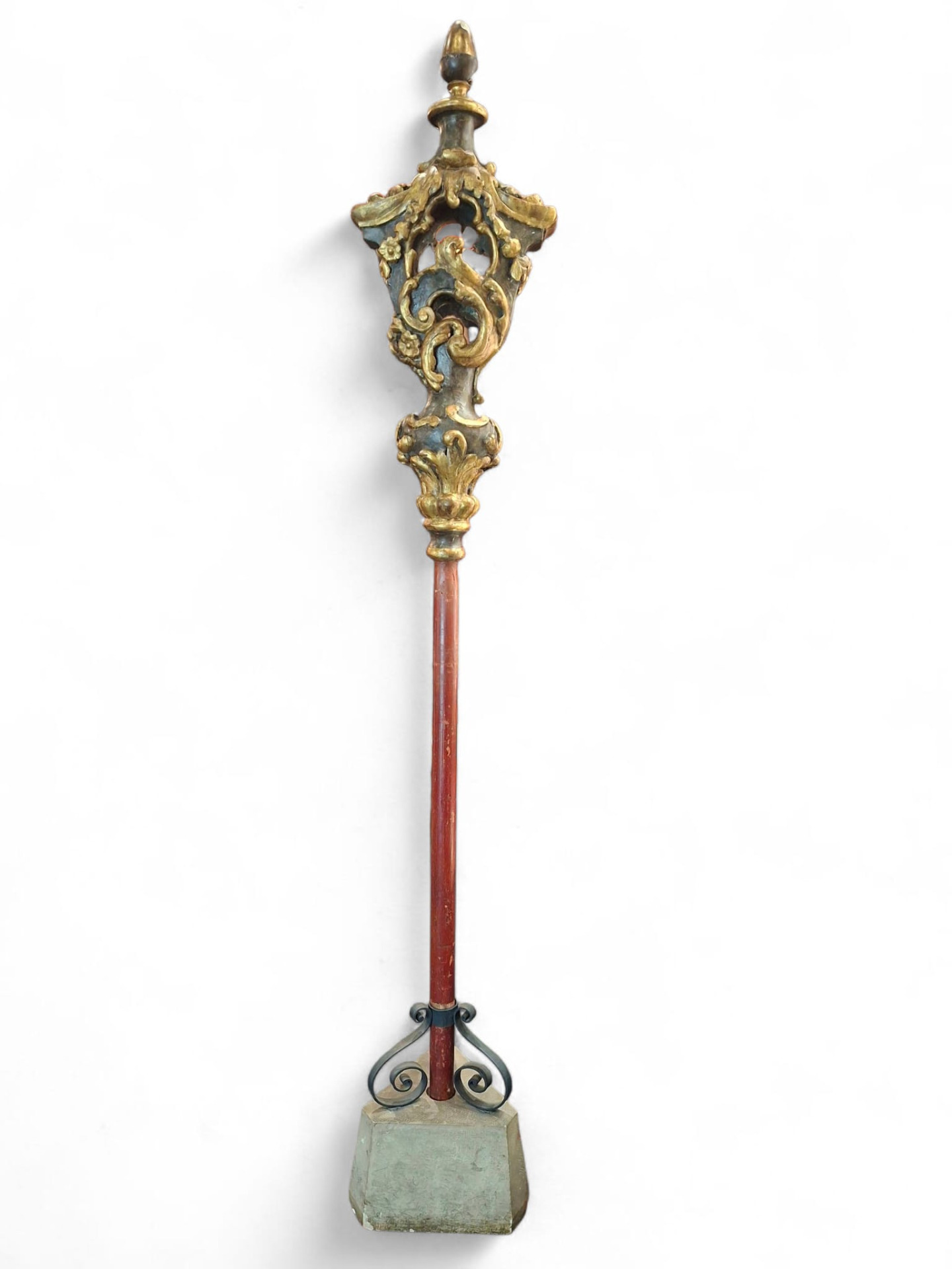 Tintinnabolo in legno intagliato dorato e laccato, con base in pietra e ferro, epoca XVII secolo, altezza complessiva 196 cm, la base ingombra 23x26 cm, senza campana.