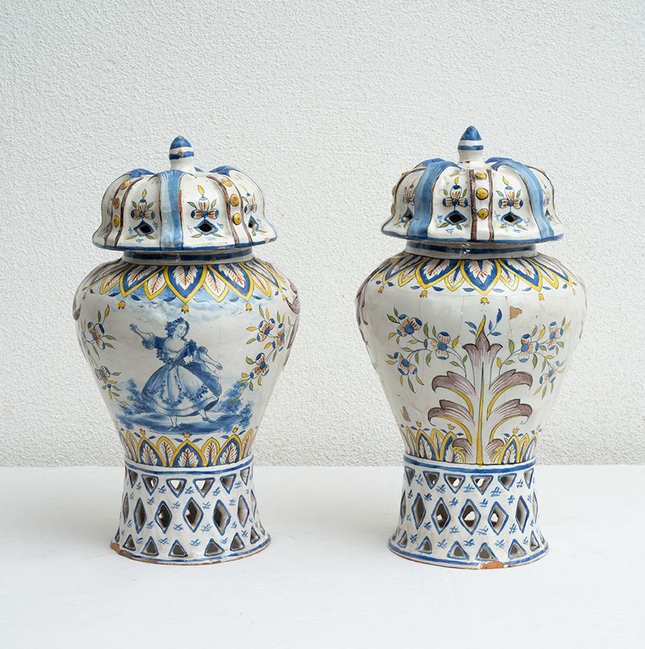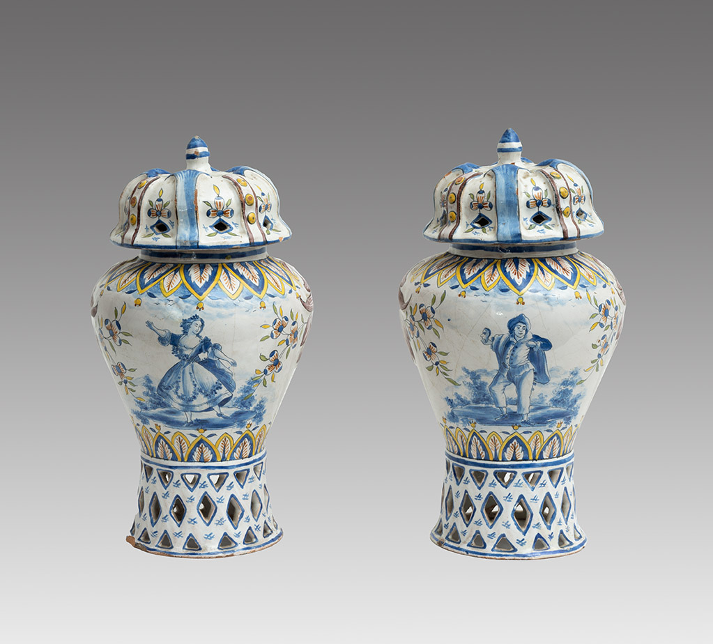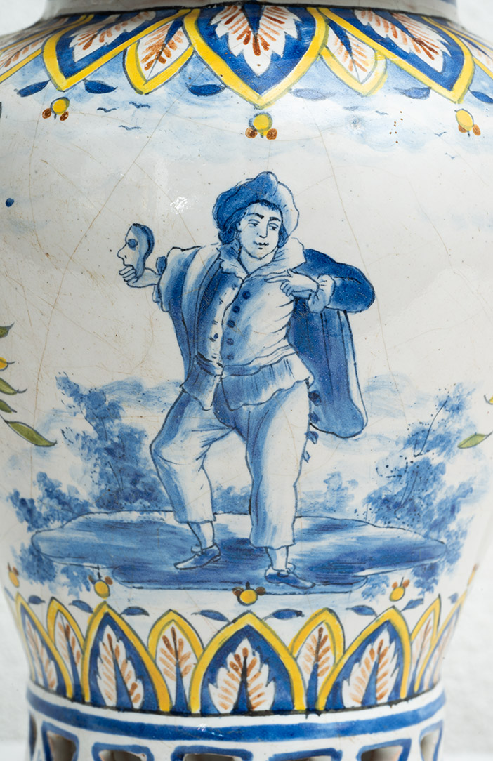 Coppia di vasi antichi in porcellana policroma raffigurante scene carnascialesche. Venezia XVIII secolo.