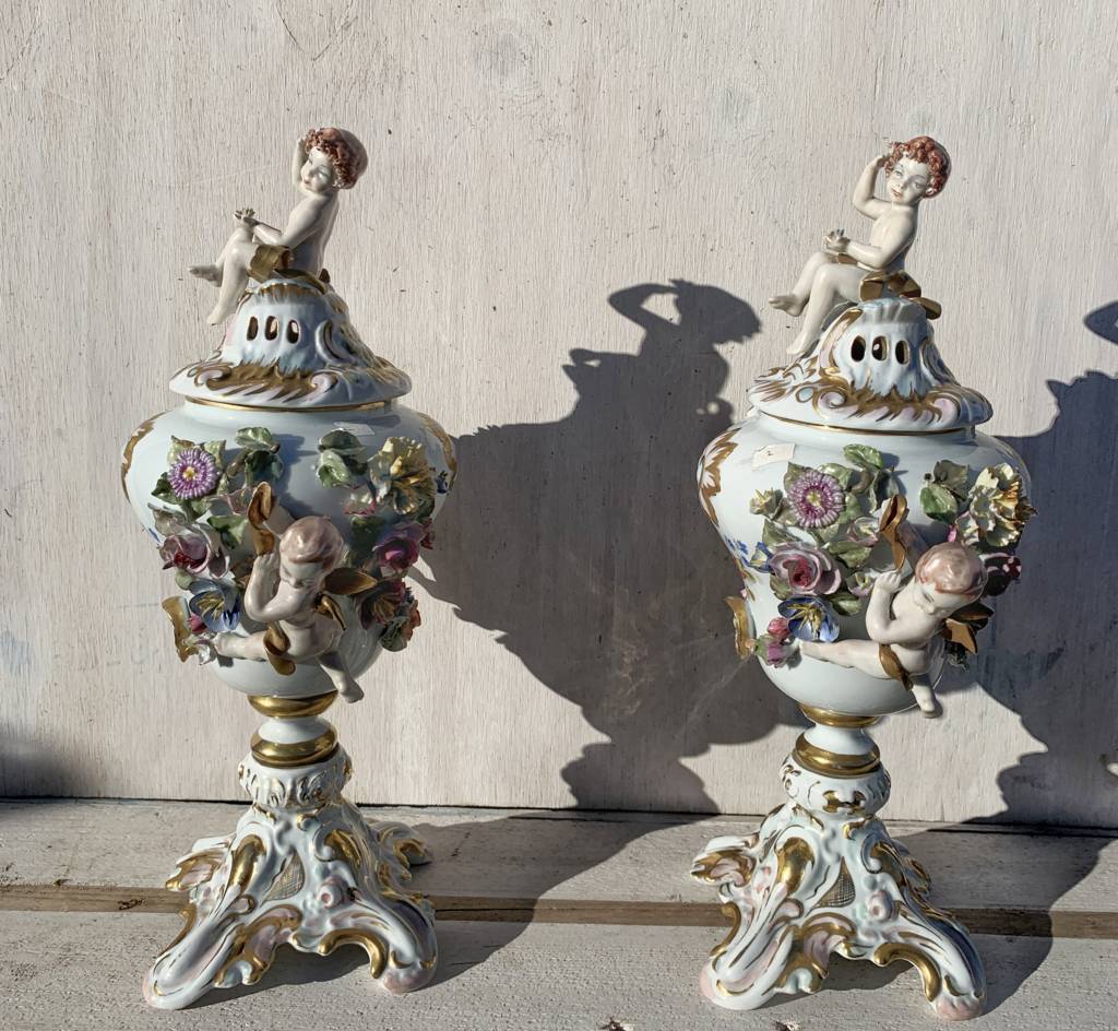 Coppia di vasi brucia-incenso in porcellana policroma. Capodimonte, XIX secolo.