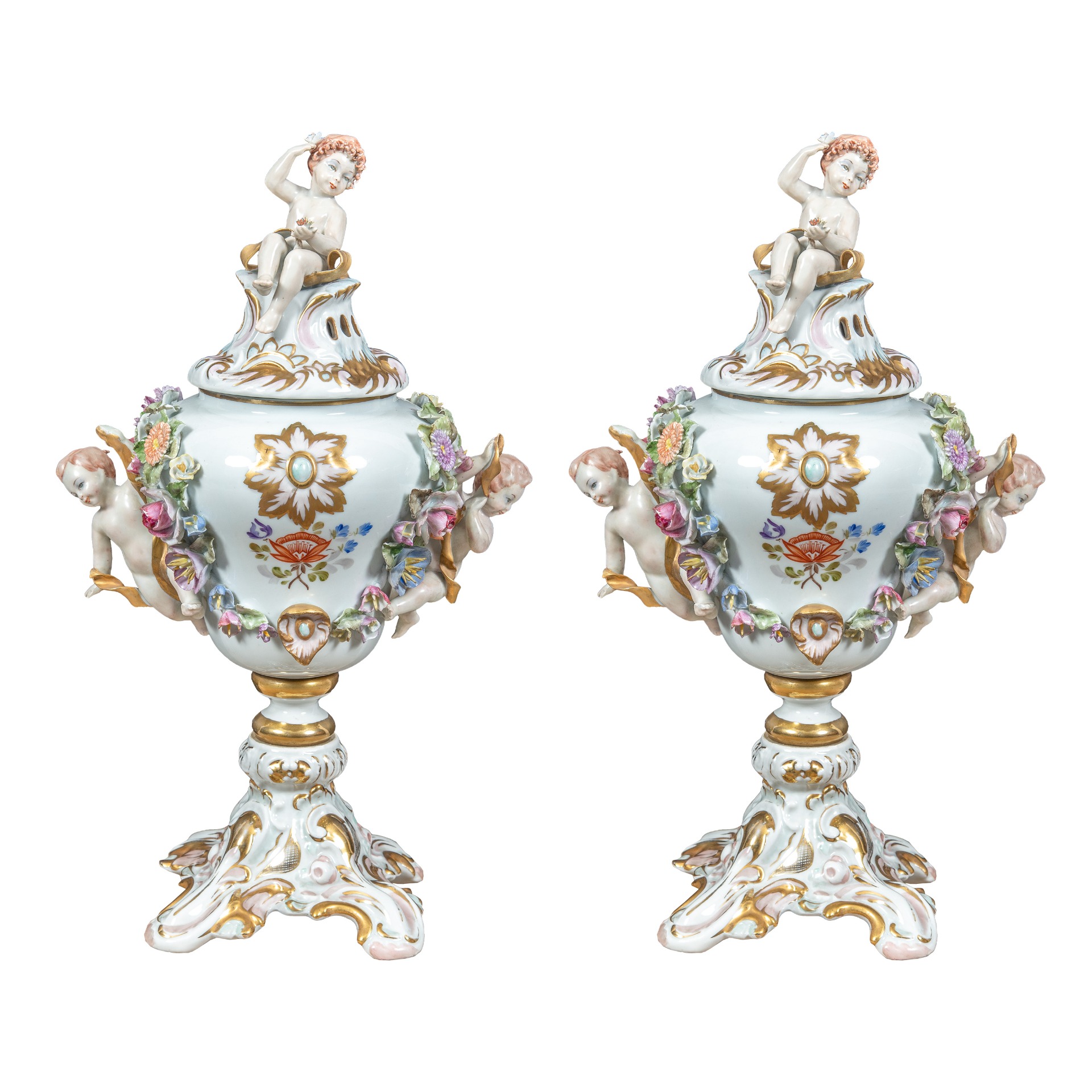 Coppia di vasi brucia-incenso in porcellana policroma. Capodimonte, XIX secolo. 23 x 16 x h 40 cm cad. Manifattura Capodimonte di primo Ottocento. Realizzate interamente in porcellana dorata e dipinta, con decorazioni di stile Rococò a ghirlande floreali e putti. Marchiate sotto alla base....