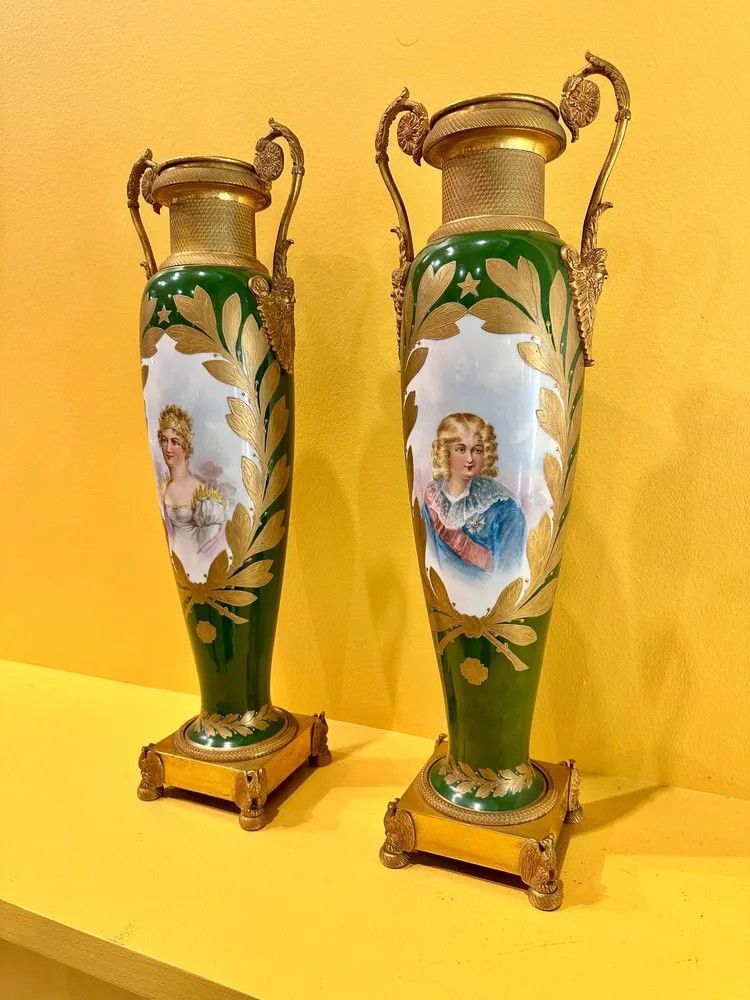 Questa preziosa coppia di vasi Direttorio testimonia l’altissima qualità raggiunta dalle manifatture parigine alla fine del XVIII secolo, nel passaggio dal gusto Luigi XVI al nascente Stile Impero. I corpi, in porcellana dura francese, presentano un intenso fondo verde "vert Empire" sul quale spiccano ampie riserve ovali con ritratti femminili a smalti policromi di raffinata fattura: le acconciature alla greca e i drappeggi all’antica rimandano all’ideale di virtù repubblicana tipico dell’epoca.Le riserve sono incorniciate da ghirlande di alloro dorato culminanti nella stella a cinque punte, emblema del potere consolare. Il collo è avvolto da una fascia in bronzo dorato a mercurio con fitti motivi guilloché, mentre le anse a voluta terminano in una rosetta e si innestano sul vaso tramite mascheroni bacchici – probabile allusione a Pan – finemente cesellati.Porcellana smaltata, manifattura francese, c. 1795-1800Montature in bronzo dorato, tecnica amati & bruniDecoro a foglie di alloro, stella consolare e piccoli fiori a rilievoBasi quadrangolari in bronzo con aquile imperiali scolpite agli angoliPalette cromatica: verde bottiglia, oro zecchino, pastelli delicatiStato di conservazione eccellente; dorature originaliL’insieme esprime il rigore neoclassico del Direttorio unito alla solennità simbolica che prelude all’Impero napoleonico. Oggetti rari, ideali per arricchire saloni, console o biblioteche di gusto storico. La qualità delle montature suggerisce l’intervento di importanti bronzieri parigini quali Claude Galle o Pierre-Philippe Thomire, in dialogo con officine di porcellana come Sèvres o Darlot & Honoré. Un capolavoro di arti decorative francesi da collezione.Stile: Impero Materiale: PorcellanaAltezza (cm): 68Larghezza (cm): 21Profondità (cm): 15Epoca: XVIII Secolo - 1700