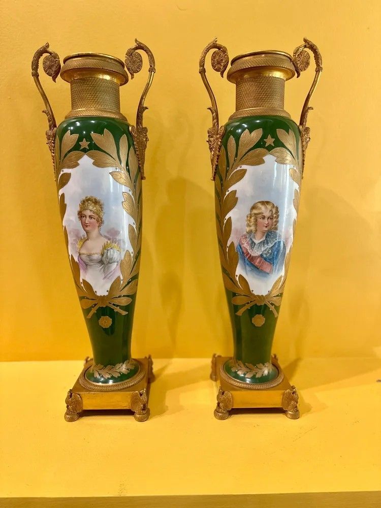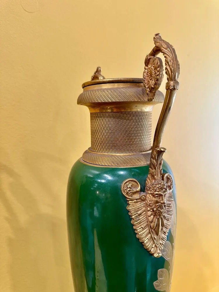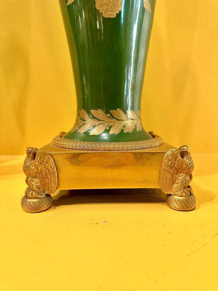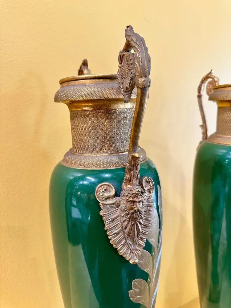 Coppia di vasi Direttorio in porcellana verde e bronzo dorato