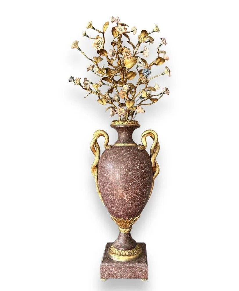 Questa Coppia di Vasi in porfido e bronzo dorato rappresenta l'eleganza senza tempo della Manifattura Francese del XIX Secolo. Caratterizzati da manici serpentiformi in bronzo, offrono un fascino unico e imperdibile. Decorati con fiorellini in porcellana, questi vasi uniscono arte e artigianato di altissimo livello. Materiali pregiati: combinazione di porfido, bronzi dorati e porcellana. Design unico: riflesso dell'eleganza delle manifatture francesi del XIX secolo. Dettagli raffinati: manici impareggiabili e decorazioni in bronzo. Offri ai tuoi ambienti un tocco di classe con questa straordinaria coppia di vasi, perfetta per i collezionisti e gli amanti dell'arte antica.Stile: Napoleone IIIMateriale: Marmo/PietraAltezza (cm): 90Epoca: XIX Secolo - 1800