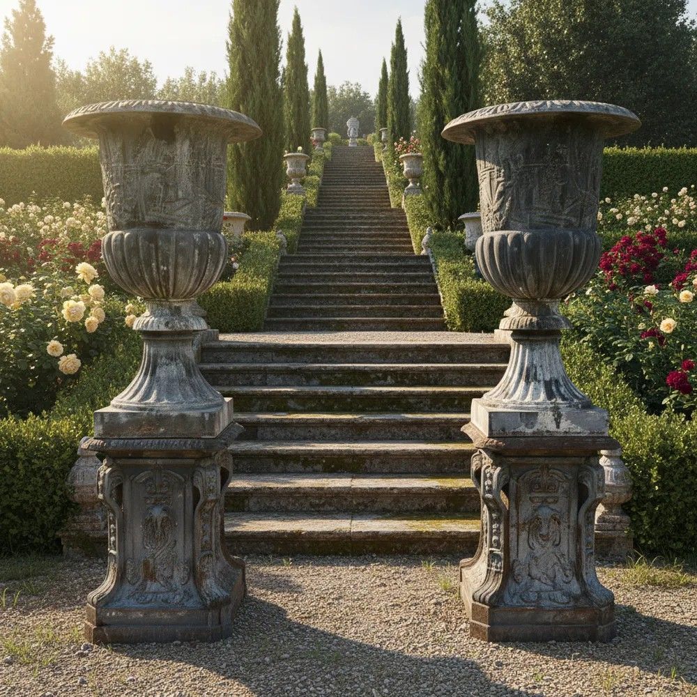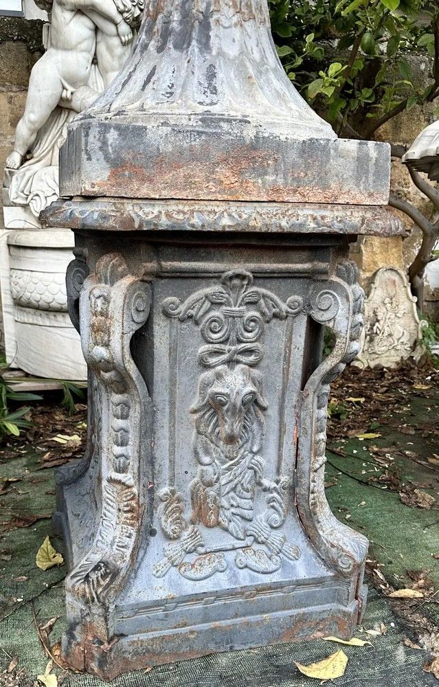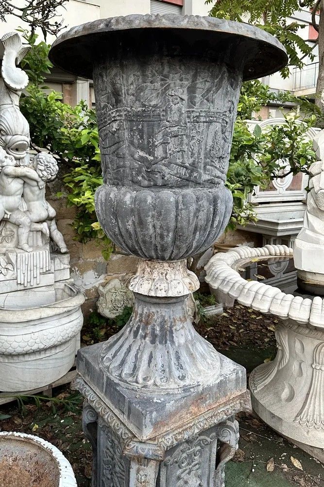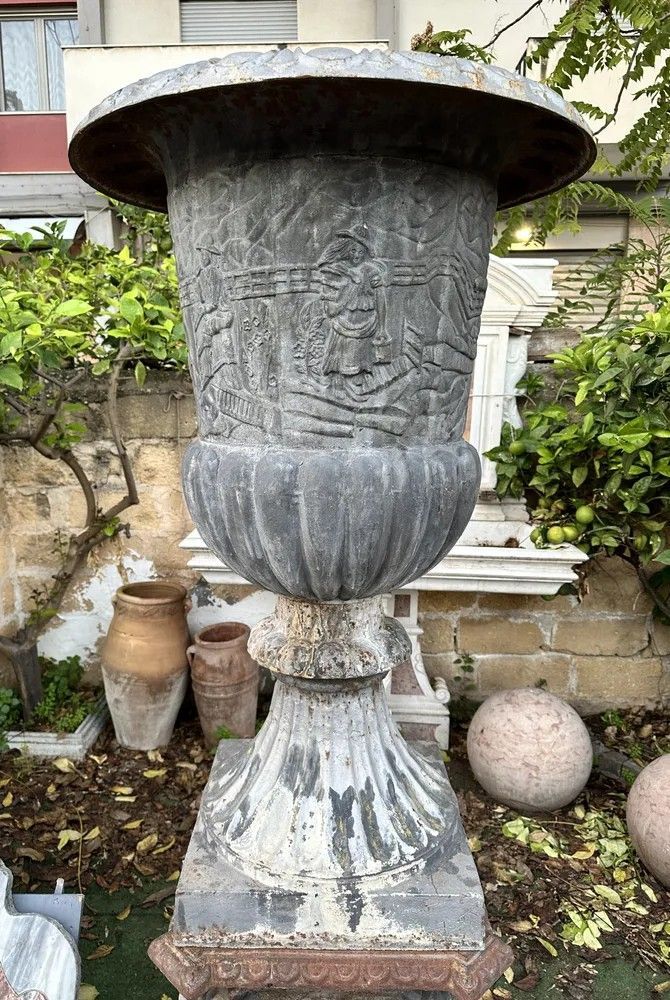 Questa raffinata coppia di vasi in ghisa con relative basi proviene dall’Italia dei primi anni del ’900 e rappresenta un raro esempio di arte di fonderia destinata all’arredo di giardini storici. Le proporzioni importanti e il peso generoso conferiscono immediata autorevolezza a qualunque contesto paesaggistico.Il corpo dell’urna, a bocca svasata, è impreziosito da pannelli a rilievo che raccontano scene pastorali: figure in abiti rurali, ponticelli e fronde stilizzate emergono da una superficie che il tempo ha rivestito di una nobile patina grigio-piombo punteggiata da lievi ossidazioni ramate.La parte inferiore presenta baccellature profonde che proseguono nel collo scanalato della base. Quest’ultima, dall’elegante profilo scultoreo, è decorata con cartocci, volute e mascheroni neo-barocchi messi in risalto dal contrasto fra le ombre e le leggere tracce di antica vernice bianca.L’assemblaggio è composto da due elementi separabili (urna + piedistallo) per agevolare lo spostamento e la manutenzione. L’interno, non forato in origine, può essere facilmente drenato qualora si desideri utilizzarlo come fioriera.Epoca: primo XX secolo Provenienza: Italia, fonderia artisticaMateriale: ghisa pienaCondizioni: ottima stabilità strutturale, patina originale, piccole tracce di ruggine coerenti con l’etàUso consigliato: ingressi scenografici, viali alberati, corti interne, terrazze panoramicheInserire questi vasi nel proprio spazio verde significa aggiungere carattere, storia e fascino mediterraneo: la materia antica dialoga con il fogliame, la luce scivola sulle modanature e il giardino si trasforma in un romantico teatro all’aperto.Materiale: GhisaAltezza (cm): 205Larghezza (cm): 60Profondità (cm): 60Diametro: 85Epoca: XX Secolo - 1900