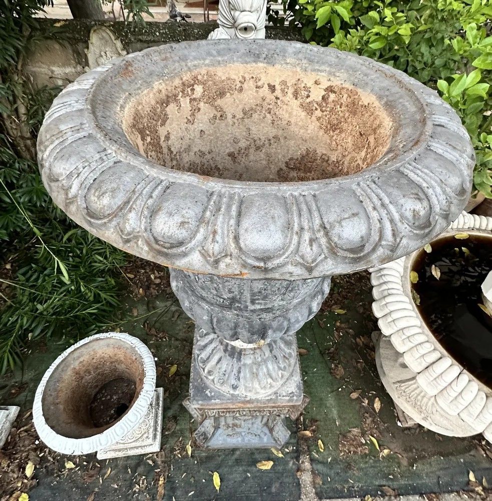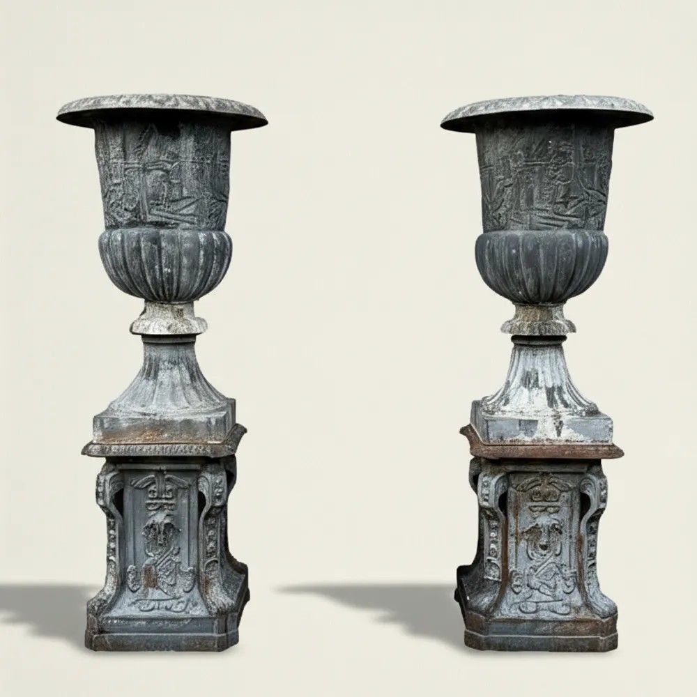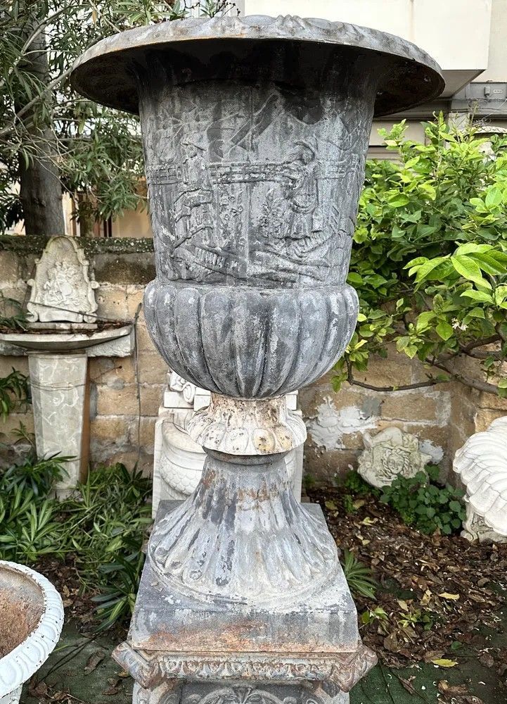 Questa raffinata coppia di vasi in ghisa con relative basi proviene dall’Italia dei primi anni del ’900 e rappresenta un raro esempio di arte di fonderia destinata all’arredo di giardini storici. Le proporzioni importanti e il peso generoso conferiscono immediata autorevolezza a qualunque contesto paesaggistico.Il corpo dell’urna, a bocca svasata, è impreziosito da pannelli a rilievo che raccontano scene pastorali: figure in abiti rurali, ponticelli e fronde stilizzate emergono da una superficie che il tempo ha rivestito di una nobile patina grigio-piombo punteggiata da lievi ossidazioni ramate.La parte inferiore presenta baccellature profonde che proseguono nel collo scanalato della base. Quest’ultima, dall’elegante profilo scultoreo, è decorata con cartocci, volute e mascheroni neo-barocchi messi in risalto dal contrasto fra le ombre e le leggere tracce di antica vernice bianca.L’assemblaggio è composto da due elementi separabili (urna + piedistallo) per agevolare lo spostamento e la manutenzione. L’interno, non forato in origine, può essere facilmente drenato qualora si desideri utilizzarlo come fioriera.Epoca: primo XX secolo Provenienza: Italia, fonderia artisticaMateriale: ghisa pienaCondizioni: ottima stabilità strutturale, patina originale, piccole tracce di ruggine coerenti con l’etàUso consigliato: ingressi scenografici, viali alberati, corti interne, terrazze panoramicheInserire questi vasi nel proprio spazio verde significa aggiungere carattere, storia e fascino mediterraneo: la materia antica dialoga con il fogliame, la luce scivola sulle modanature e il giardino si trasforma in un romantico teatro all’aperto.Materiale: GhisaAltezza (cm): 205Larghezza (cm): 60Profondità (cm): 60Diametro: 85Epoca: XX Secolo - 1900