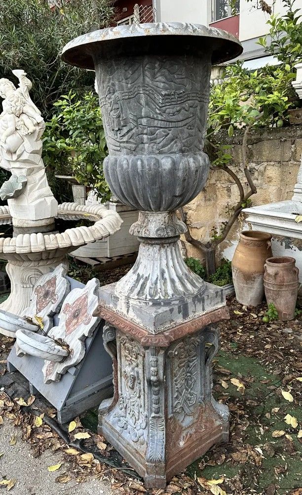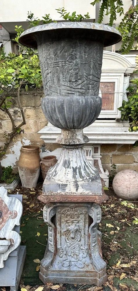 Questa raffinata coppia di vasi in ghisa con relative basi proviene dall’Italia dei primi anni del ’900 e rappresenta un raro esempio di arte di fonderia destinata all’arredo di giardini storici. Le proporzioni importanti e il peso generoso conferiscono immediata autorevolezza a qualunque contesto paesaggistico.Il corpo dell’urna, a bocca svasata, è impreziosito da pannelli a rilievo che raccontano scene pastorali: figure in abiti rurali, ponticelli e fronde stilizzate emergono da una superficie che il tempo ha rivestito di una nobile patina grigio-piombo punteggiata da lievi ossidazioni ramate.La parte inferiore presenta baccellature profonde che proseguono nel collo scanalato della base. Quest’ultima, dall’elegante profilo scultoreo, è decorata con cartocci, volute e mascheroni neo-barocchi messi in risalto dal contrasto fra le ombre e le leggere tracce di antica vernice bianca.L’assemblaggio è composto da due elementi separabili (urna + piedistallo) per agevolare lo spostamento e la manutenzione. L’interno, non forato in origine, può essere facilmente drenato qualora si desideri utilizzarlo come fioriera.Epoca: primo XX secolo Provenienza: Italia, fonderia artisticaMateriale: ghisa pienaCondizioni: ottima stabilità strutturale, patina originale, piccole tracce di ruggine coerenti con l’etàUso consigliato: ingressi scenografici, viali alberati, corti interne, terrazze panoramicheInserire questi vasi nel proprio spazio verde significa aggiungere carattere, storia e fascino mediterraneo: la materia antica dialoga con il fogliame, la luce scivola sulle modanature e il giardino si trasforma in un romantico teatro all’aperto.Materiale: GhisaAltezza (cm): 205Larghezza (cm): 60Profondità (cm): 60Diametro: 85Epoca: XX Secolo - 1900