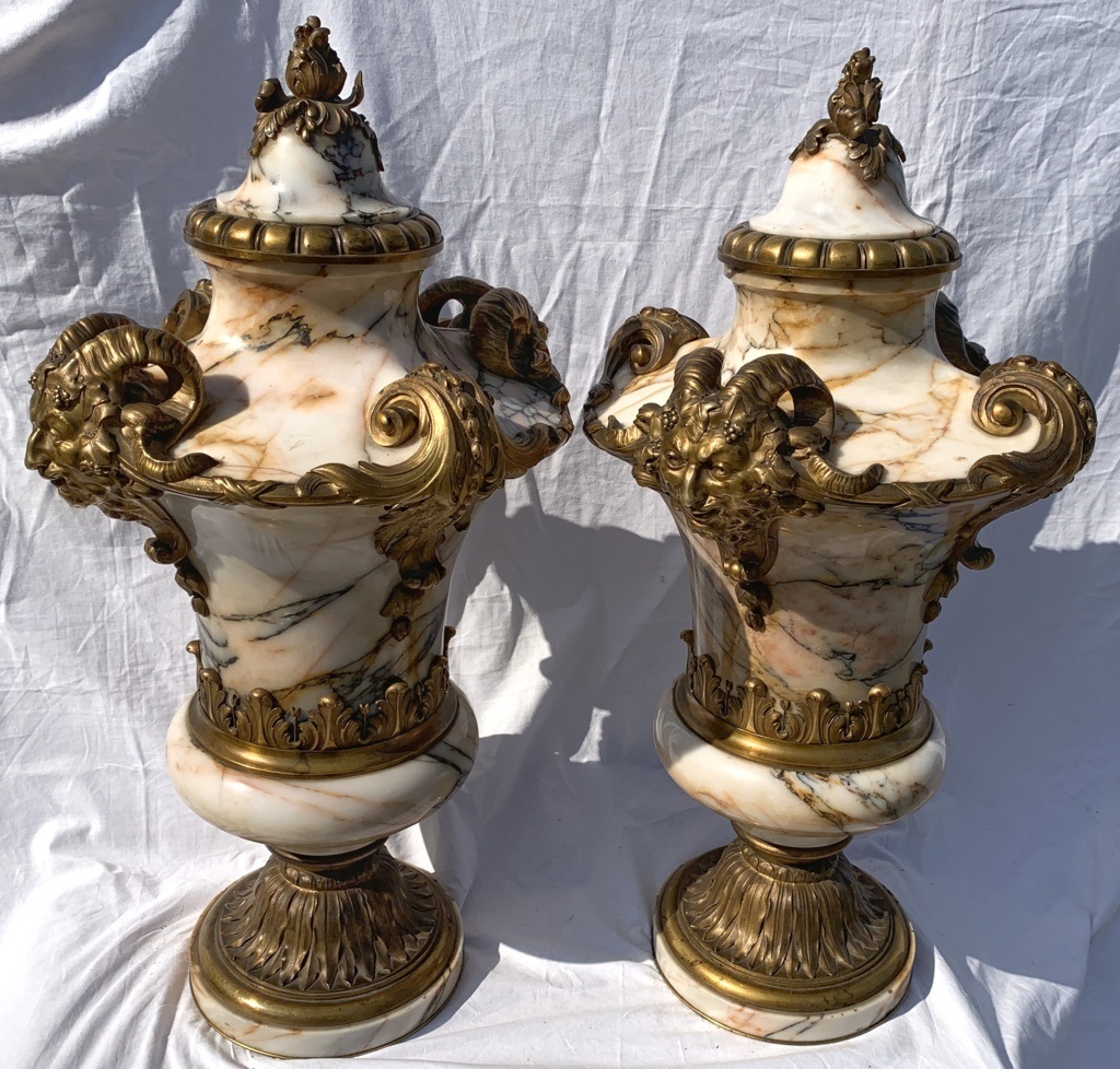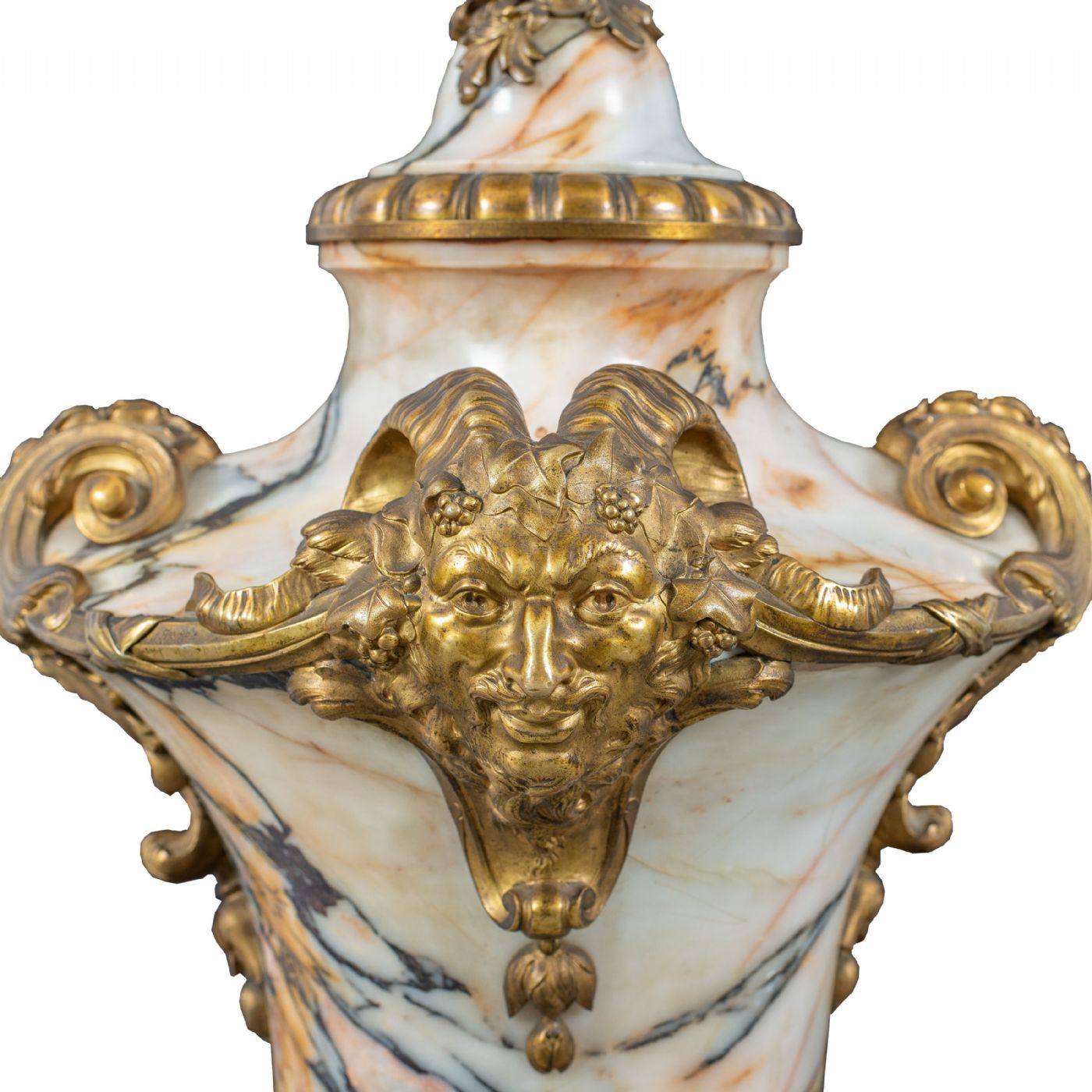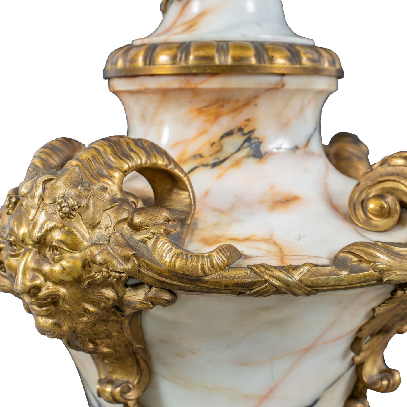 Coppia di vasi in marmo e bronzo dorato - Fonderia Susse Frères - Parigi, XIX secolo. 35 x 35 x h 66 cm. Realizzati interamente in marmo venato e bronzo dorato finemente cesellato. Decorazioni di gusto Luigi XV raffiguranti un trionfo di foglie d’acanto, palmette e due teste di satiro. -...