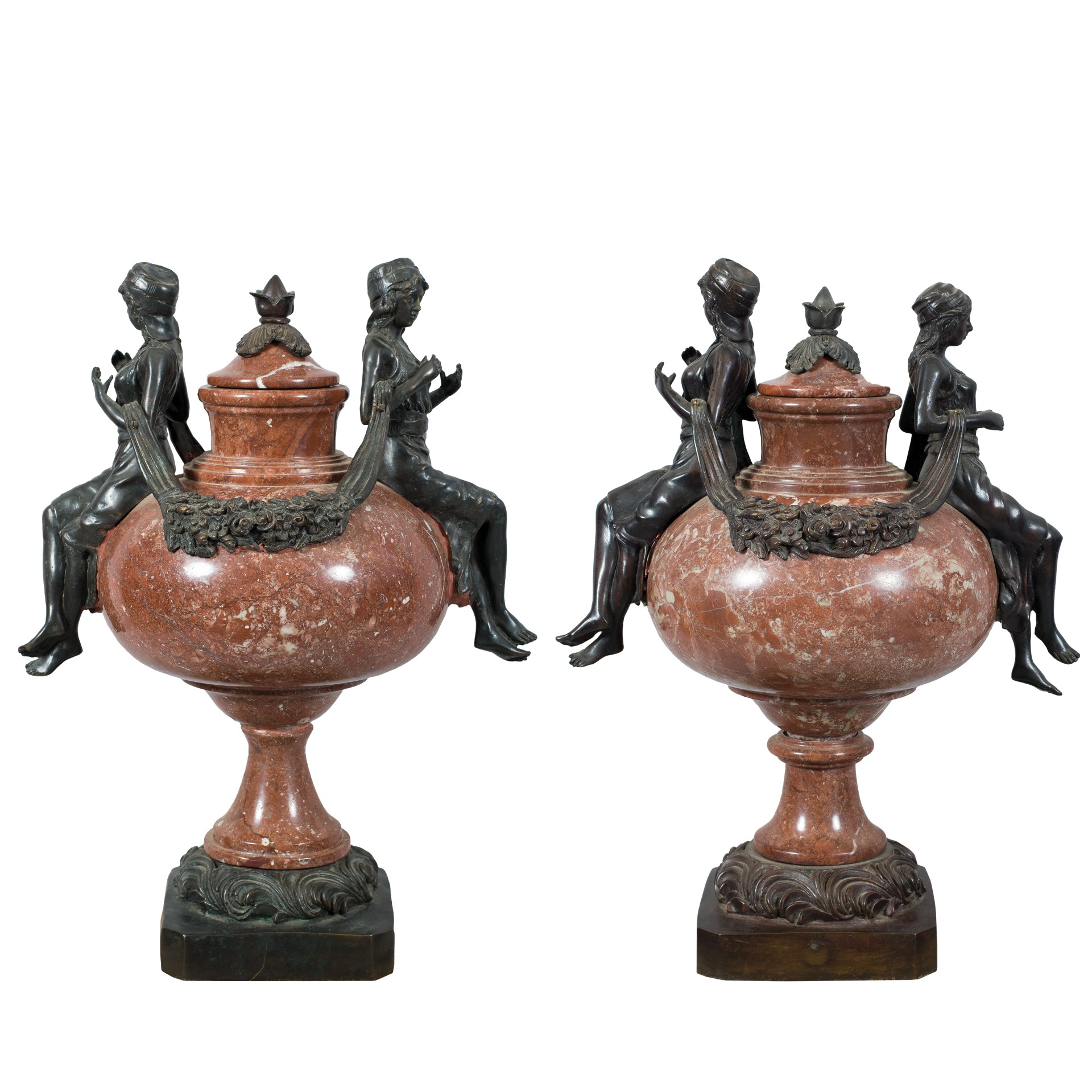 Coppia di vasi in marmo rosso e bronzo. Italia, fine XIX secolo.