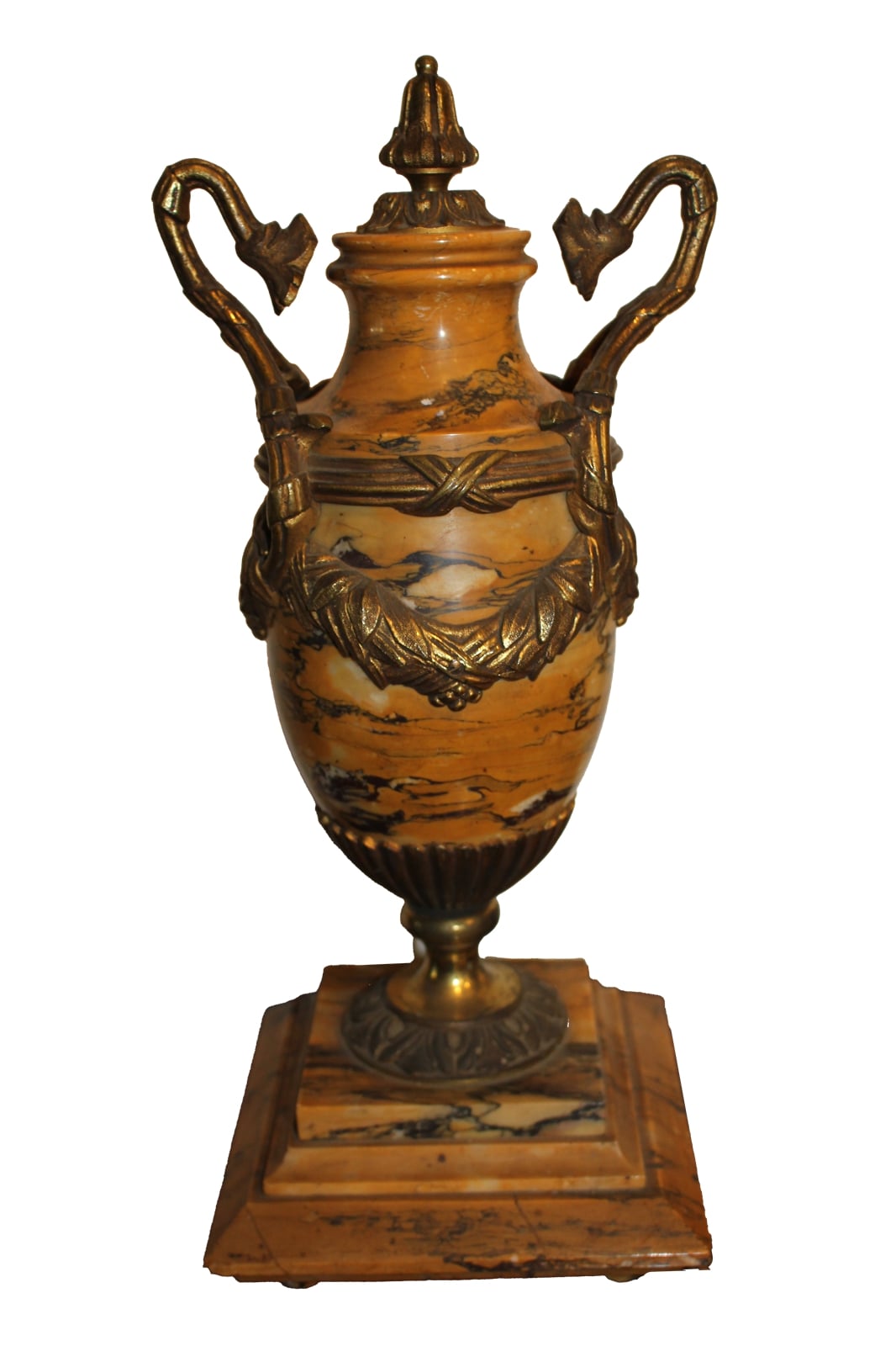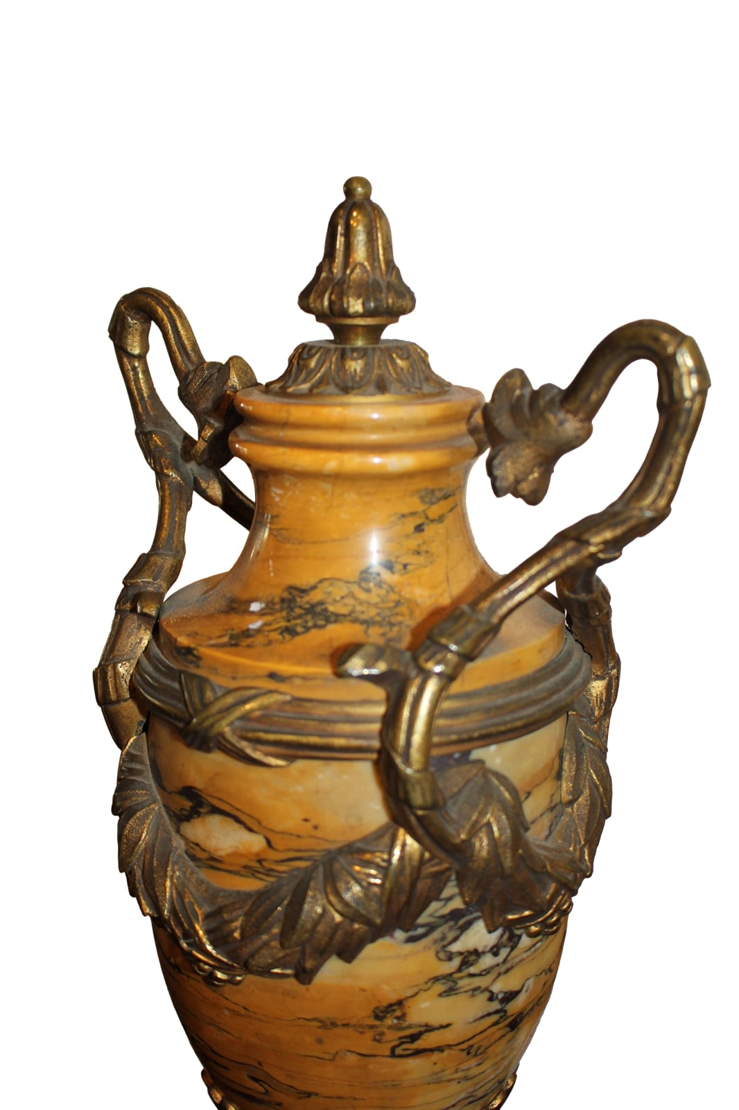 Coppia di vasi in stile Impero realizzati in marmo giallo siena con ricche applicazioni in bronzo dorato di fine '800. Provenienza: Francia Epoca: fine XIX secolo Dimensioni: 17x17 h. 41