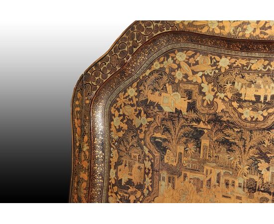 Bellissimo vassoio francese di metà 1800, di gusto orientale, in legno. Presenta sul fronte ricche decorazioni color oro raffigurante veduta cittadina e scene di vita quotidiana orientali; retro laccato.