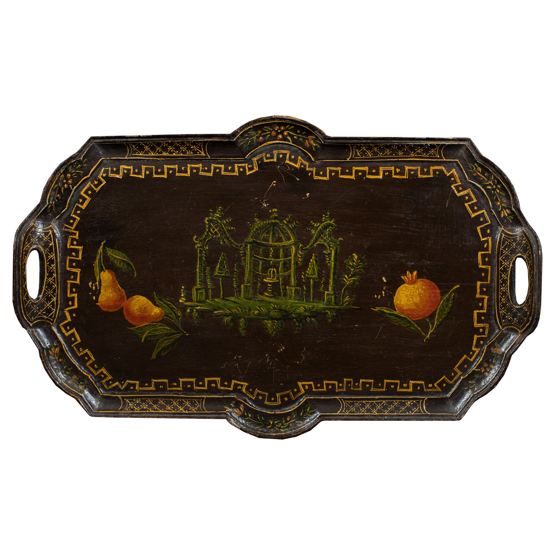 Vassoio in legno laccato e dipinto. Venezia, XVIII secolo. 40 x 64 cm. Interamente in legno laccato e dipinto a motivi orientaleggianti su fondo color bruno. Al centro rappresentazioni di frutta e un tempietto. - Tutte le spedizioni in UE sono gratuite ed imballate professionalmente. - Ogni...