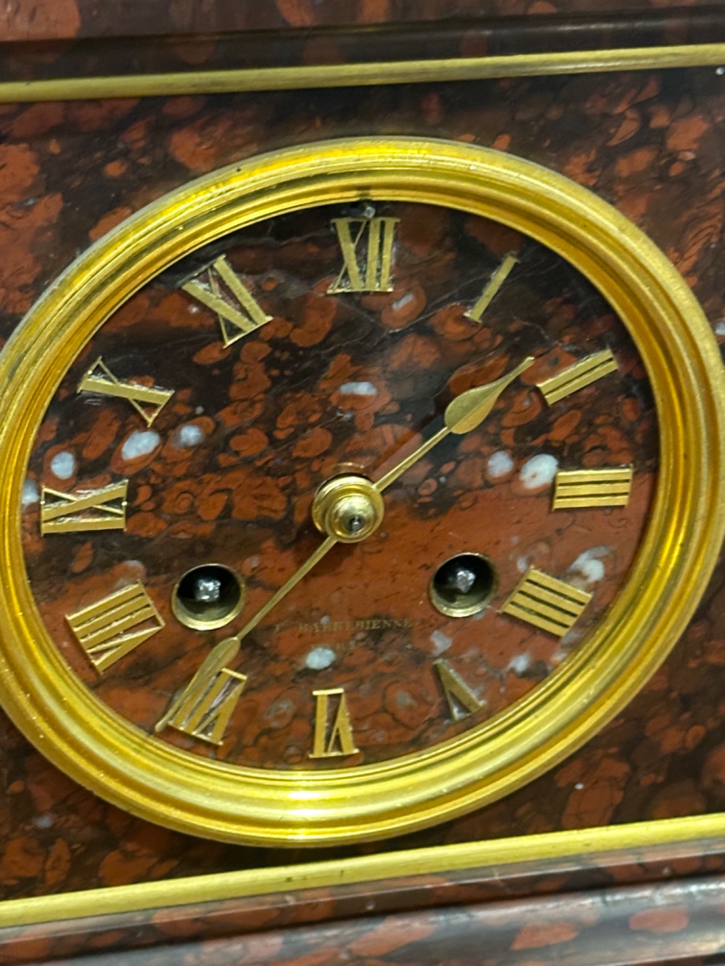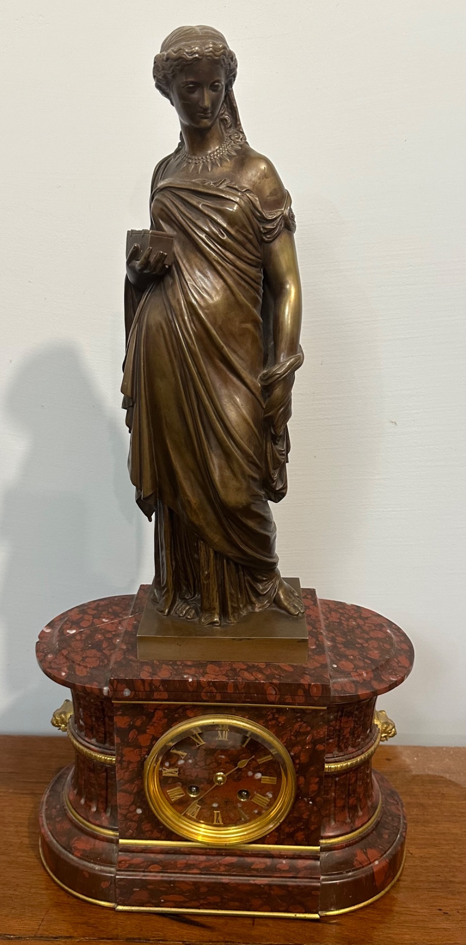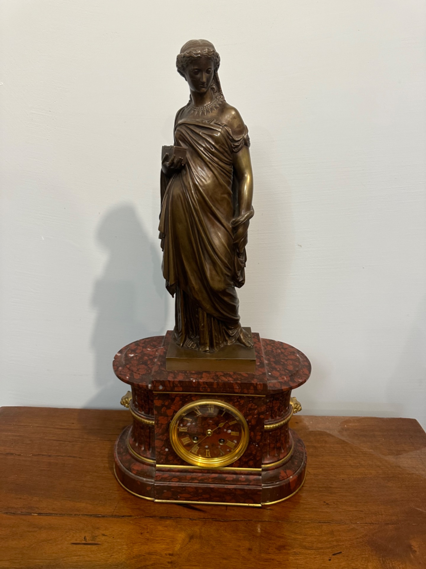 Orologio a pendolo in marmo rosso con bronzo sulla parte superiore raffigurante una vestale . Sia il bronzo che l'orologio sono firmati in ottime condizioni . Misure altezza 60 cm circa largo 35 cm di manifattura francese epoca meta 800