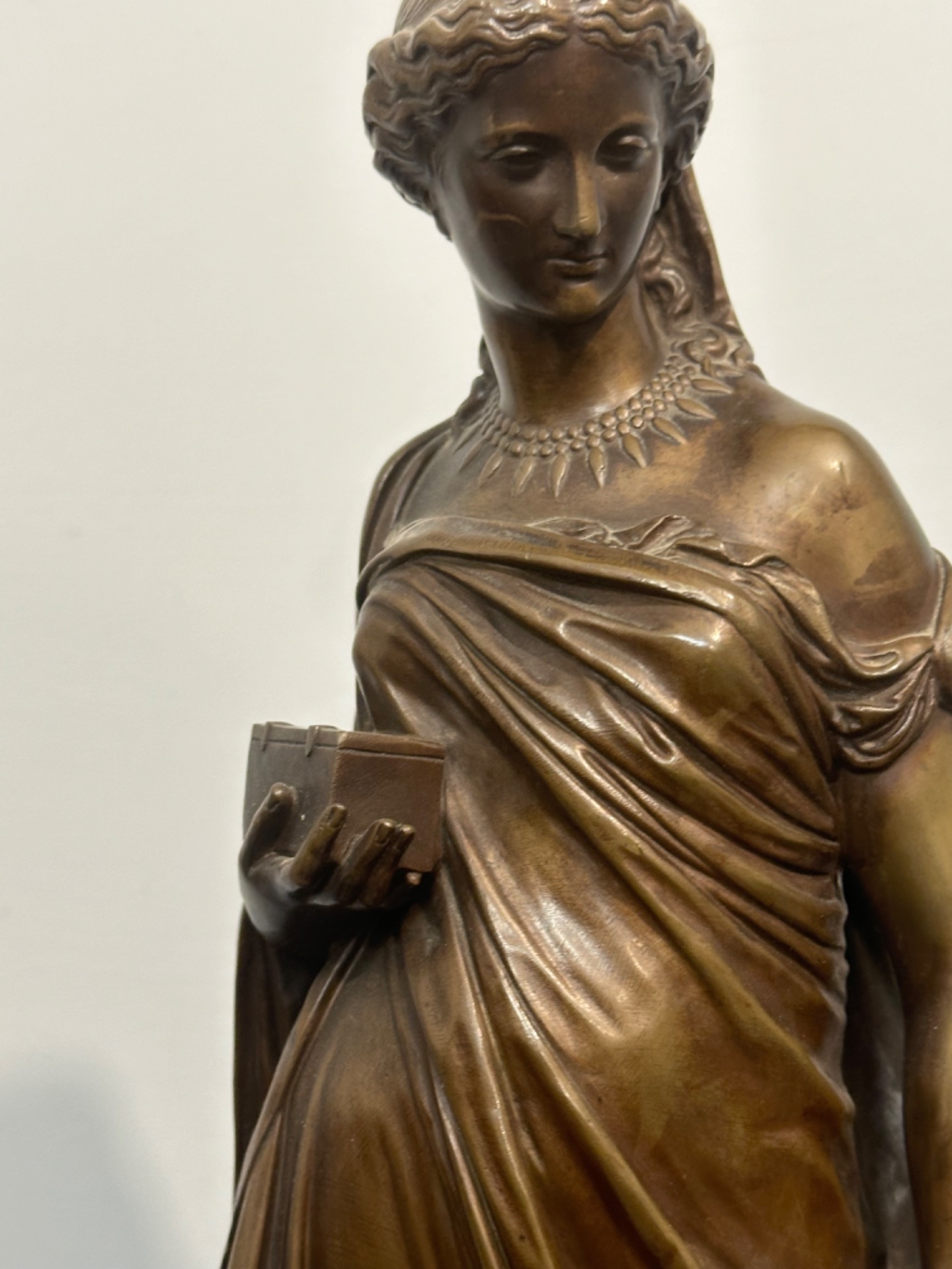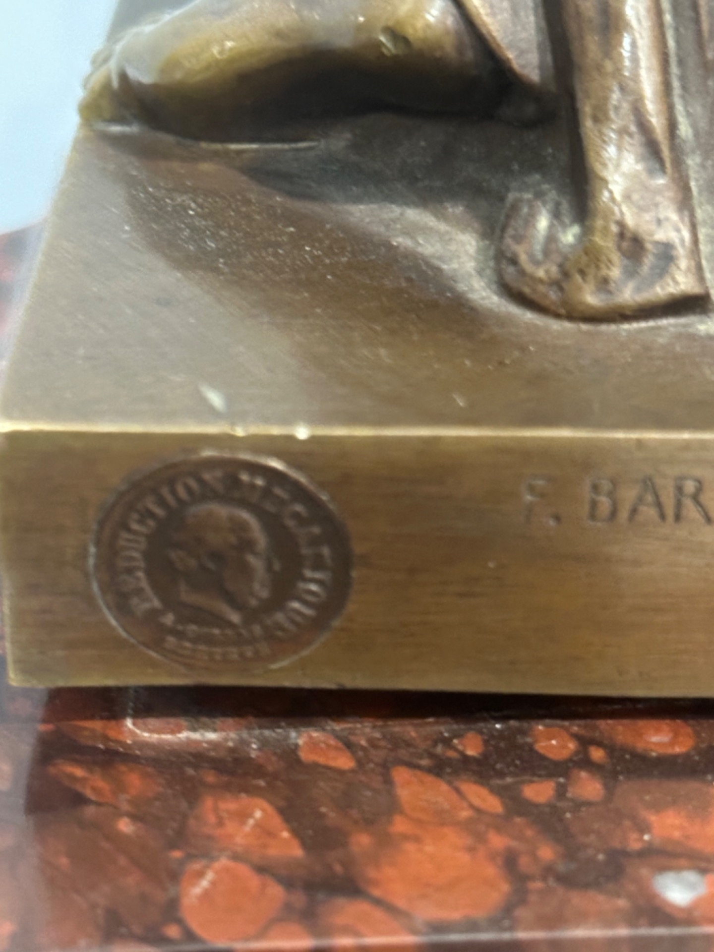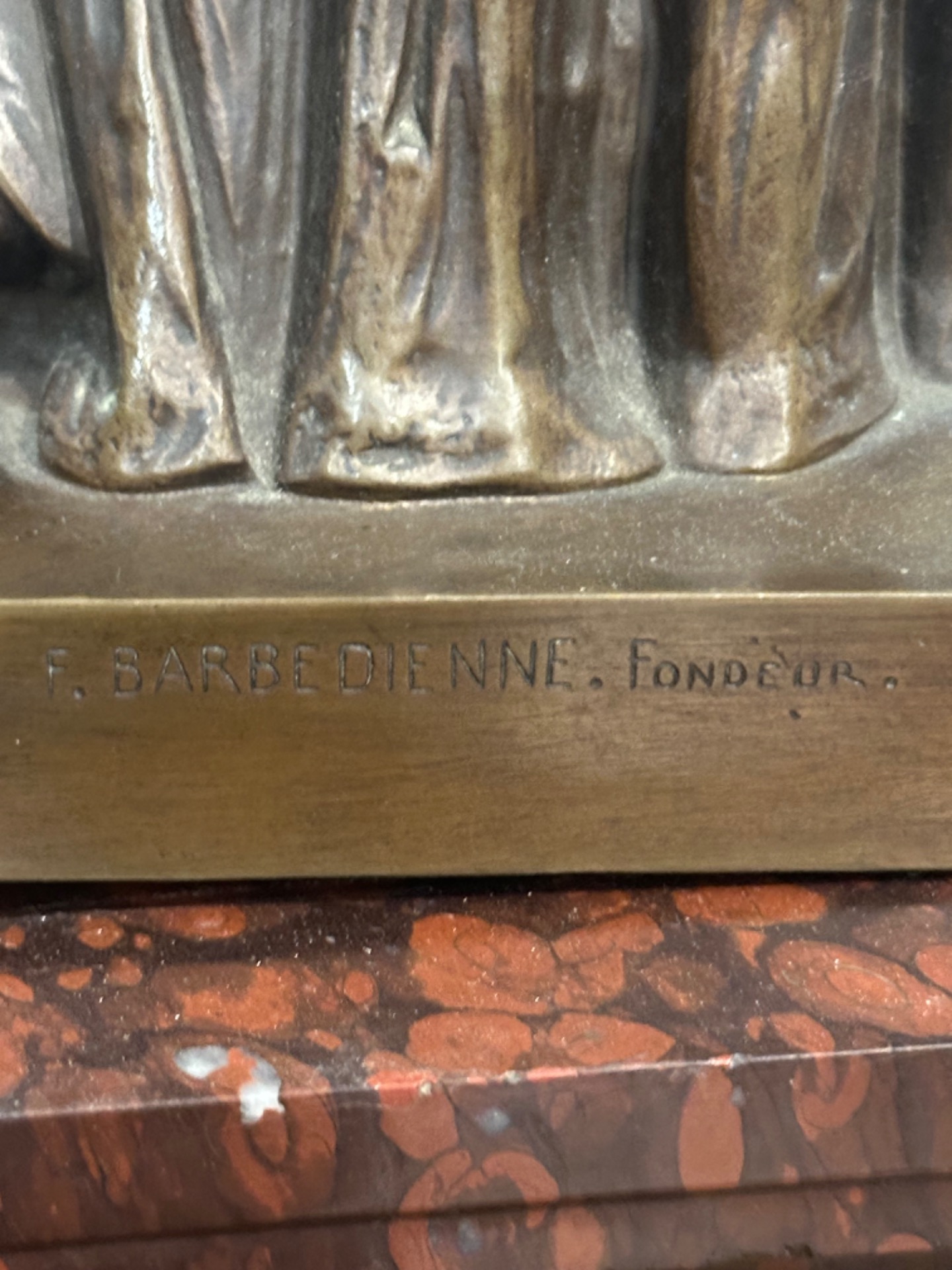 Orologio a pendolo in marmo rosso con bronzo sulla parte superiore raffigurante una vestale . Sia il bronzo che l'orologio sono firmati in ottime condizioni . Misure altezza 60 cm circa largo 35 cm di manifattura francese epoca meta 800