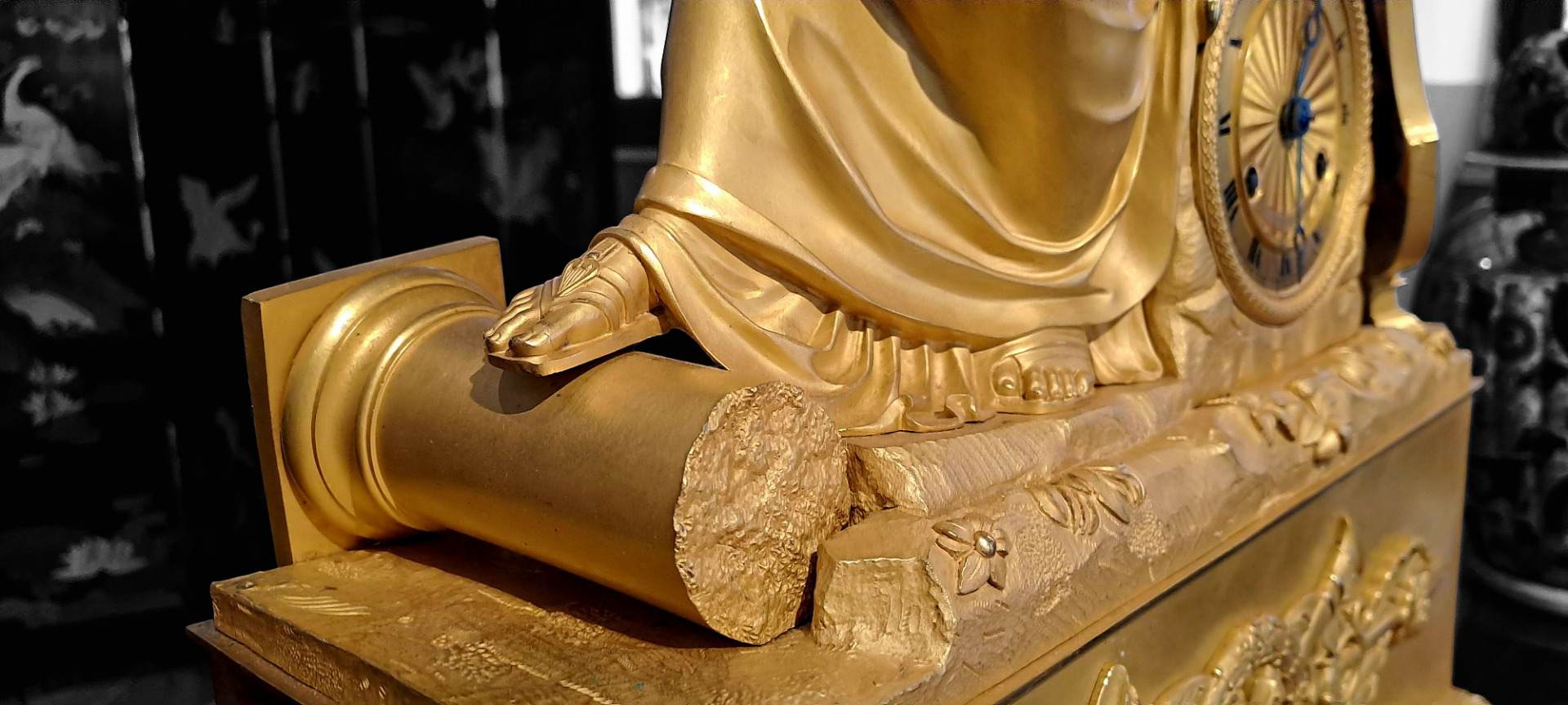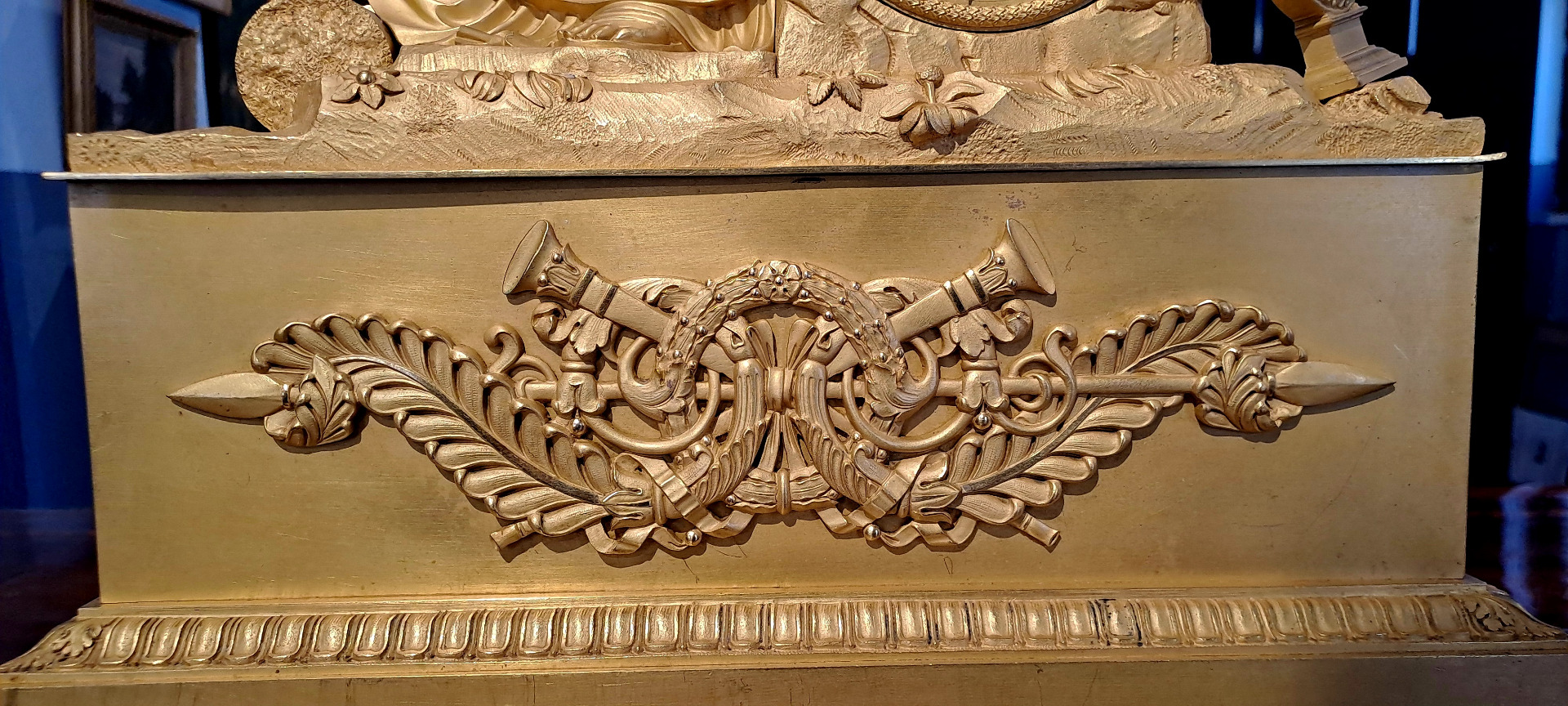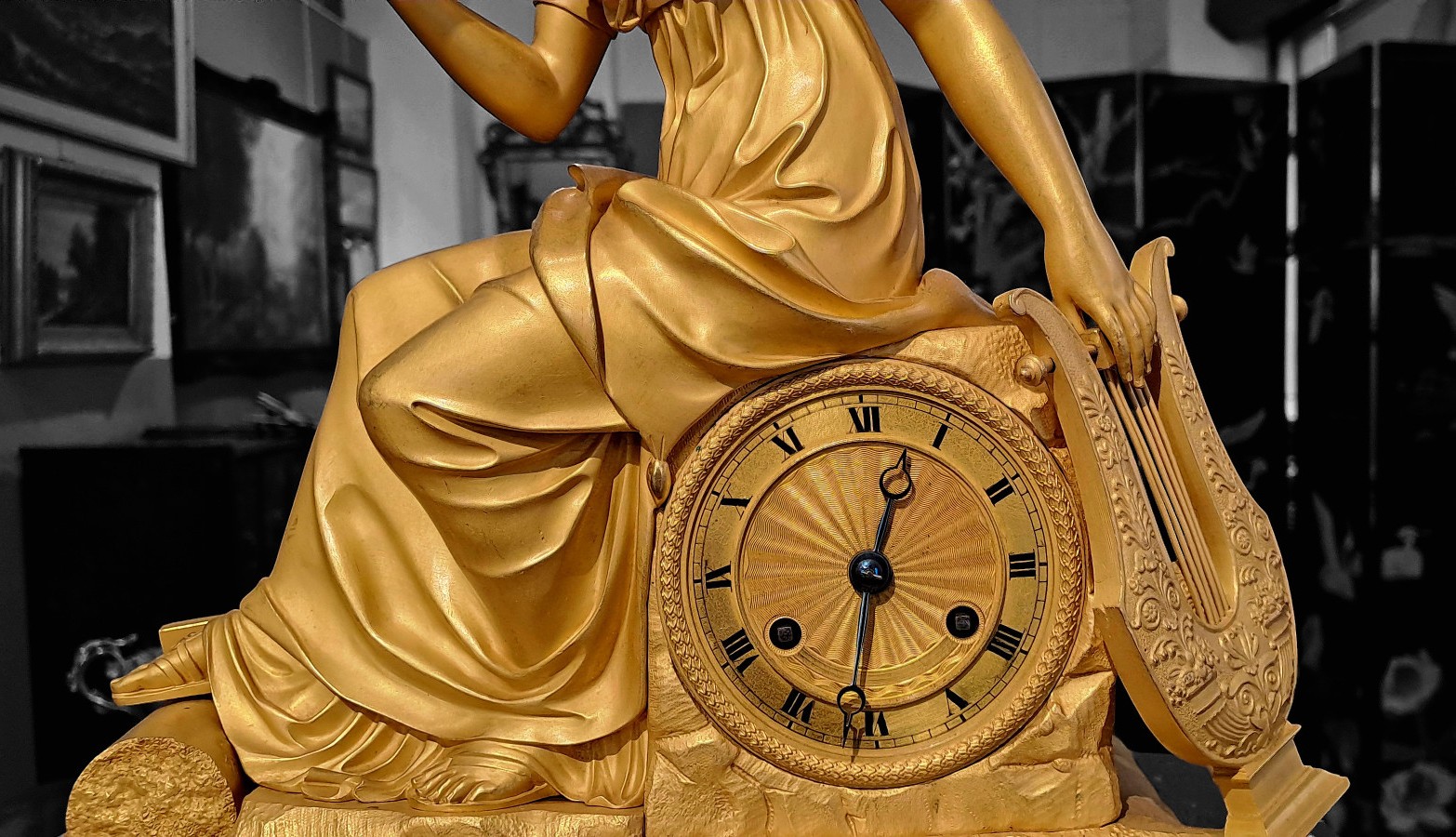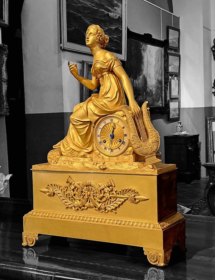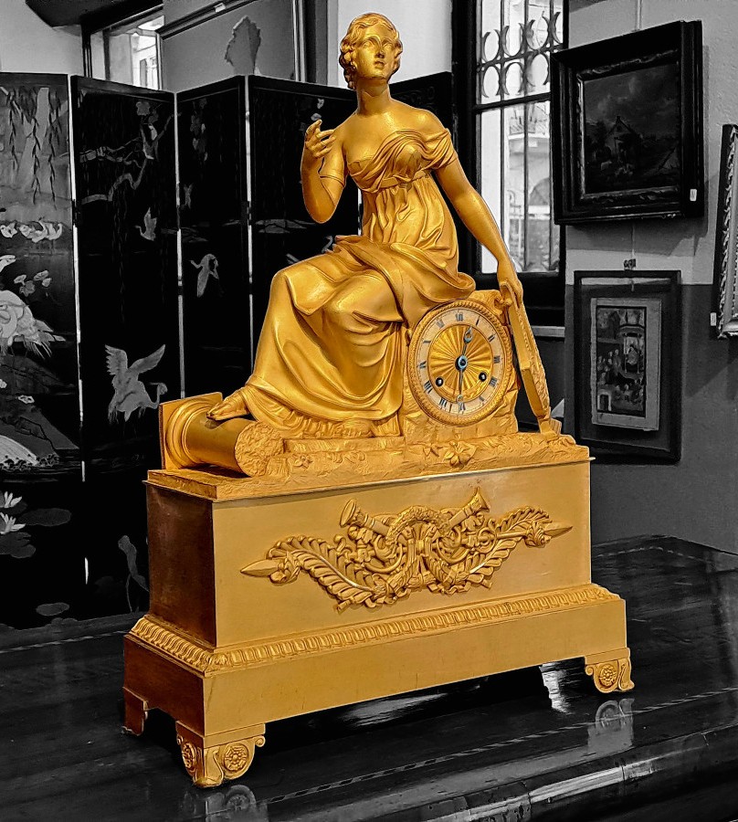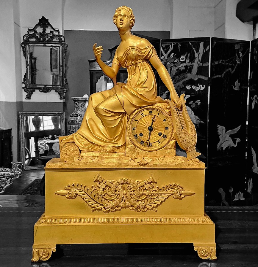 Pendola in bronzo dorato al mercurio raffigurante l’ allegoria della musica.La figura femminile, Erato, musa della lirica e della poesia amorosa, è raffigurata in posizione seduta con un piede posato su di un frammento di colonna romana mentre con la mano sinistra sorregge la lira.