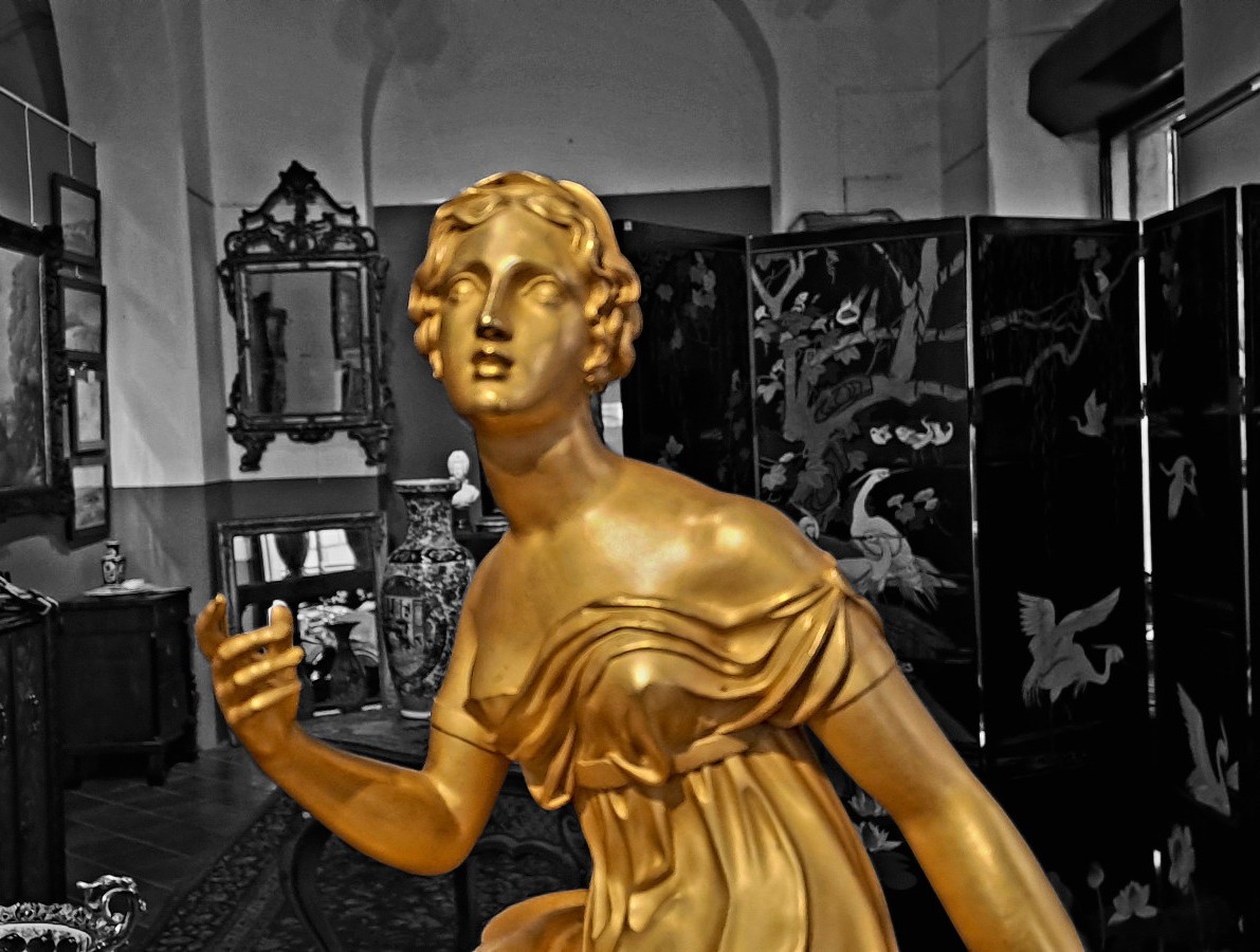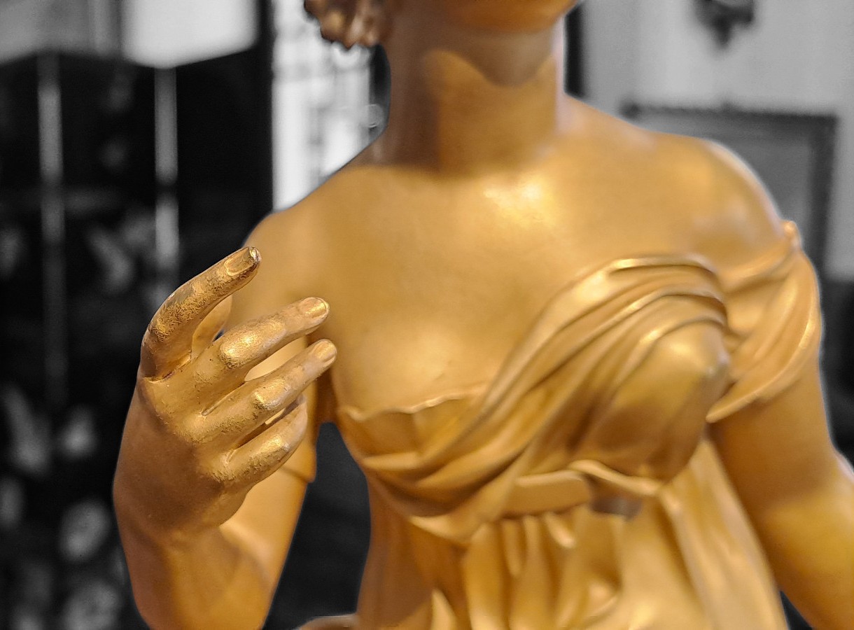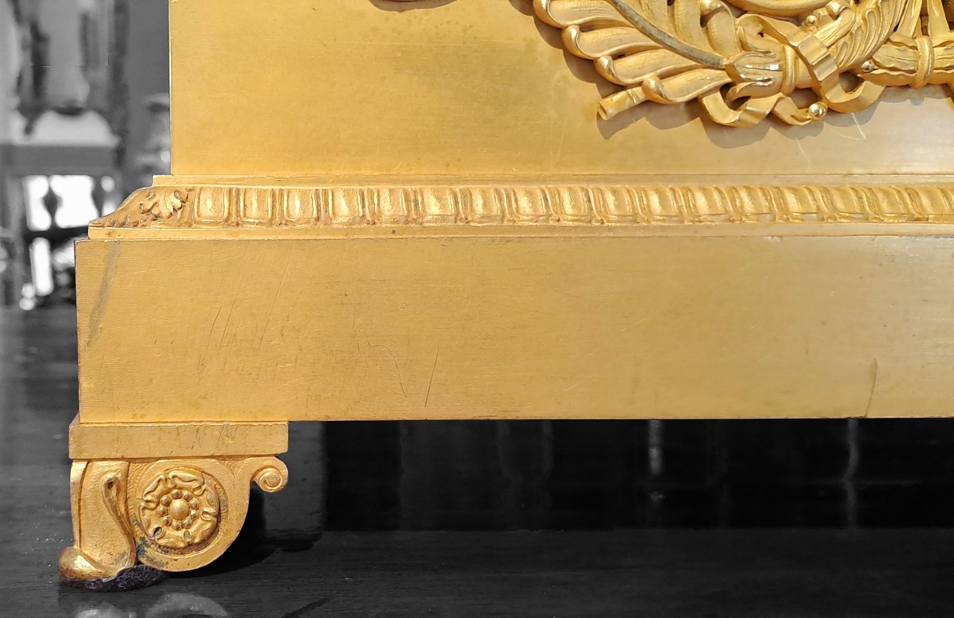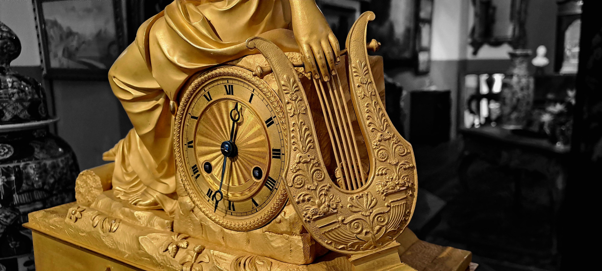 Pendola in bronzo dorato al mercurio raffigurante l’ allegoria della musica.La figura femminile, Erato, musa della lirica e della poesia amorosa, è raffigurata in posizione seduta con un piede posato su di un frammento di colonna romana mentre con la mano sinistra sorregge la lira.
