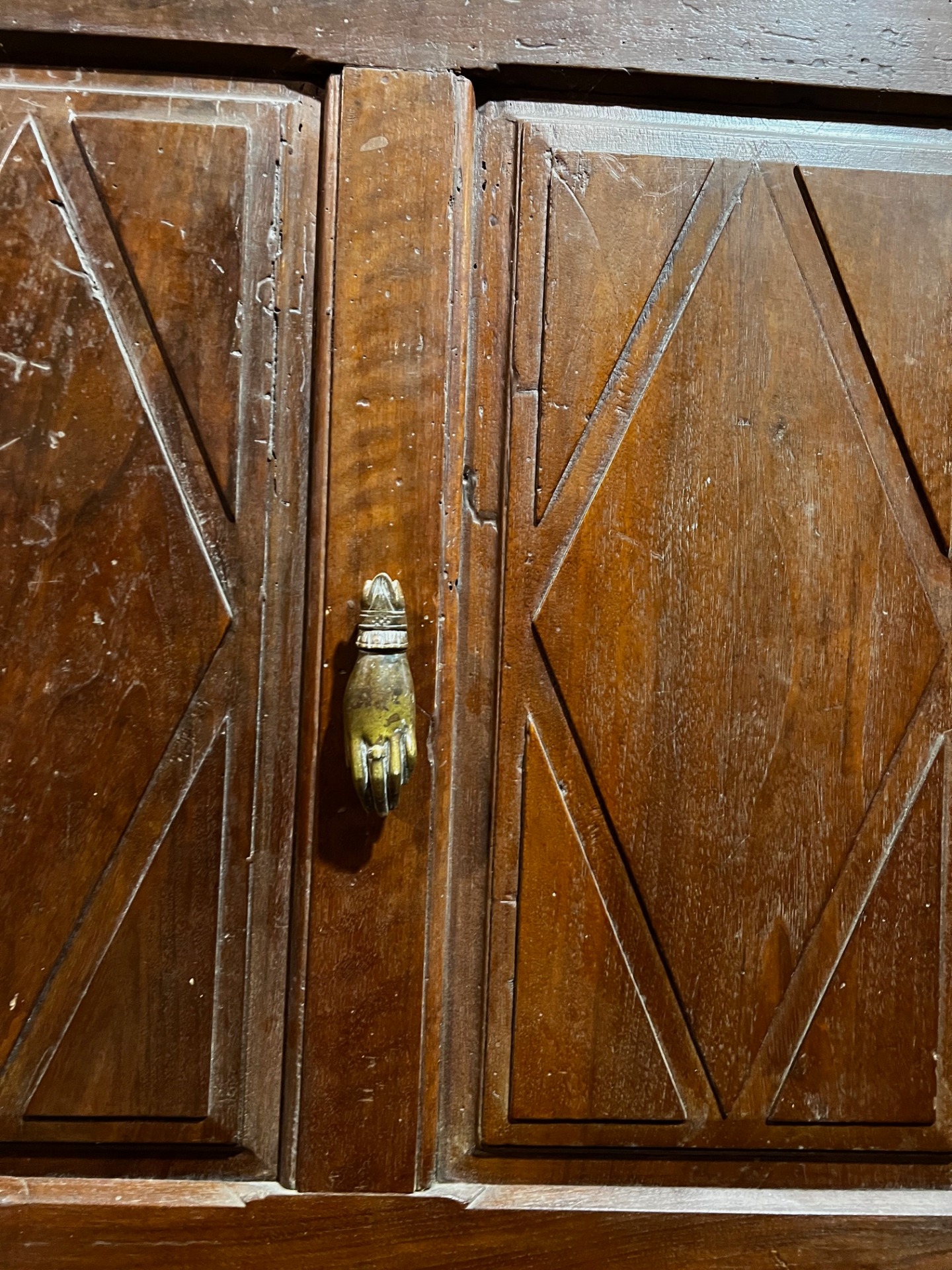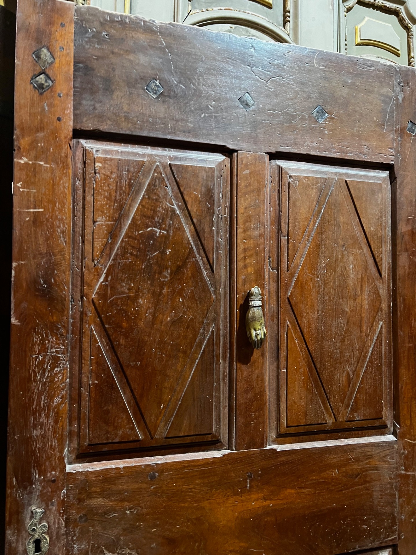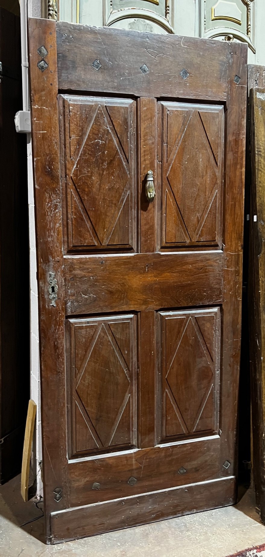 PTCI462 - Portoncino a un battente, in legno di noce, con pannelli scolpiti a losanghe, retro ad assi liscio, restaurato.