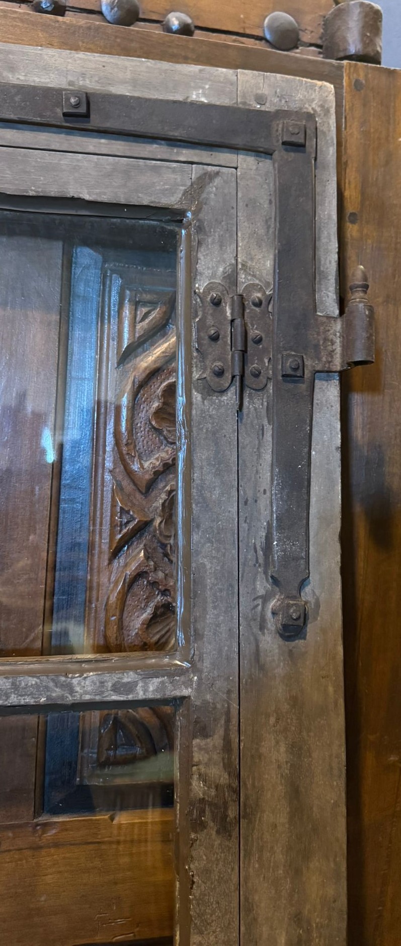 Presenta pannello inferiore intagliato a forma geometrica, parte superiore completa di vetri.