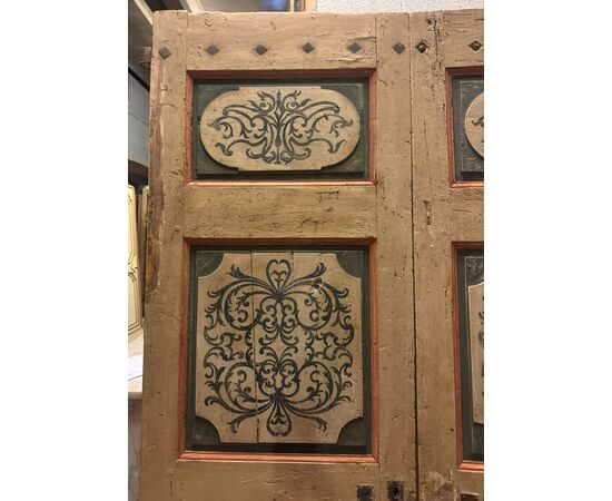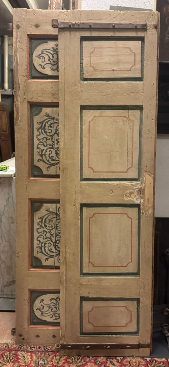 PTL702 - Porta in legno laccato, due battenti con pannelli dipinti. Retro laccato. Apertura a spingere. Epoca '700. Misure cm L 122 x H 217