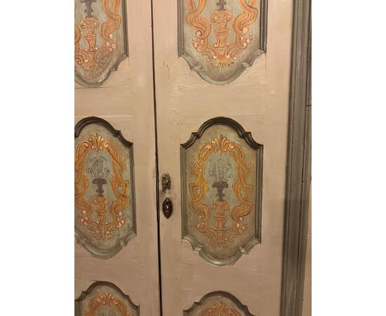 PTS621 - N. 3 porte a due battenti in legno laccato, pannelli scolpiti e dipinti con vasi di fiori, complete di telaio, retro laccato. Apertura a spingere. Epoca seconda metà '700. Misure telaio cm L 118 x H 220, luce cm L 87 x H 202