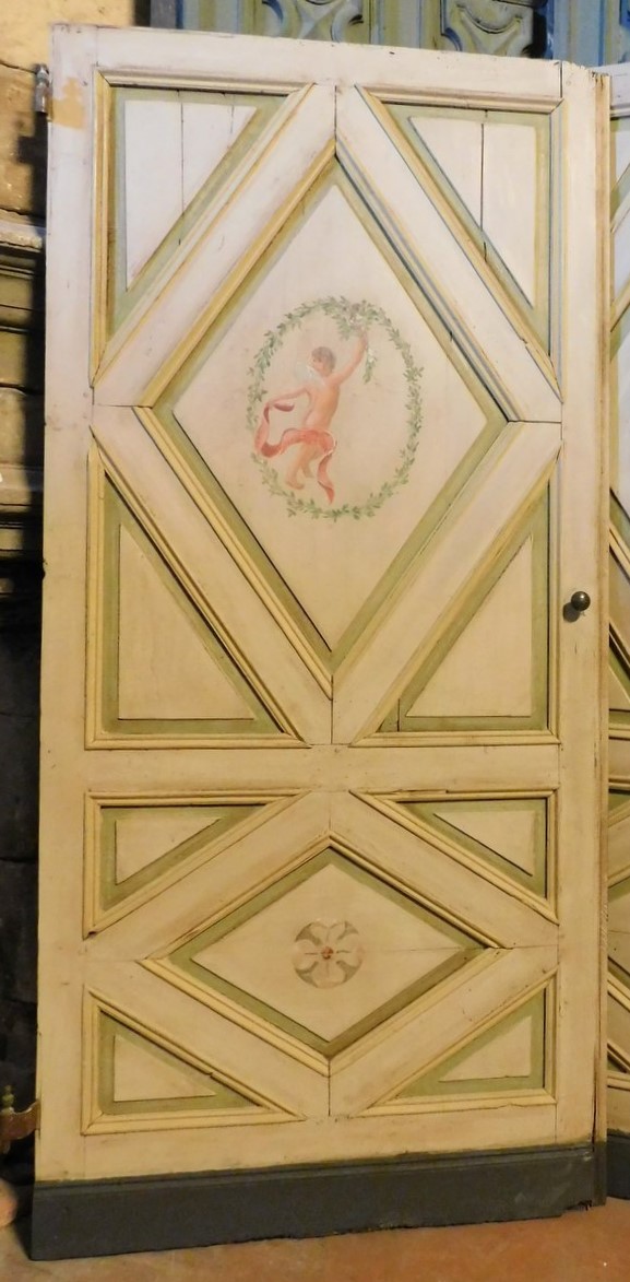 PTS808 - N. 2 porte a un battente in legno laccato, con angioletti danzanti dipinti su pannello superiore e fiore sul pannello inferiore, incorniciati da rombi scolpiti.