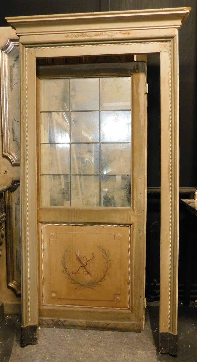 PTS866 - N. 3 Porte a vetri laccate, a un battente con il pannello inferiore dipinto, una con specchio al posto del vetro.