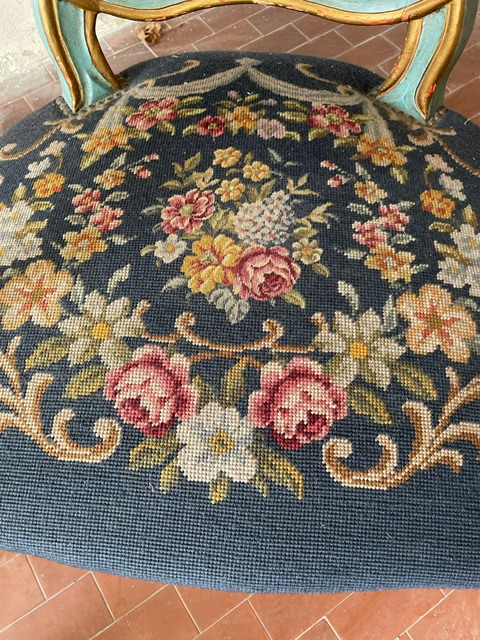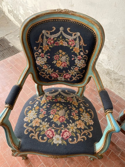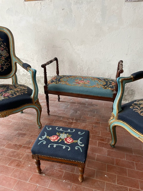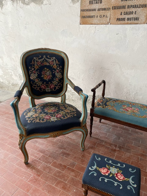 Salottino vintage anni '40, in stile Luigi XV, composto da 2 poltrone, panchetta e pouf poggiapiedi, in ottime condizioni conservative sia di laccatura azzurra e oro, sia di tappezzeria fatta a ricamo floreale blu